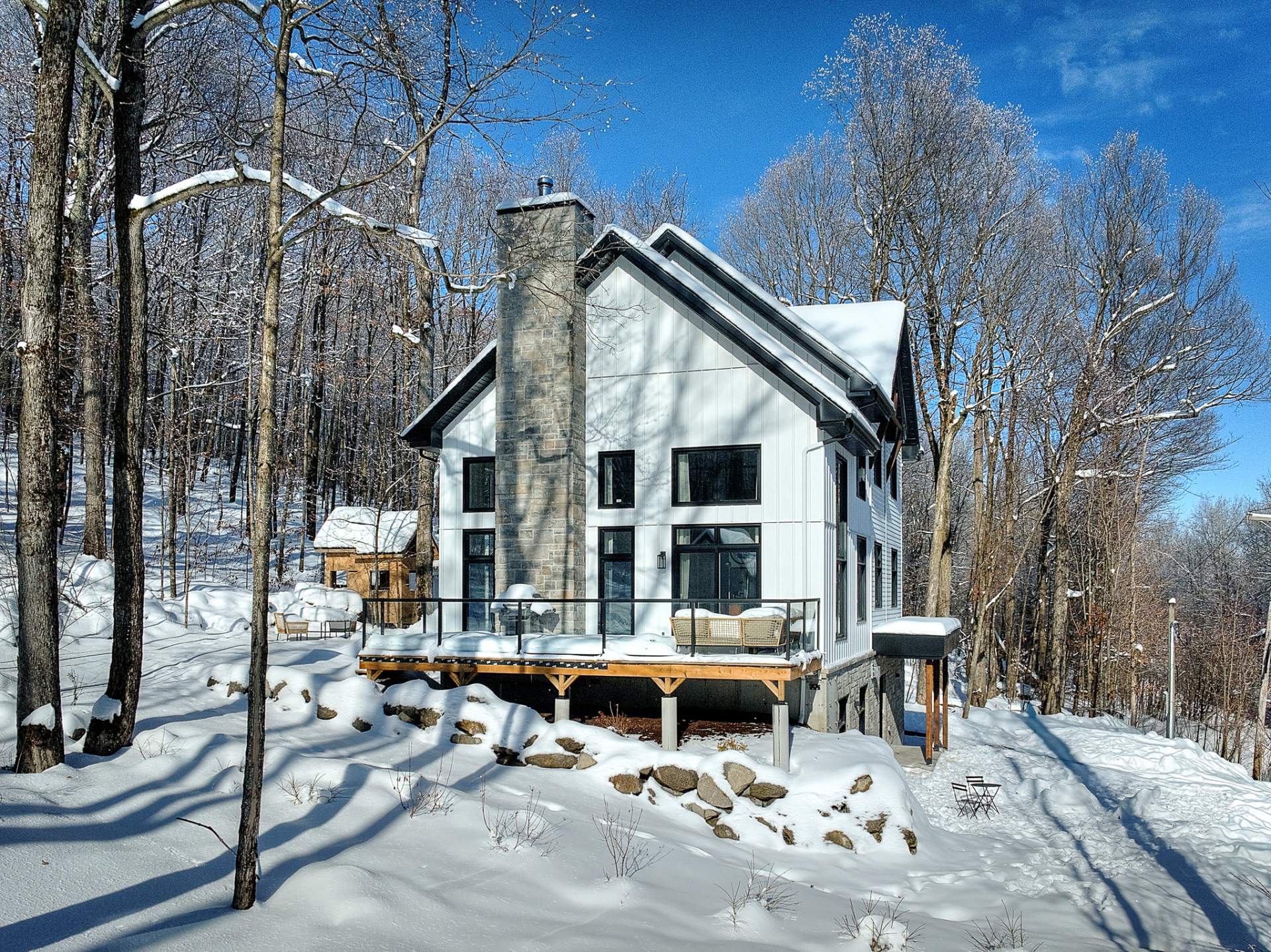 Designed to blend seamlessly with the mountain's contours and rhythm, this residence stands out for its timeless elegance and deep connection to nature. Built in 2024 on a wooded 10,000 sq. ft. lot, it backs onto the C1 trail and lies just 1 km from Ski Bromont's P5 parking area.