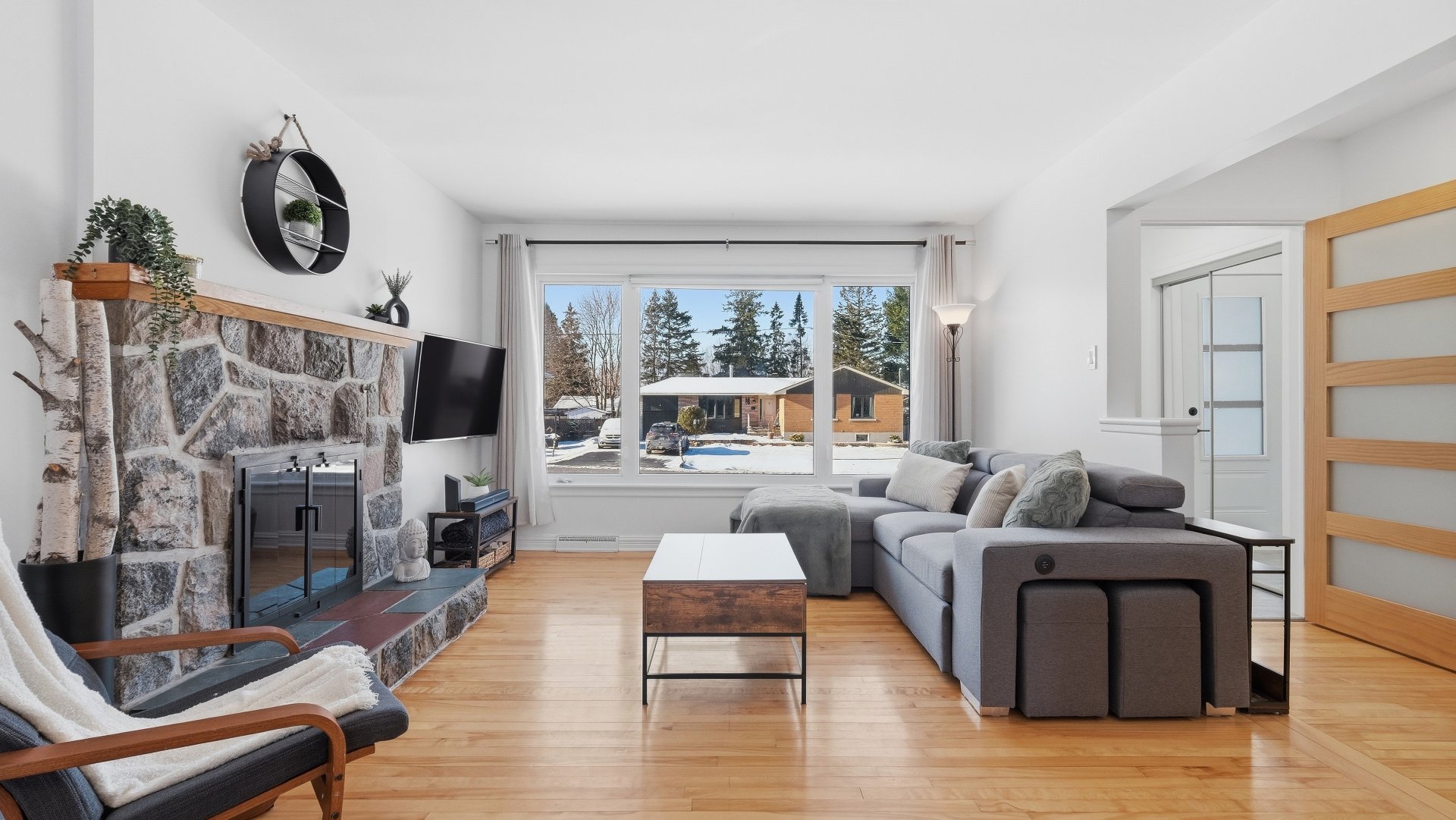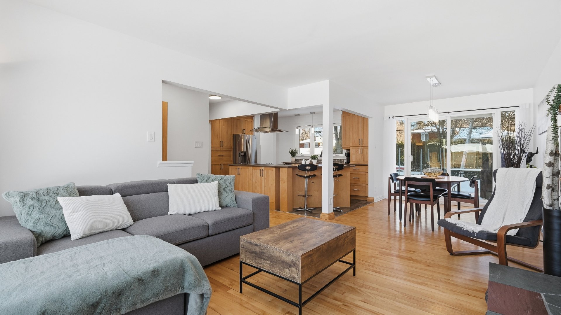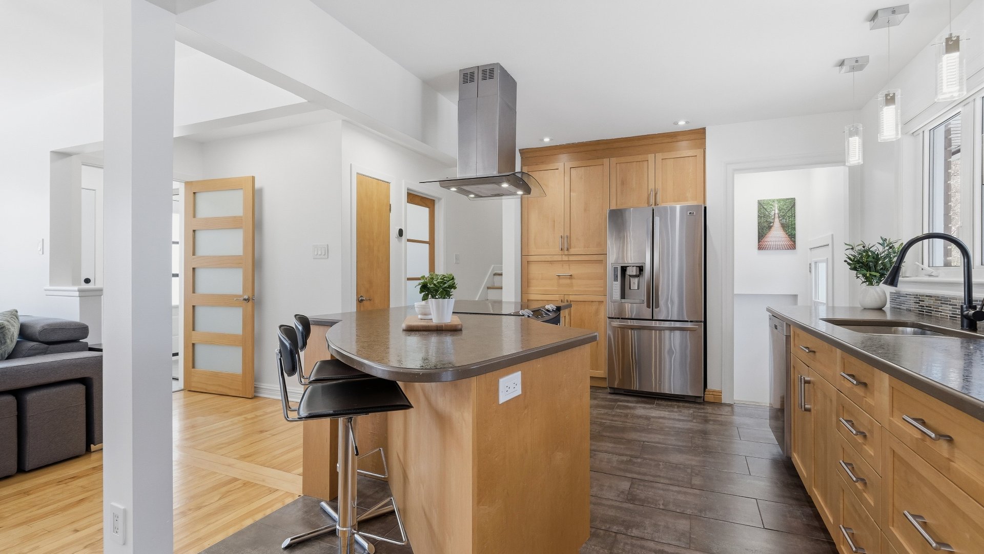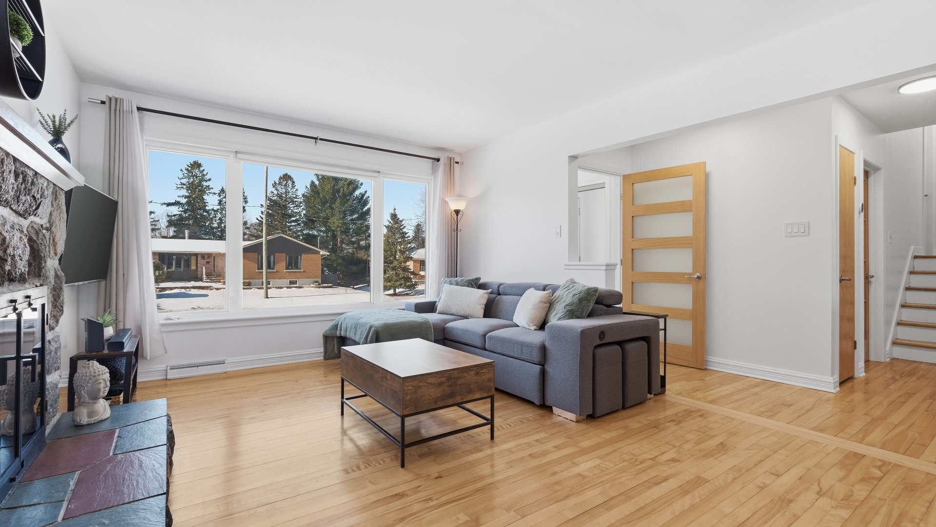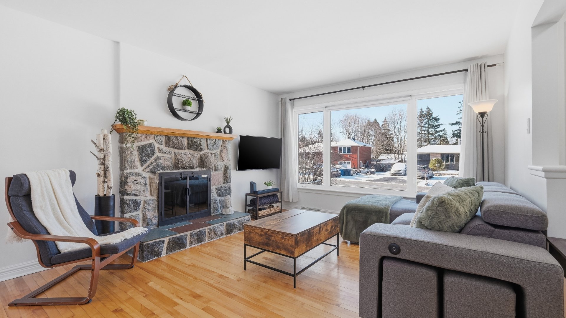 Set on a lot of approximately 9,000 sq. ft., surrounded by mature trees, the property provides privacy and a beautiful view of Mont Saint-Hilaire. Its orientation allows for optimal sunlight throughout the day, creating a bright and welcoming atmosphere.