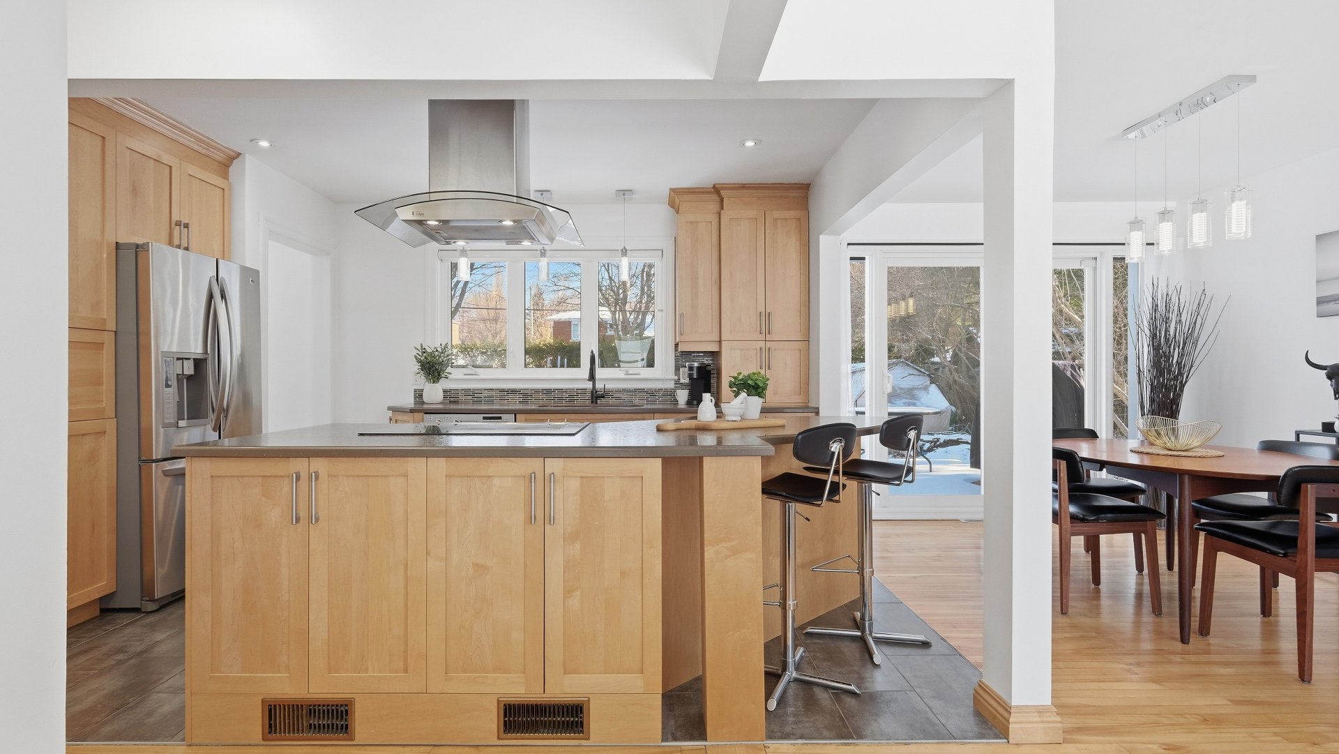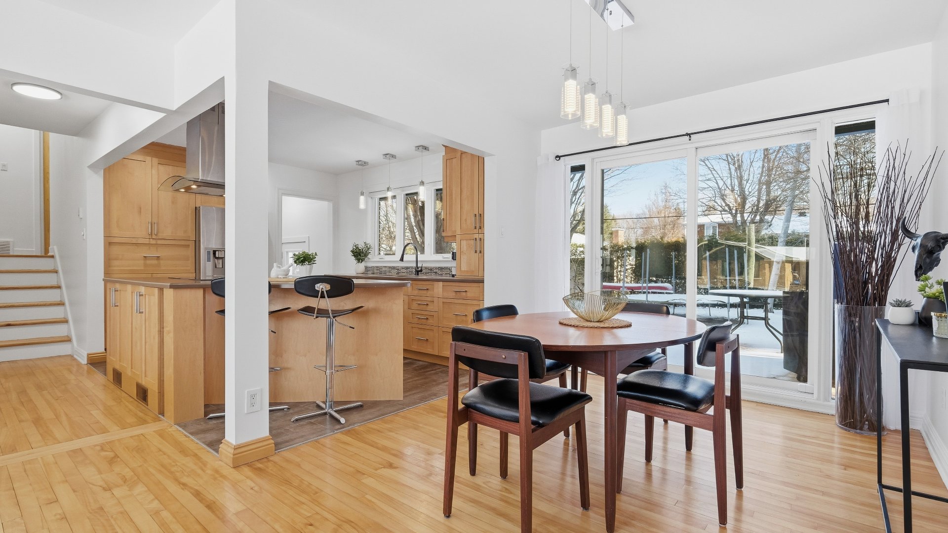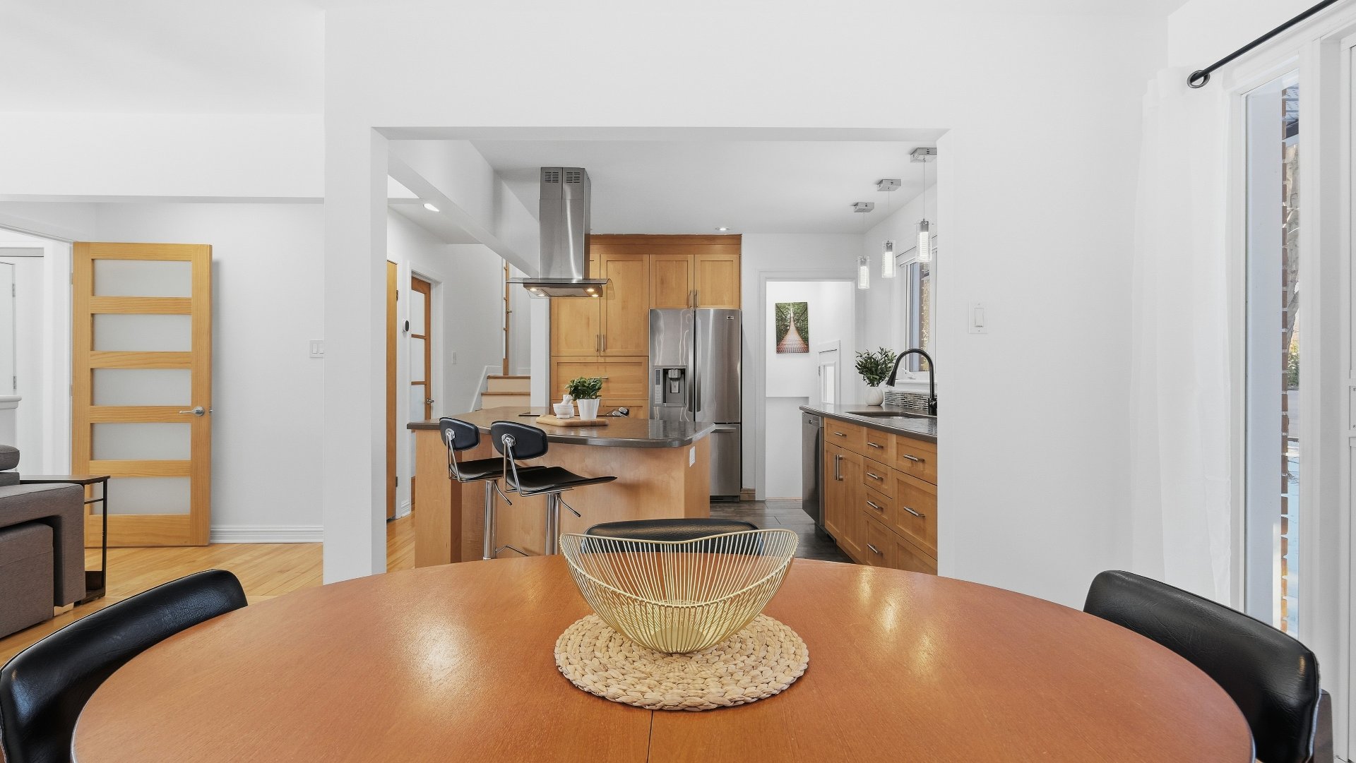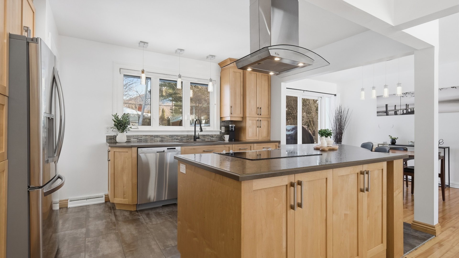 Set on a lot of approximately 9,000 sq. ft., surrounded by mature trees, the property provides privacy and a beautiful view of Mont Saint-Hilaire. Its orientation allows for optimal sunlight throughout the day, creating a bright and welcoming atmosphere.