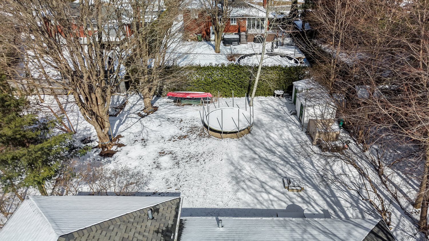 - Washer, dryer, wooden workbench in the workshop, trampoline, BBQ, living room television and wall mount.