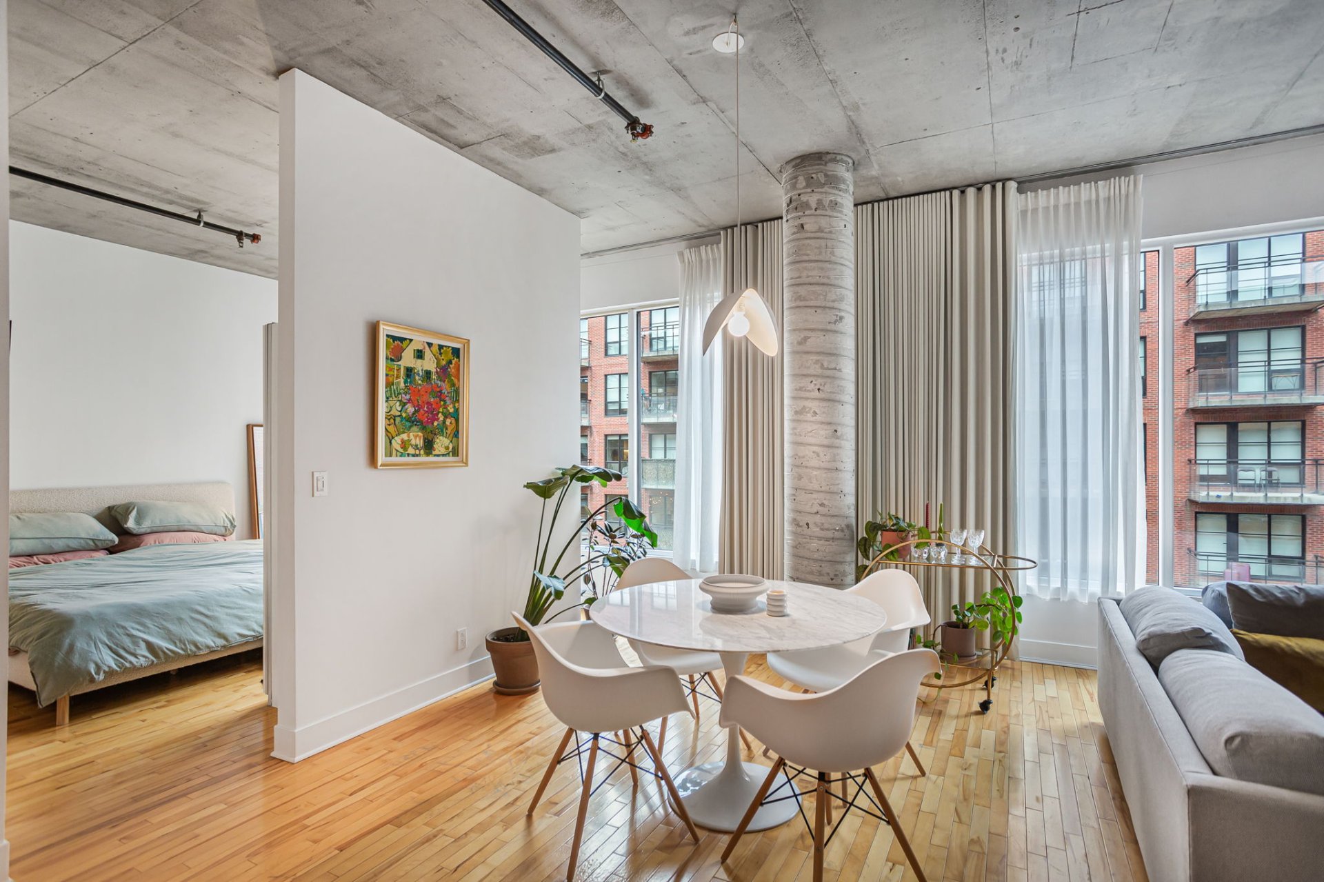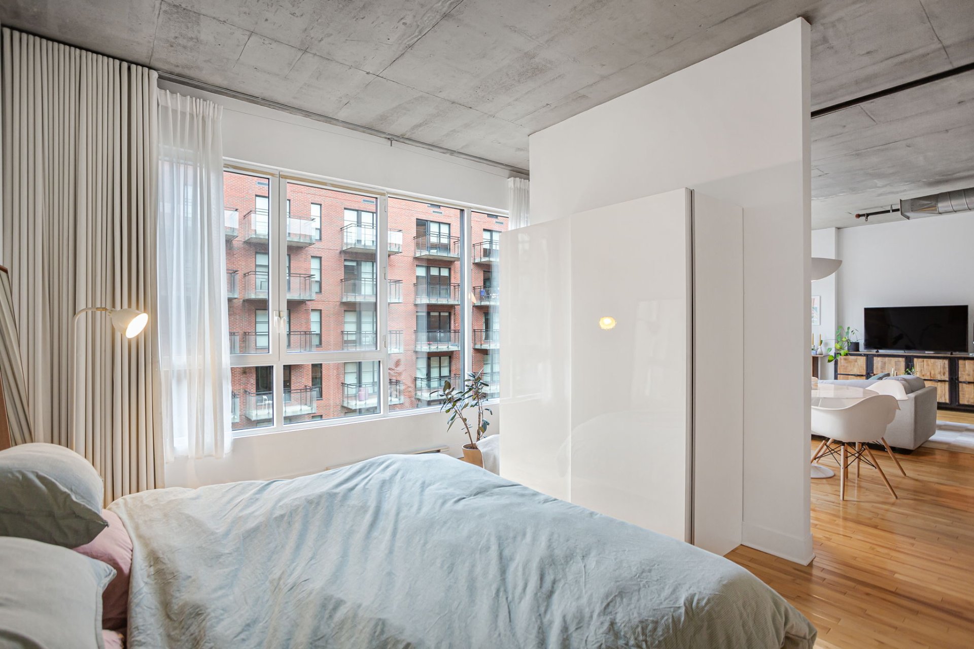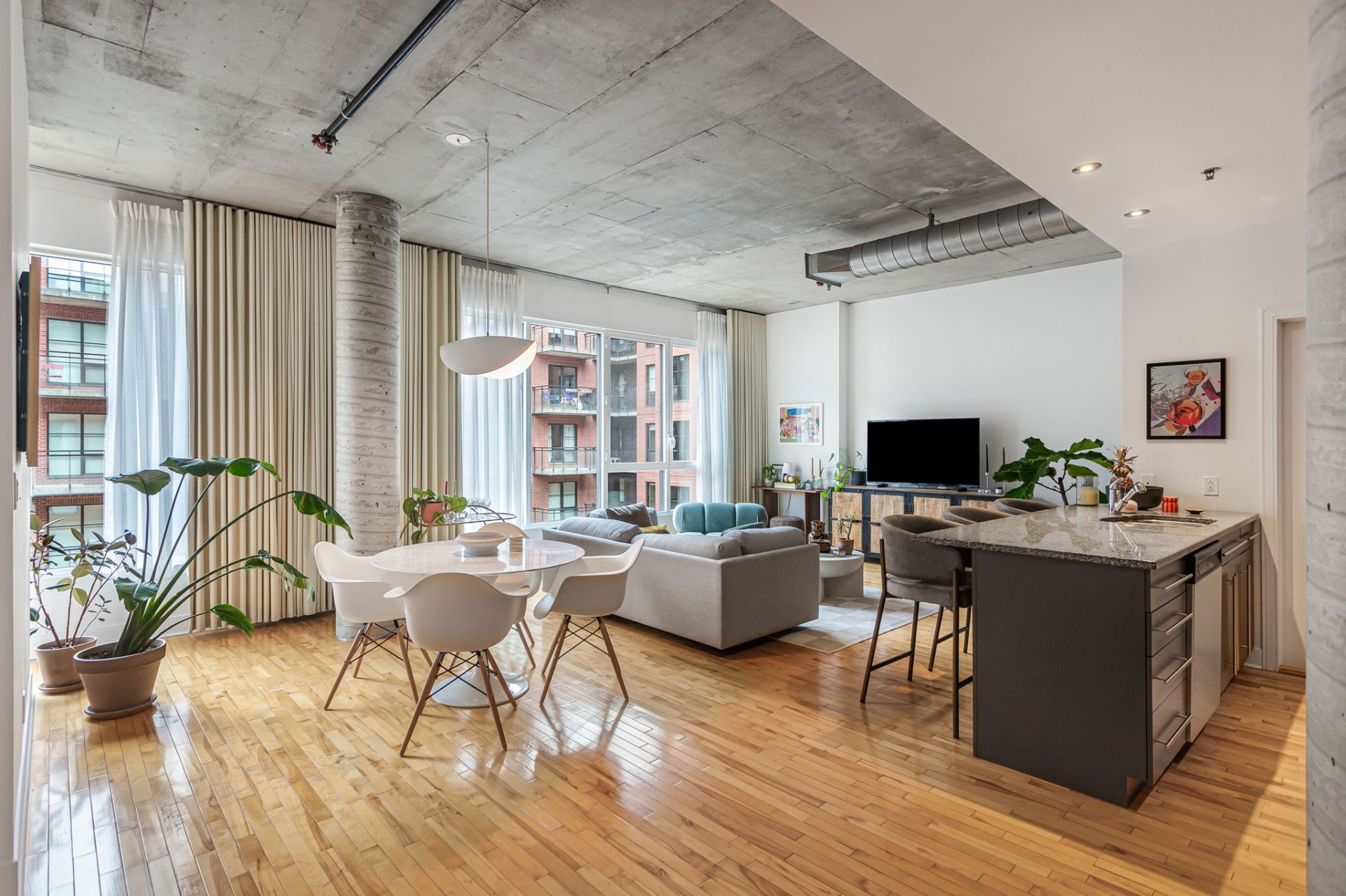 1 indoor parking included. Bright and spacious condo in a AAA location. Open concept, 10 foot ceilings with large bedroom, this beautiful space is a must see. Walking distance from the best the city has to offer. Come live the beauty of this wonderful neighborhood a only steps away from Old Montreal. Monthly fees include central heating, air conditioning and hot water.