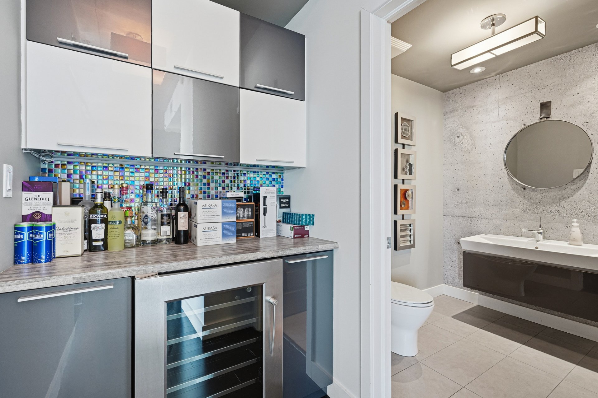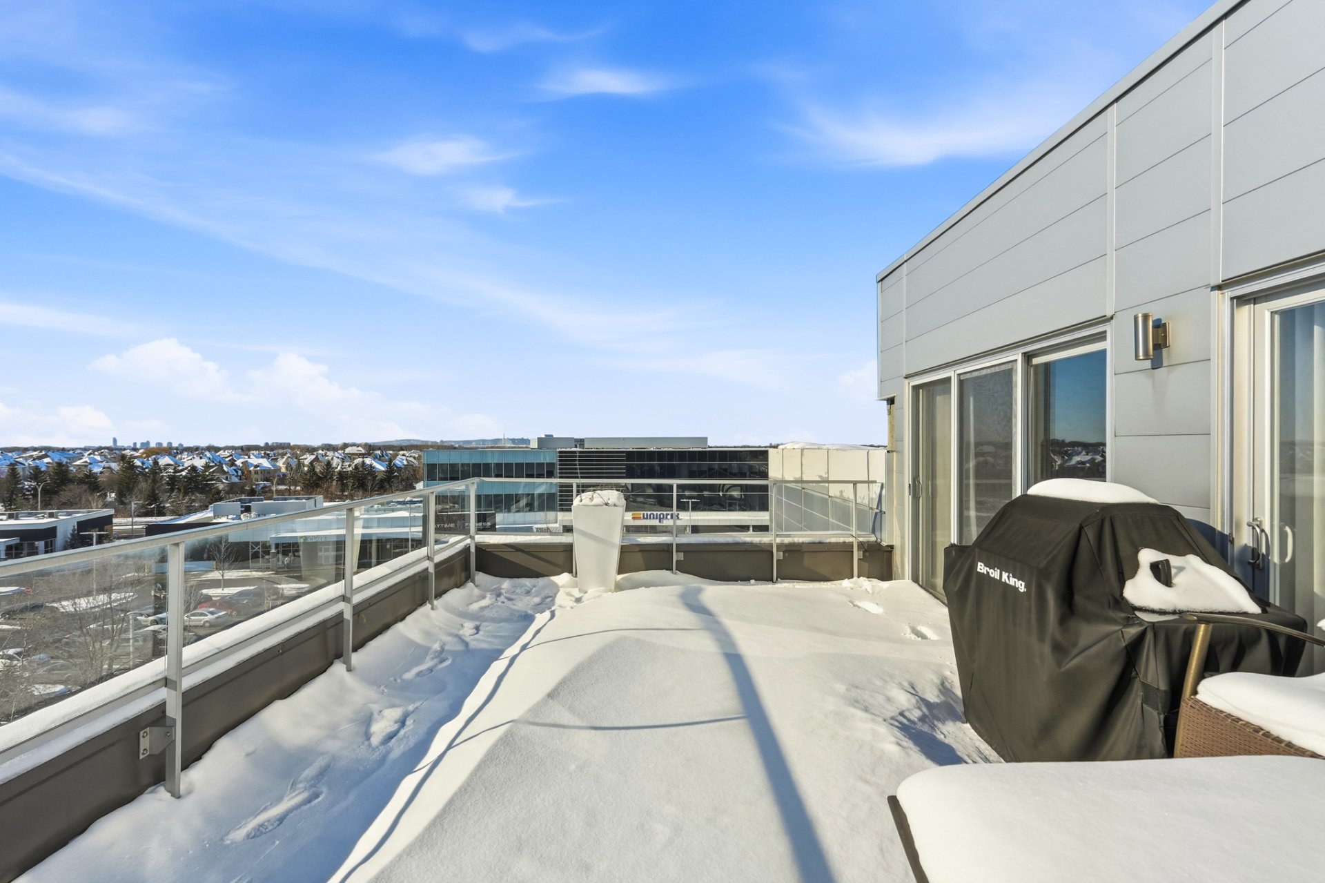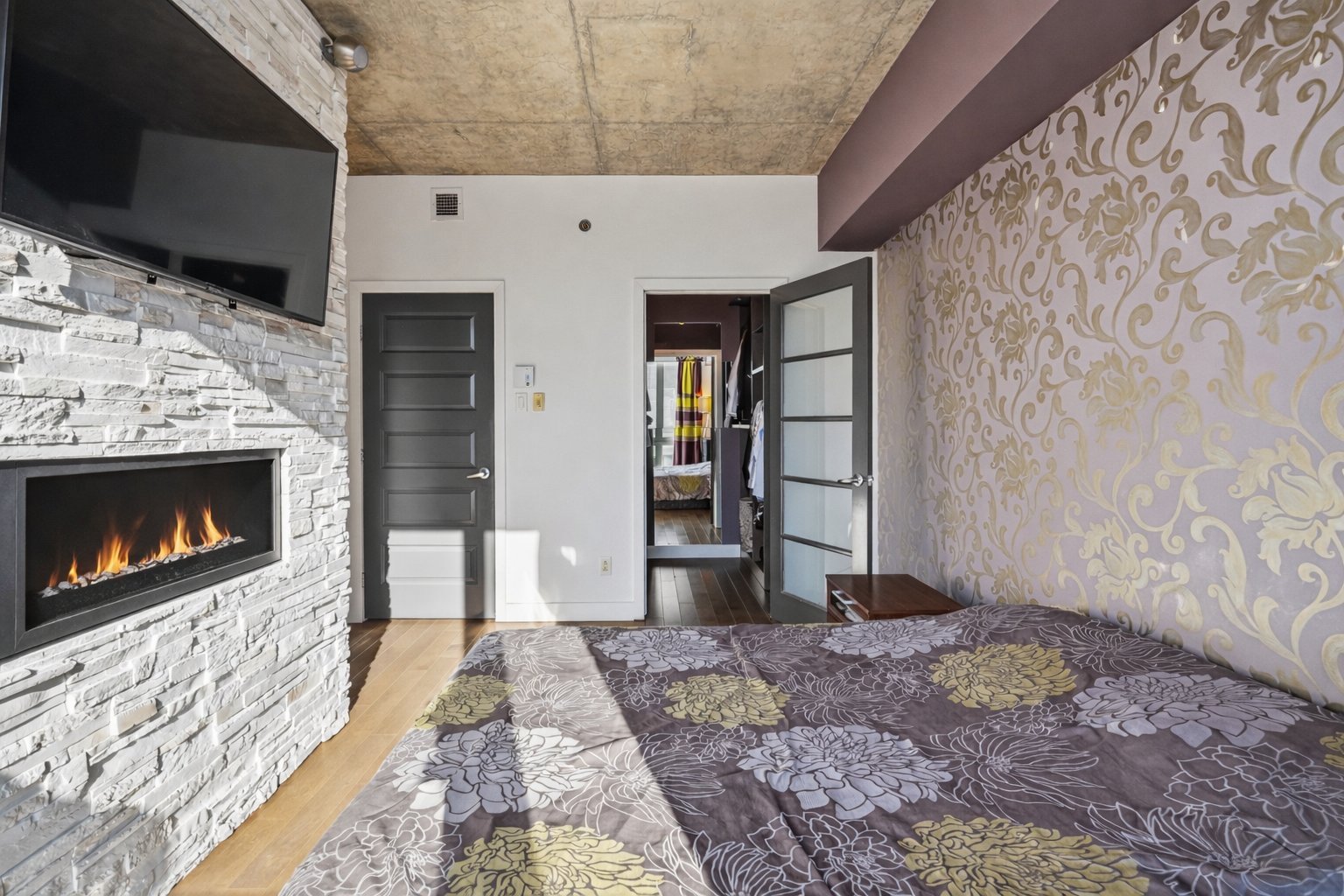 The main living area features generous windows on two sides, a warm and inviting living room with a gas fireplace, and a central, modern open-concept kitchen seamlessly integrated into the space. The kitchen is equipped with quartz countertops and high-end Fisher & Paykel appliances. Two expansive private terraces, located on either side of the unit, offer optimal sun exposure throughout the day and breathtaking views of Montréal, the downtown skyline, the mountains and stunning sunsets.