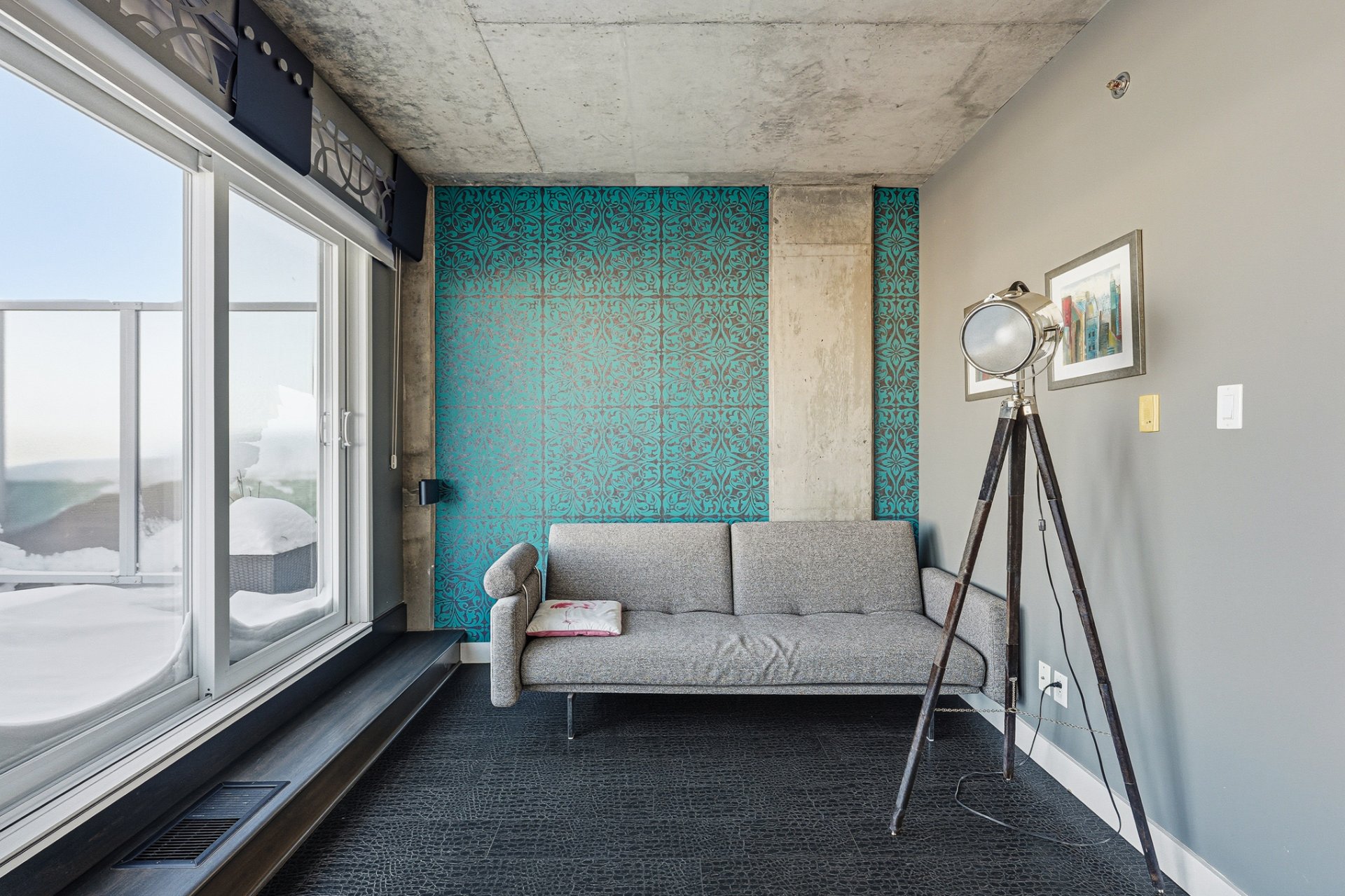 Magnificent two-level penthouse offering 1,368 sq.ft. of living space, sold fully furnished and providing a lifestyle that is both spectacular and functional. From the moment you enter, the sense of space, abundant natural light and open views set the tone. Nine-foot ceilings with exposed concrete finishes, combined with hardwood floors, create a refined and contemporary atmosphere.