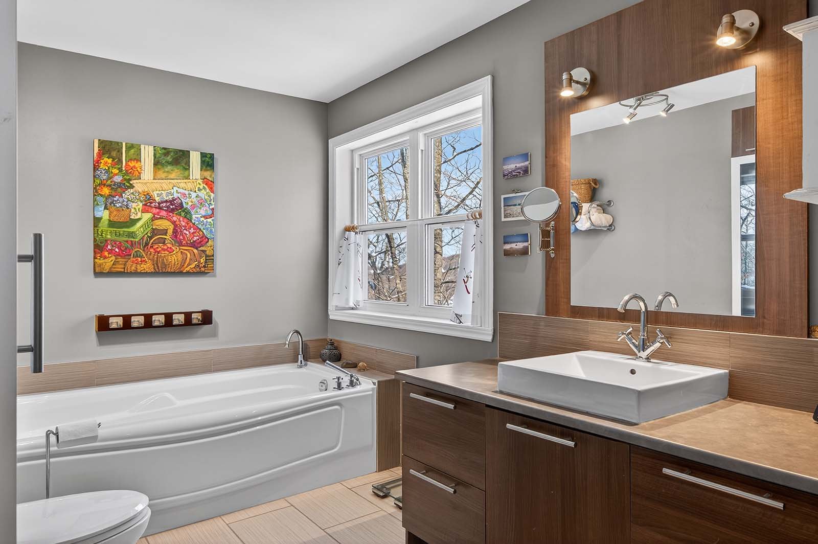 Incredible mountain home! This unique multi-level layout offers breathtaking 180-degree views of the mountains, including Mont-Tremblant. Ideally located just 10 minutes from Saint-Jovite, 20 minutes from the Mont-Tremblant resort, and 10 minutes from Mont-Blanc, it is situated on a dead-end street, ensuring tranquility and serenity. It also features essential qualities for fully enjoying life, such as a double garage with storage attic, a spacious patio perfect for entertaining loved ones, a spa to extend your relaxation in the evenings, and notary access to Lake Long.