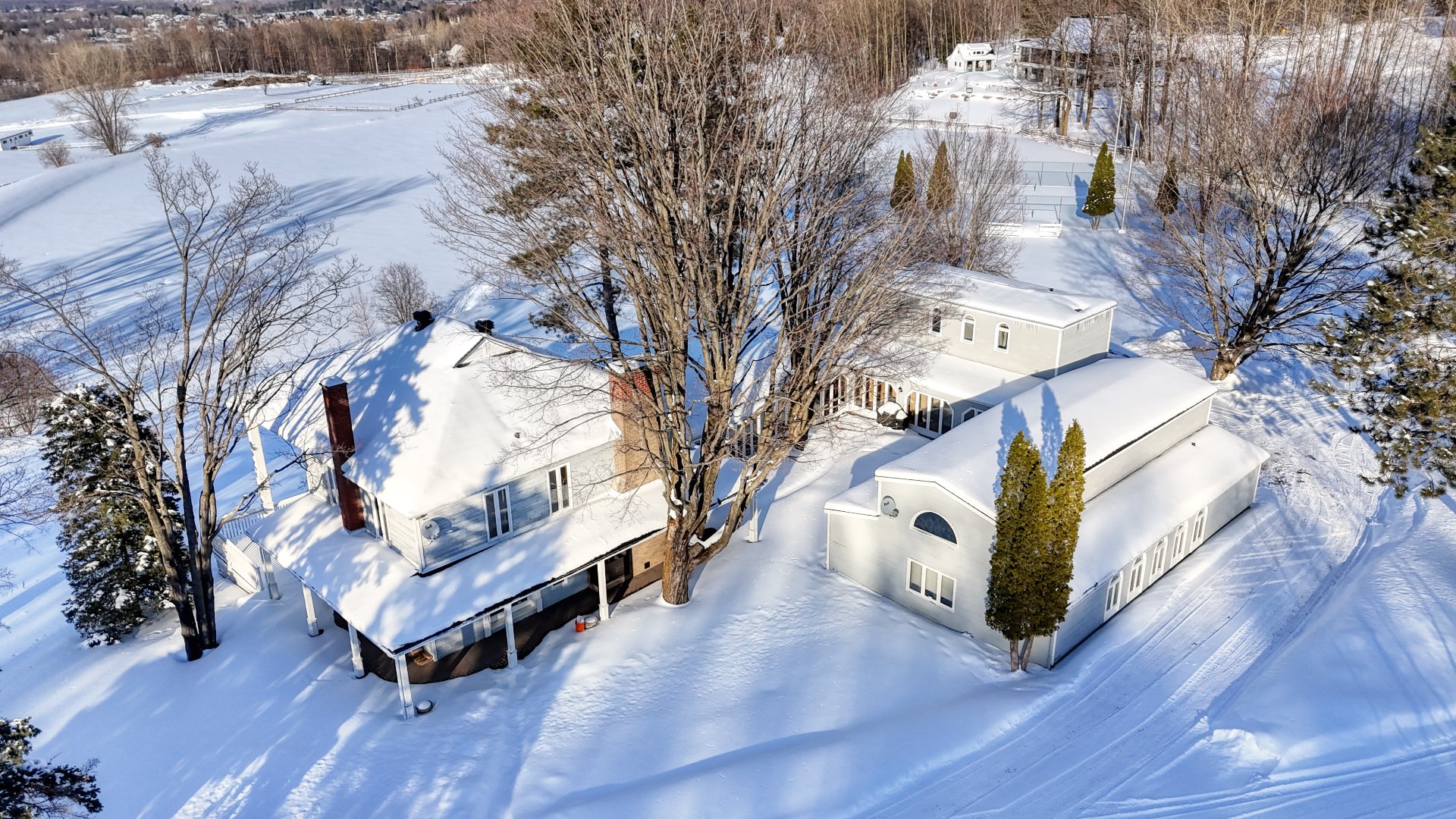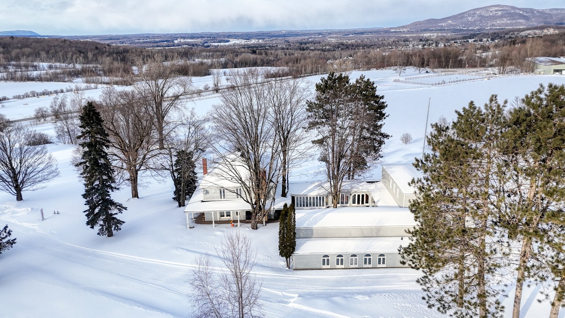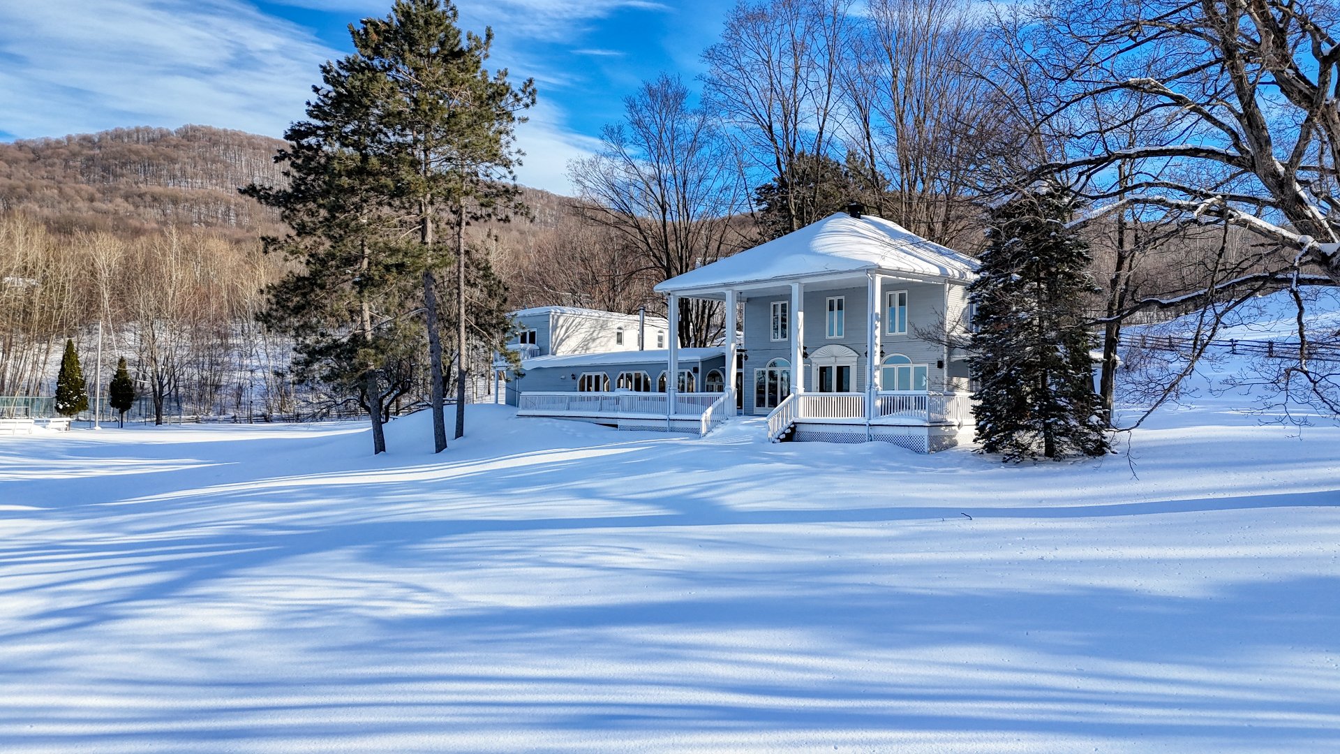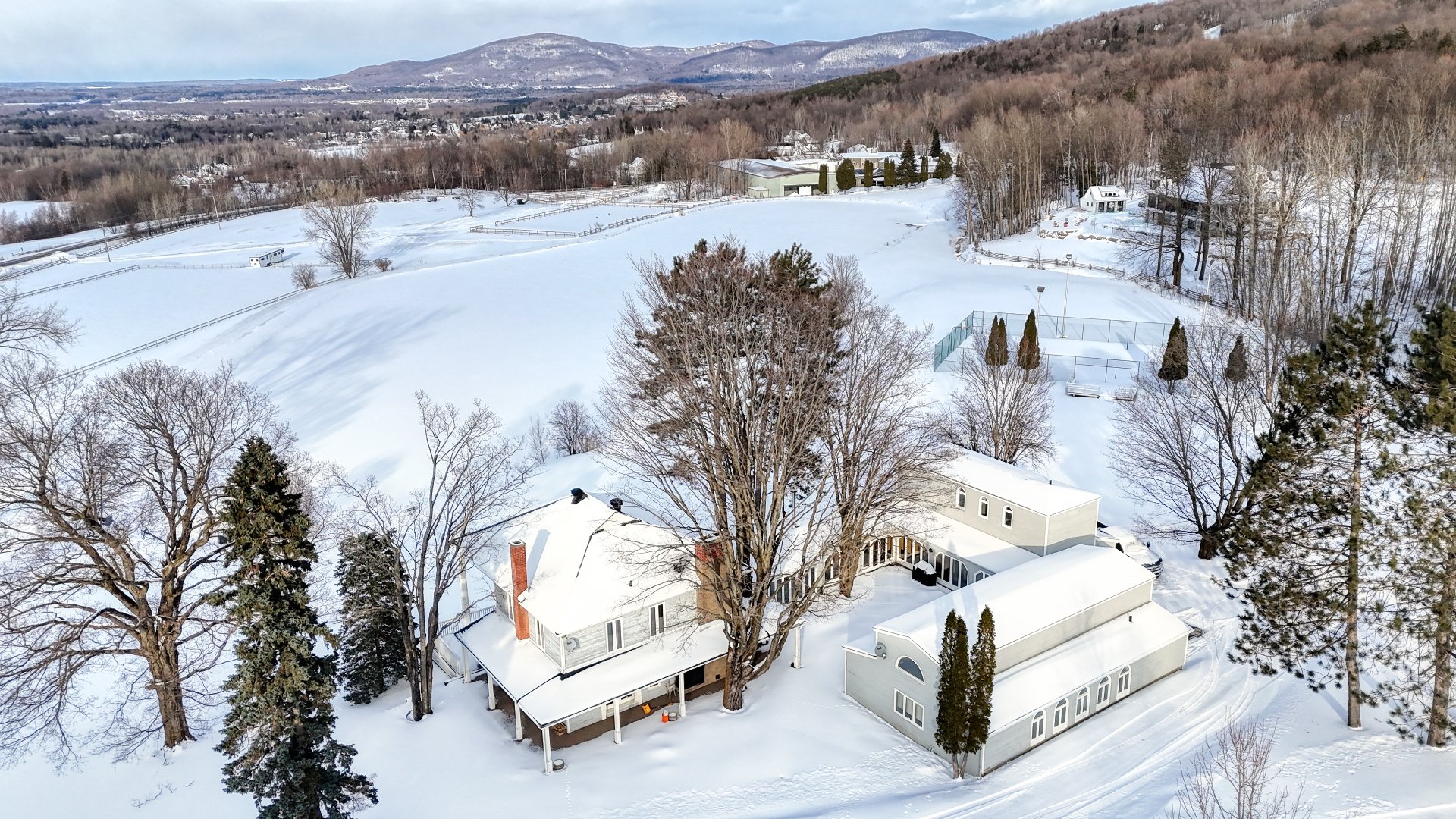 Nestled on a spectacular 14-acre property, this exceptional estate captivates with its panoramic views of the mountains and valleys, as well as a private lake, all within a sought-after equestrian setting. The spacious New England-style residence offers five bedrooms, expansive light-filled living areas, and relaxation spaces including a spa, sauna, and exercise room. An interior courtyard provides the perfect setting for memorable gatherings. An outdoor tennis court, garage/storage unit, and abundant natural surroundings complete this unique retreat, conveniently located near virtually all the attractions of Bromont and the surrounding regio