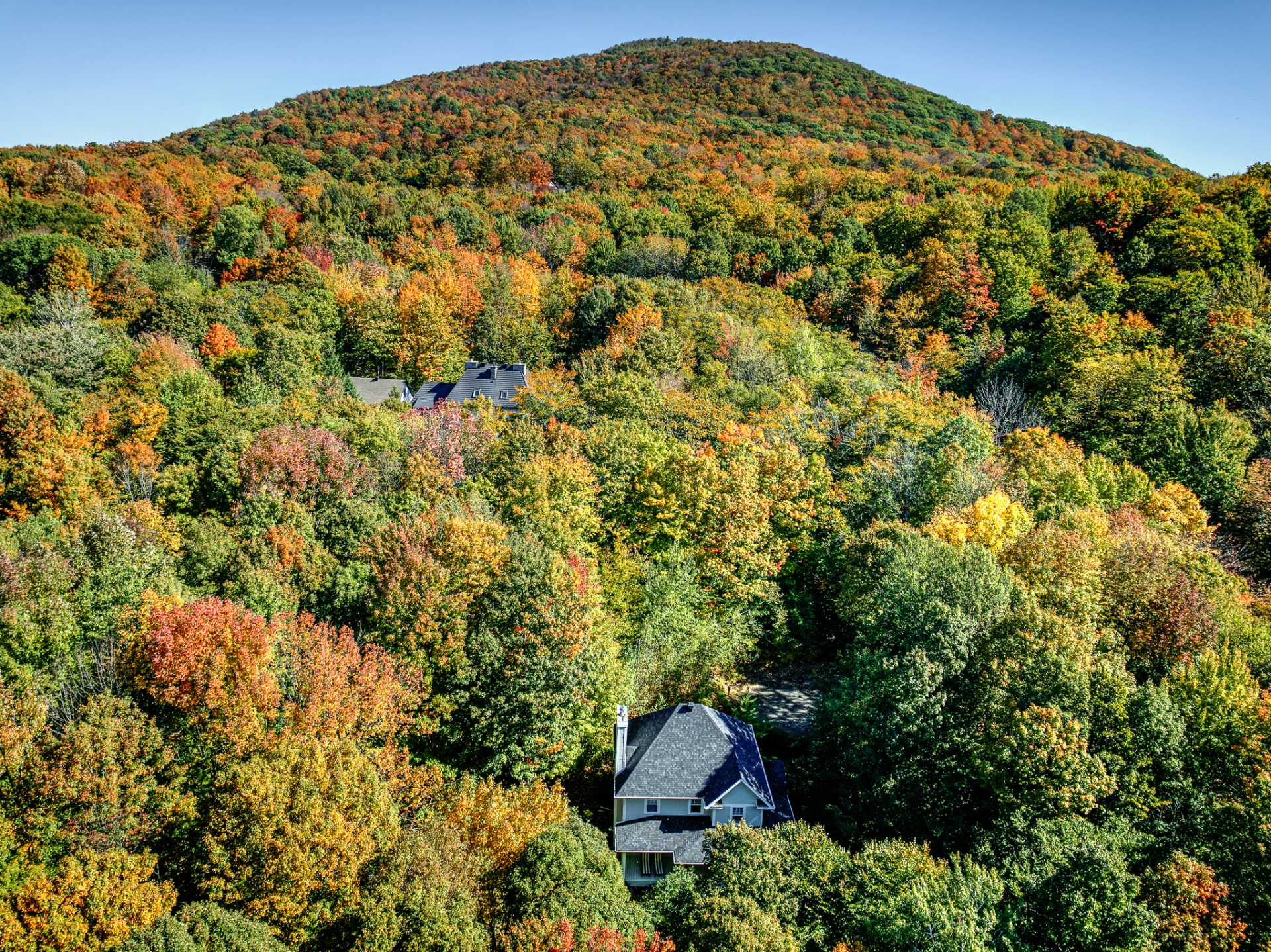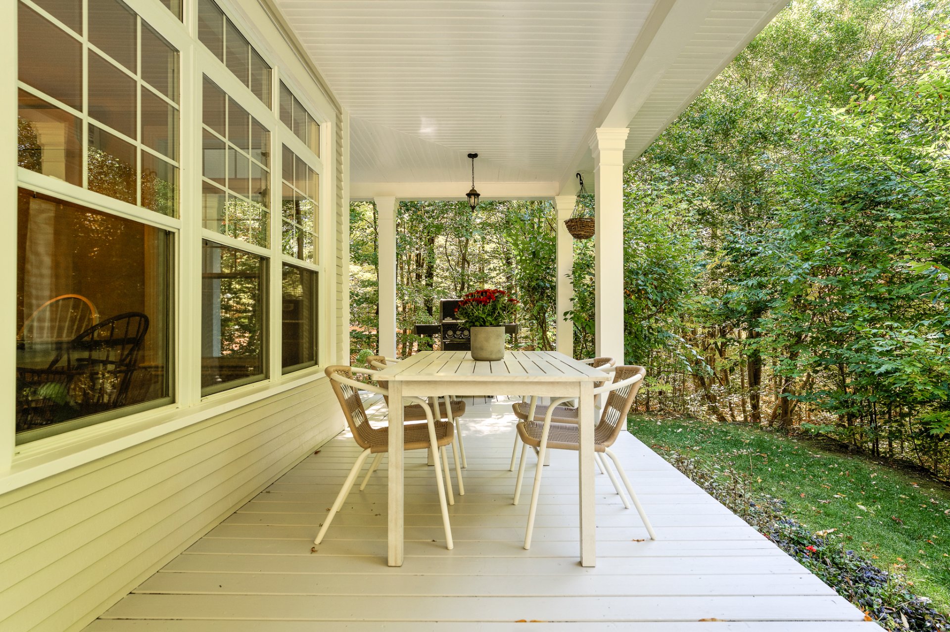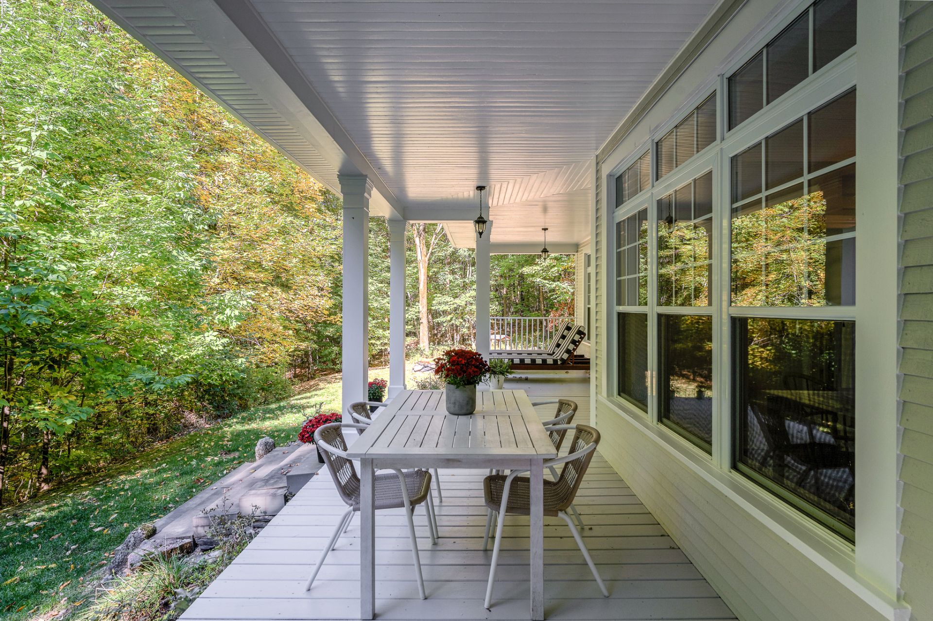 Outdoor living continues with a covered terrace with designated areas for dining and relaxation. Nature is ever-present here, with a large, private woodland bordering the C1 hiking trail, offering daily tranquility.