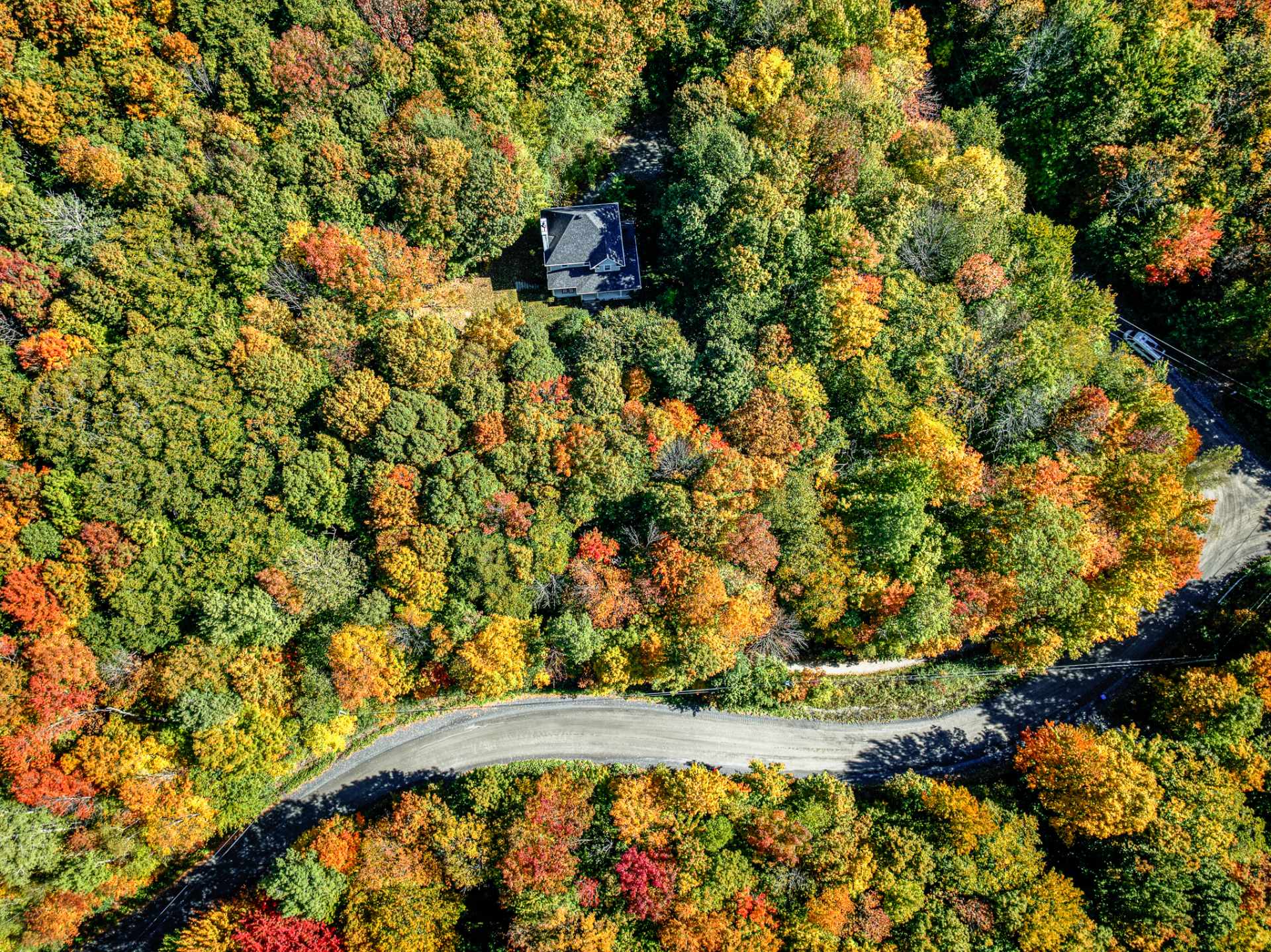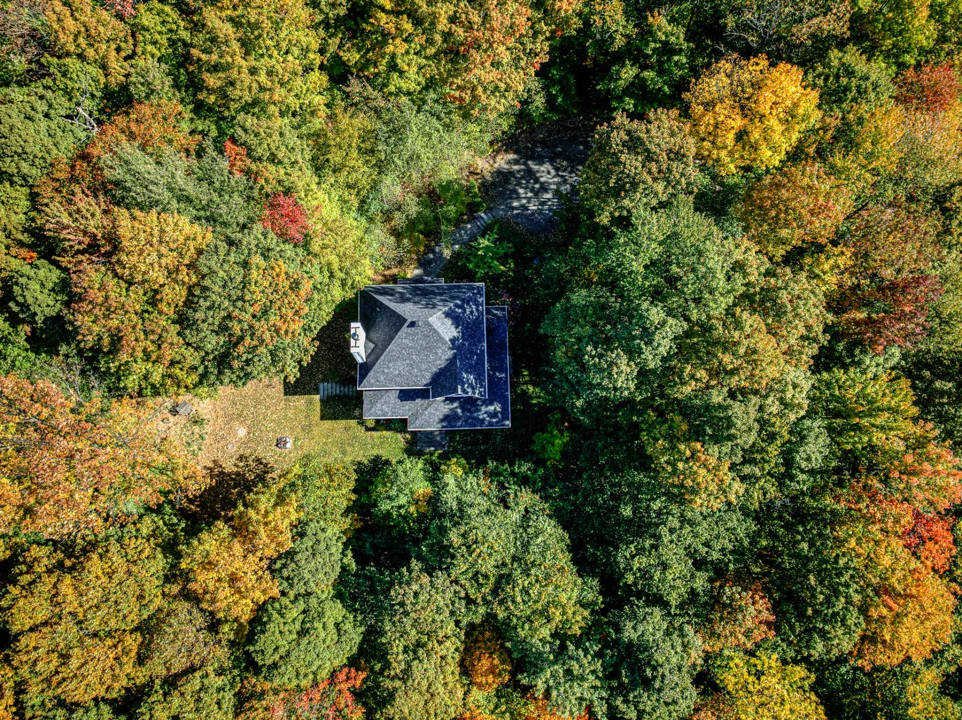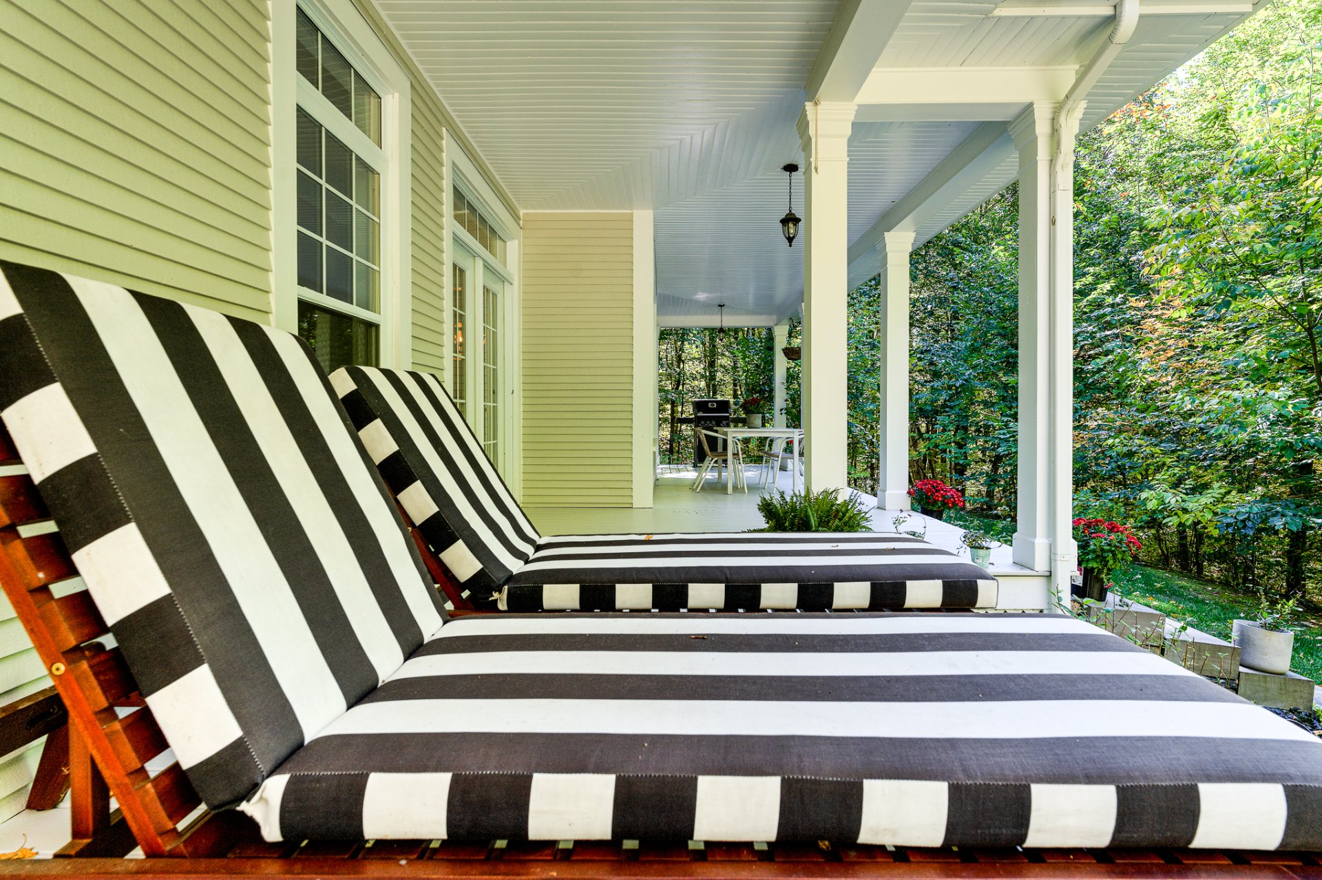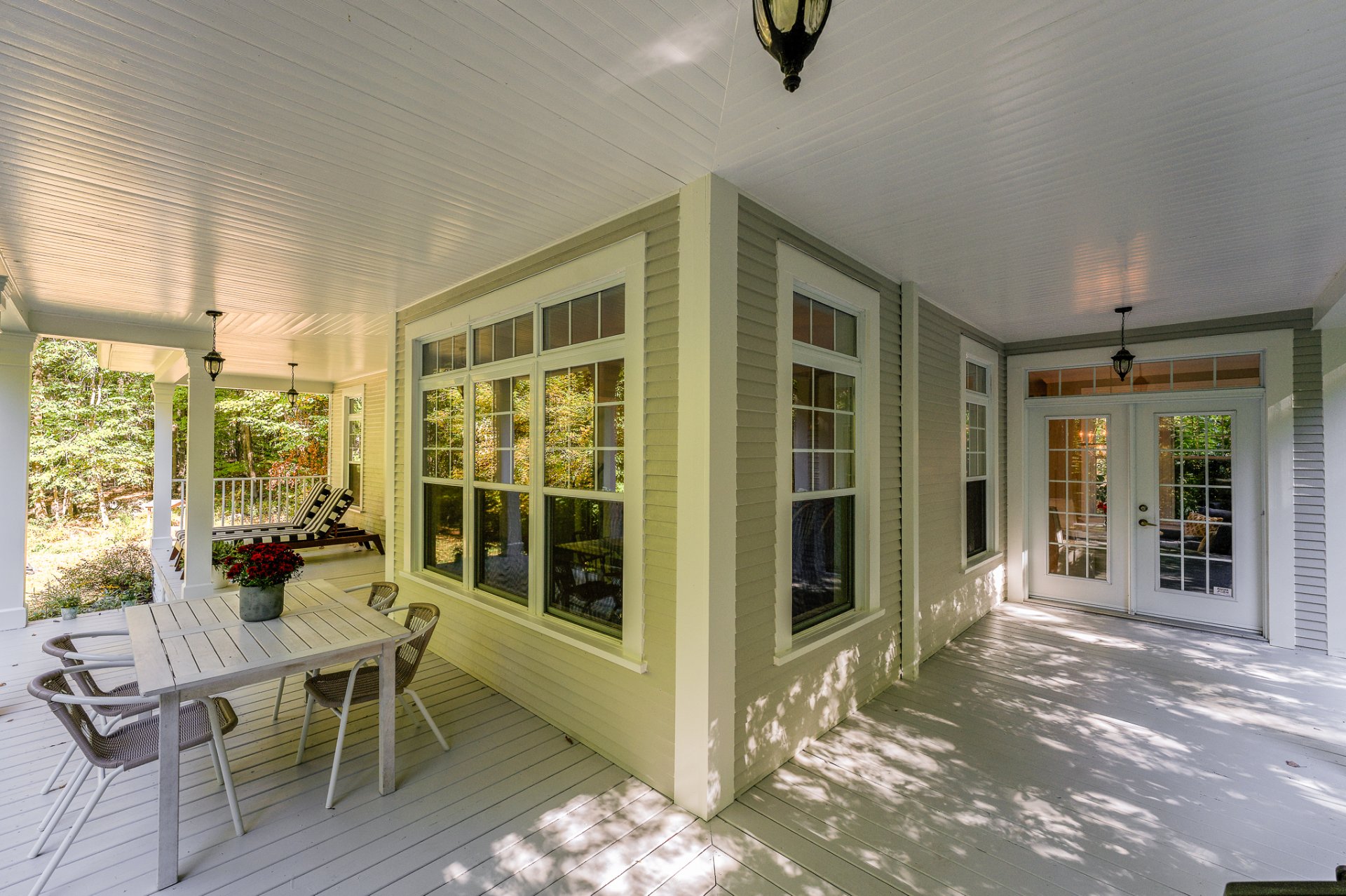 Outdoor living continues with a covered terrace with designated areas for dining and relaxation. Nature is ever-present here, with a large, private woodland bordering the C1 hiking trail, offering daily tranquility.
