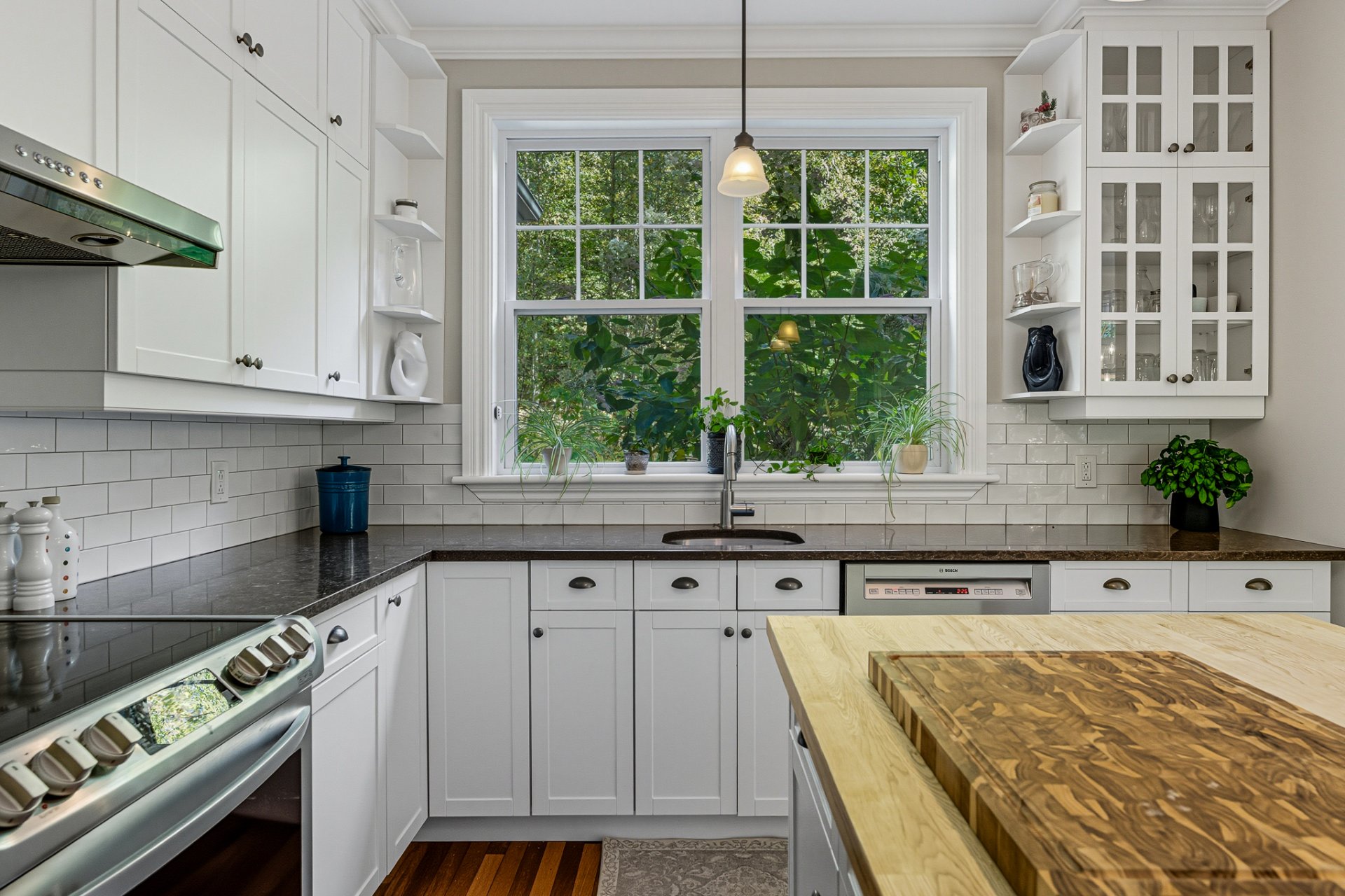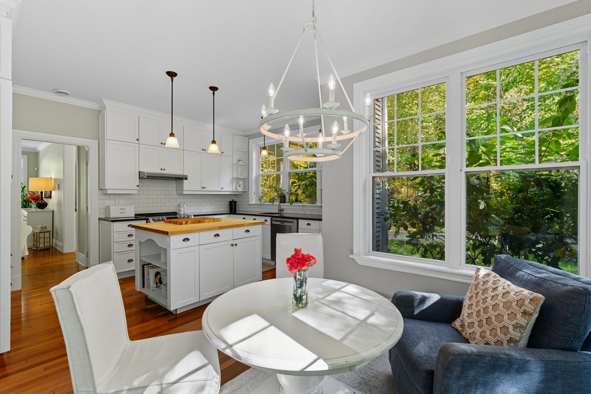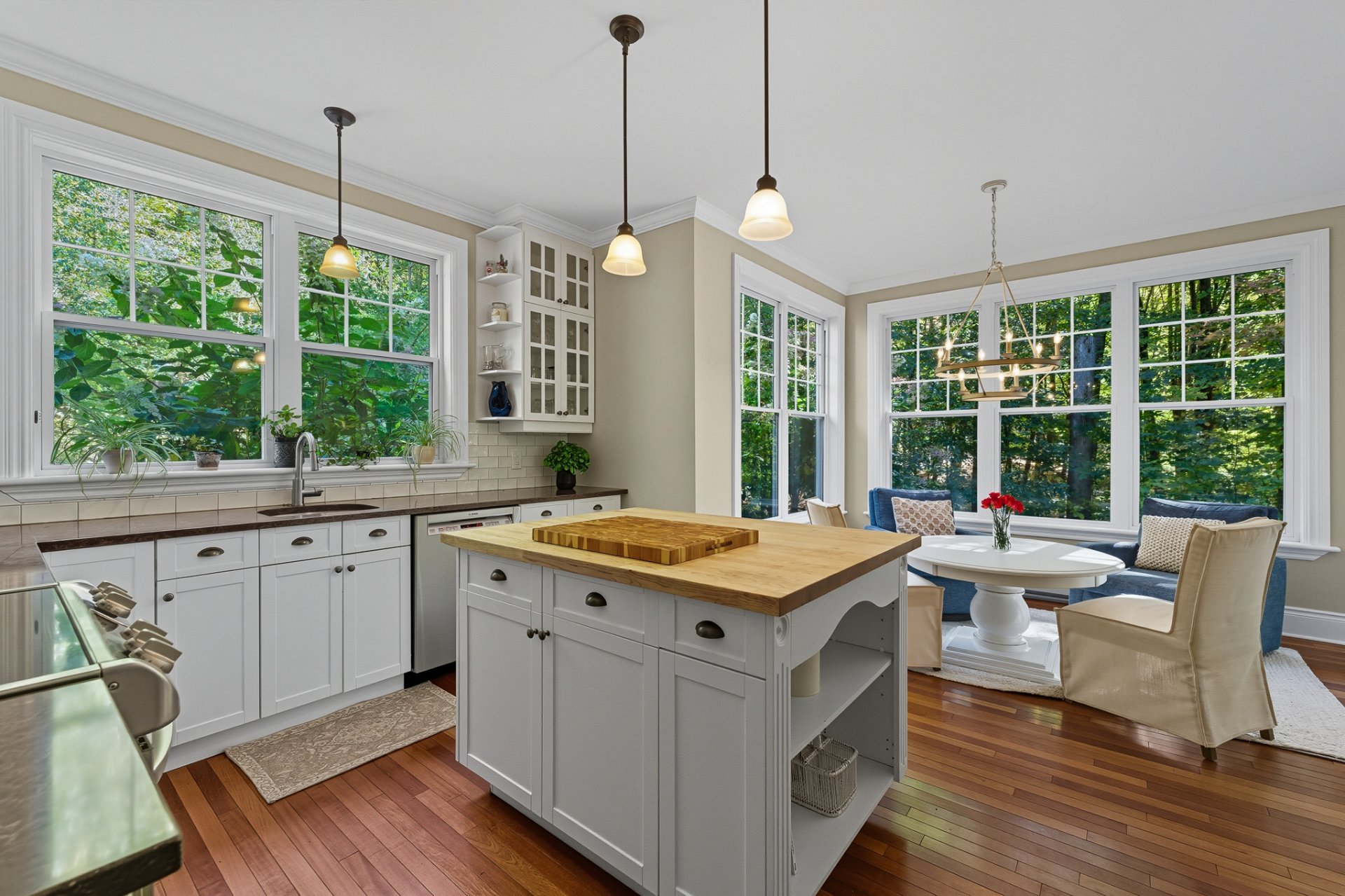 The kitchen, both elegant and functional, stands out with its full-height shaker cabinets, subway tile backsplash, and light wood center island. Adjacent to it, a coffee nook framed with windows on three sides becomes the perfect spot to enjoy a morning brew, read a good book, or sip an aperitif--all while remaining connected to nature.