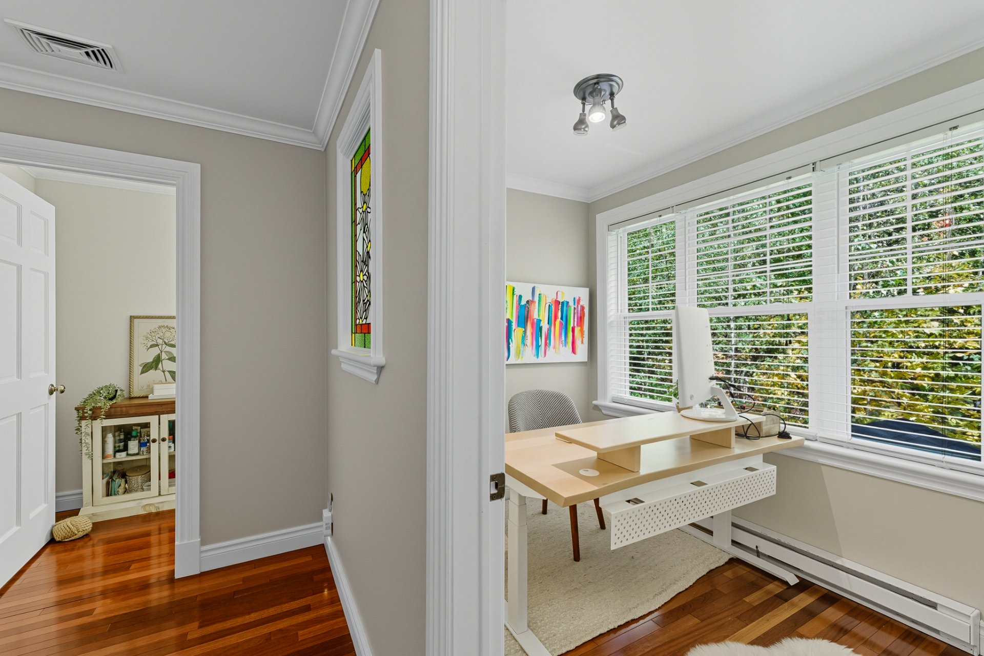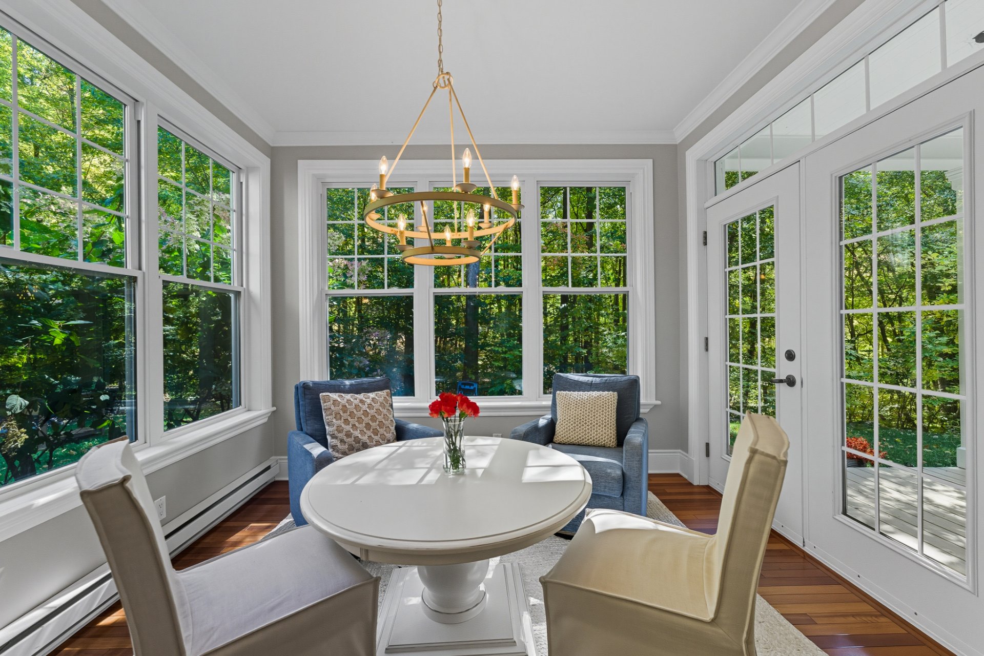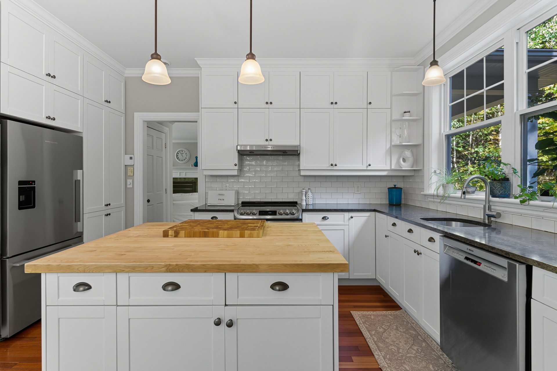 The kitchen, both elegant and functional, stands out with its full-height shaker cabinets, subway tile backsplash, and light wood center island. Adjacent to it, a coffee nook framed with windows on three sides becomes the perfect spot to enjoy a morning brew, read a good book, or sip an aperitif--all while remaining connected to nature.