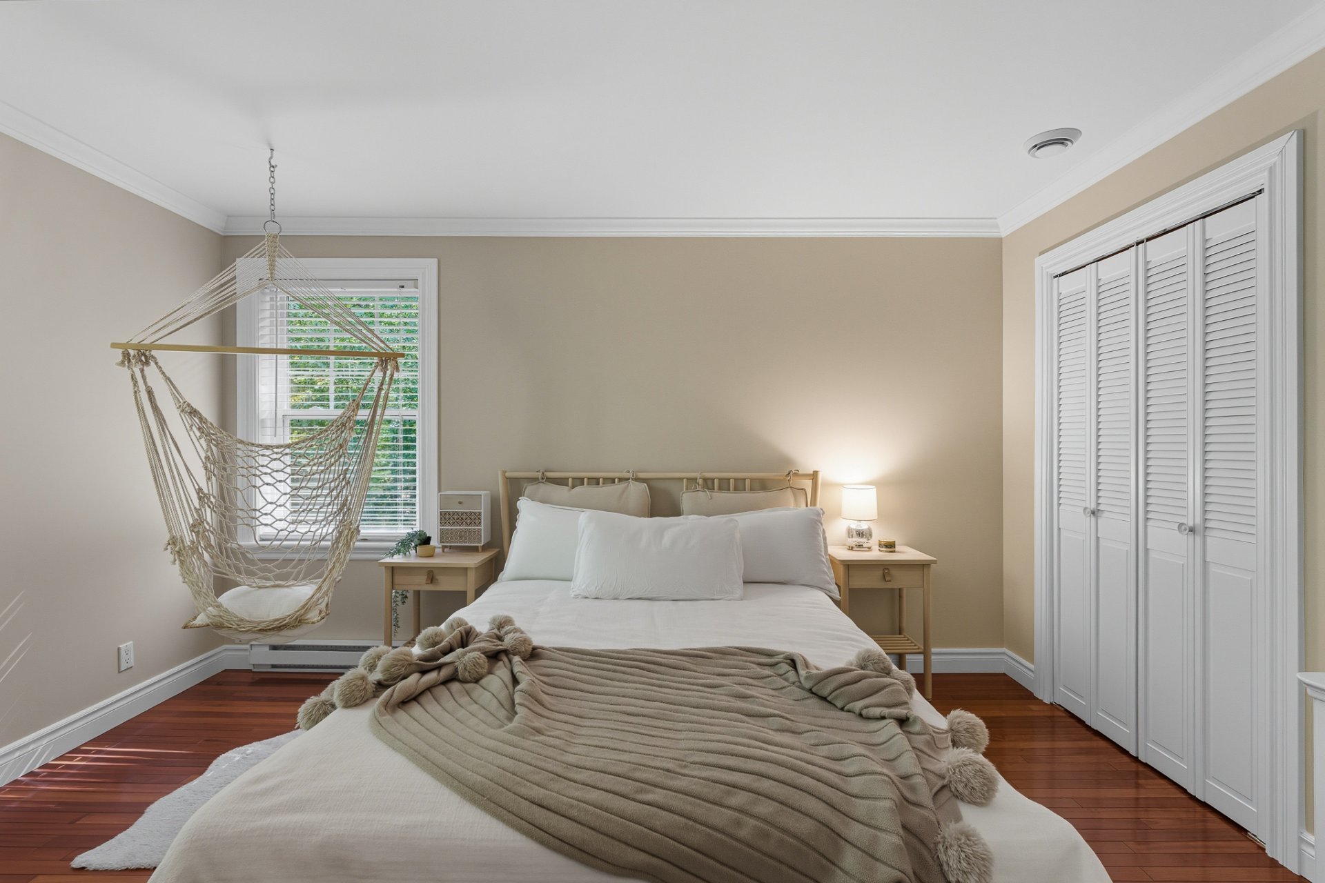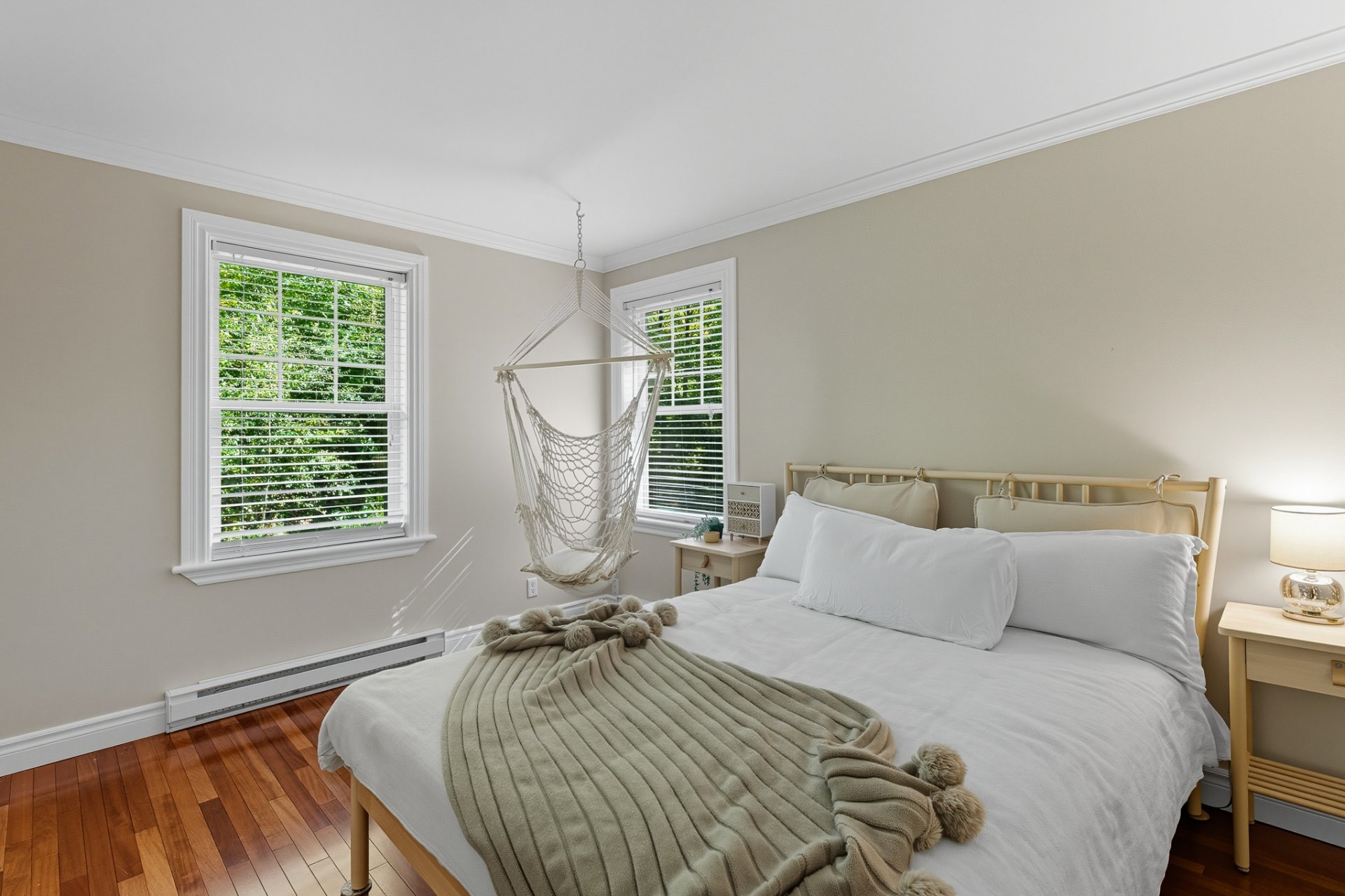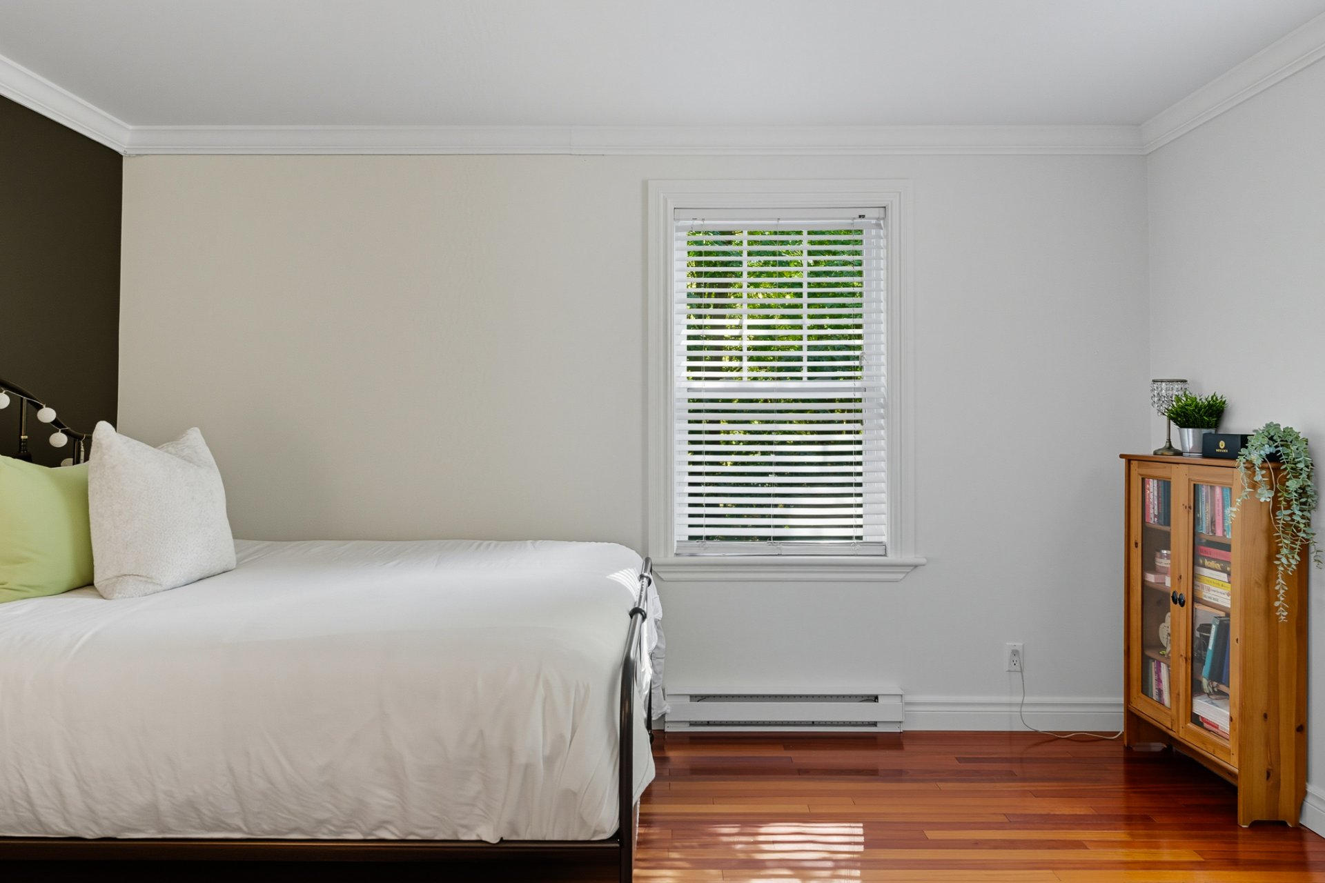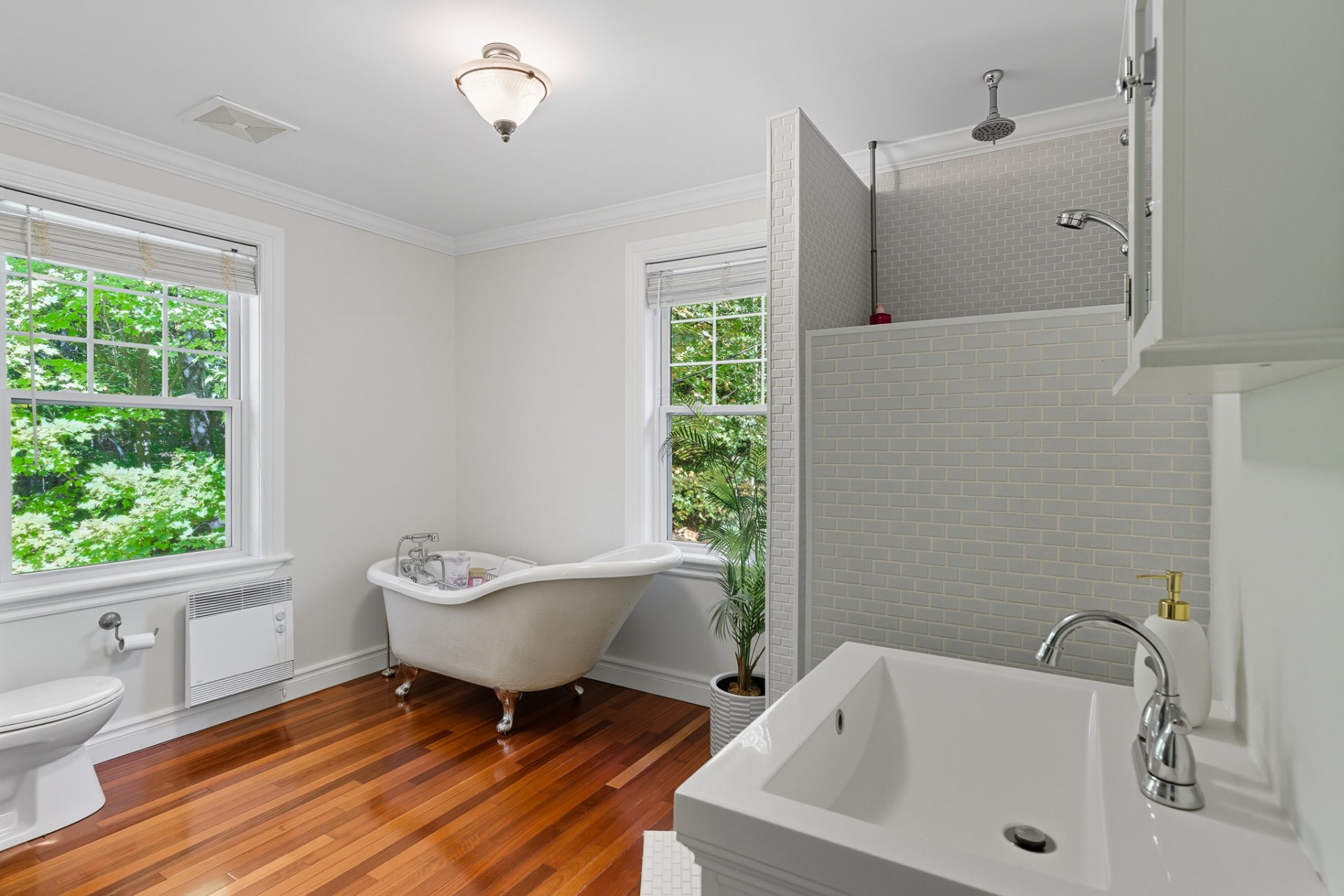 Upstairs, three bedrooms create an intimate and restful space. The master suite offers a practical walk-in closet and an ensuite bathroom featuring a clawfoot tub and a ceramic walk-in shower.