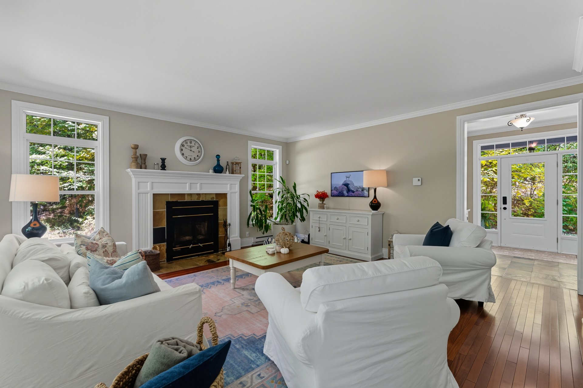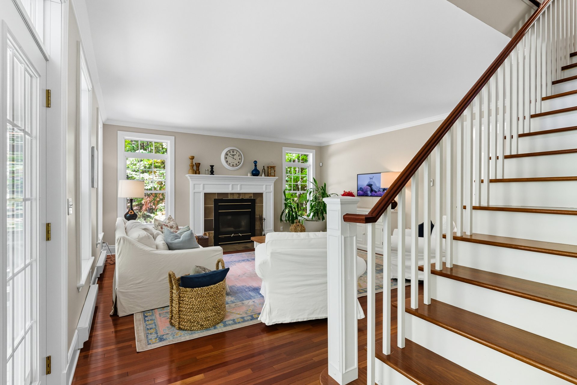 From the hall, slate tiles set the tone: noble materials and meticulous attention to detail. The living room is centered around a wood-burning fireplace, while Brazilian hardwood floors lend warmth and depth to the space.