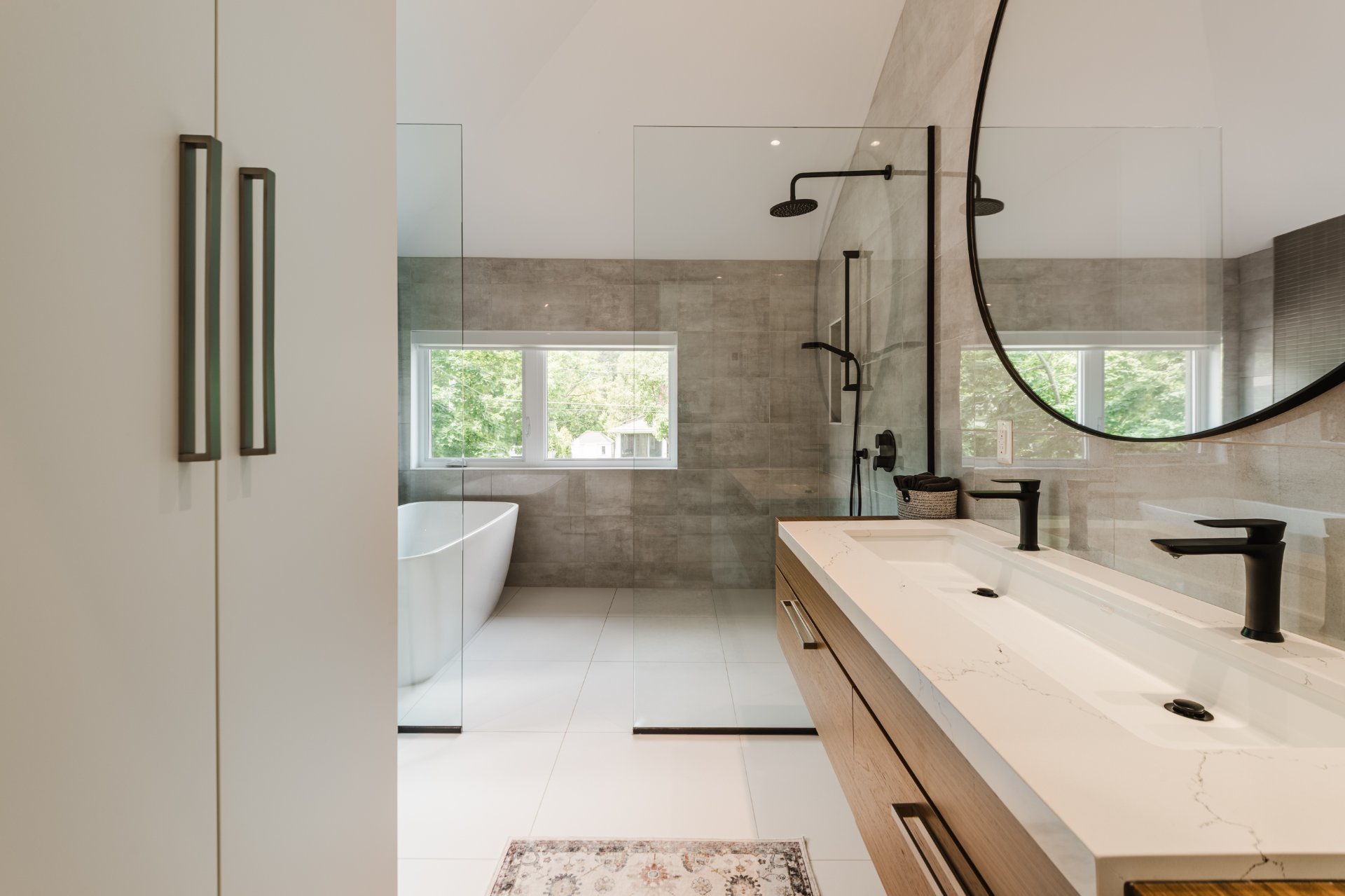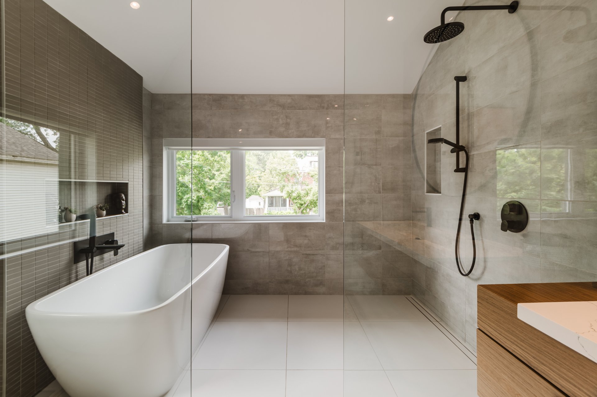 Ensuite bathroom with double vanity, walk-in shower, freestanding tub, heated floors, and electric blinds
