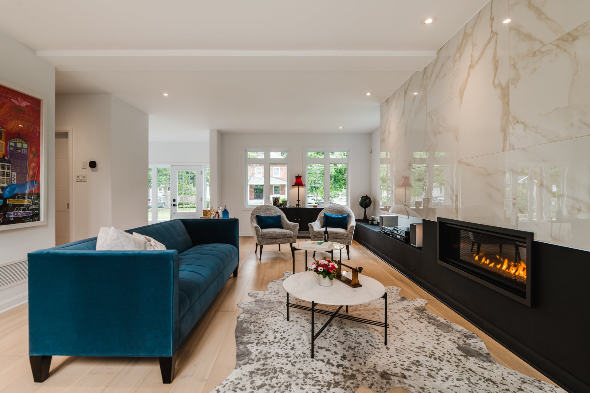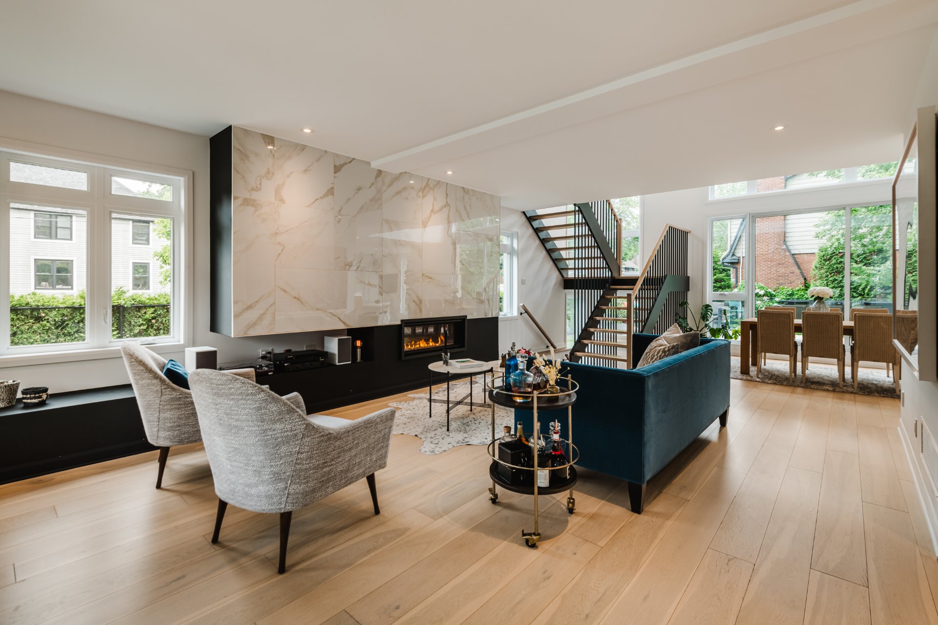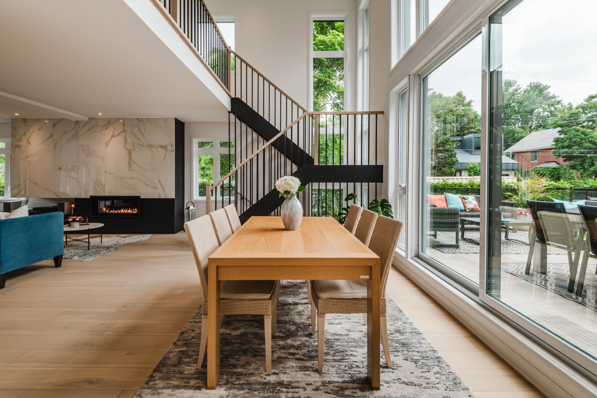 Living room with gas fireplace, modern open space connected to the backyard through a large patio door