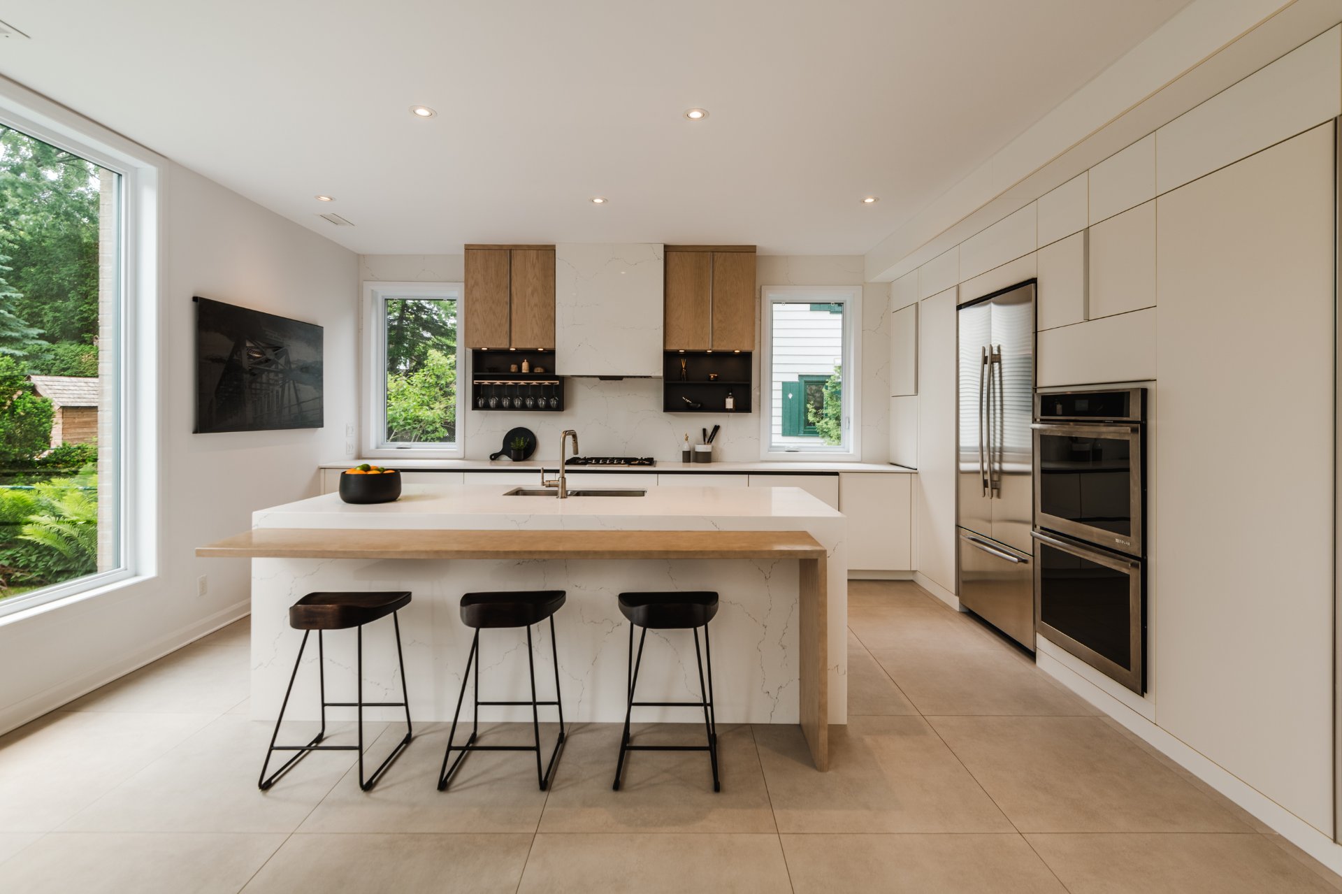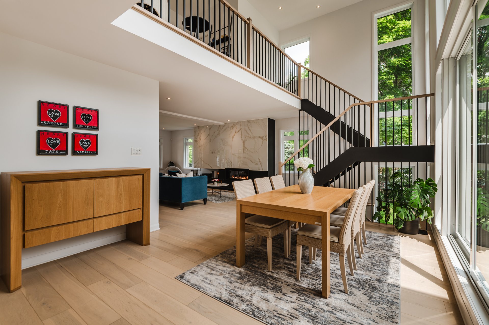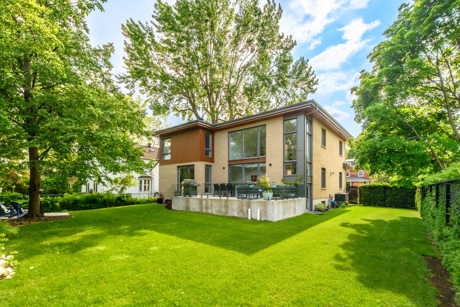 Contemporary home in the heart of Saint-Lambert, designed by Luc Plante (architecture) and Claudia Reeves (interior design). 6600 sq ft lot, recent construction, high-end finishes. Spacious and bright main floor with 16-foot ceilings, gas fireplace, fully equipped kitchen, powder room, and large terrace. Upstairs: impressive primary suite with custom walk-in and luxurious ensuite, two bedrooms, second full bathroom, and laundry room. Finished basement, garage with mudroom area. Prime location near schools and local shops.