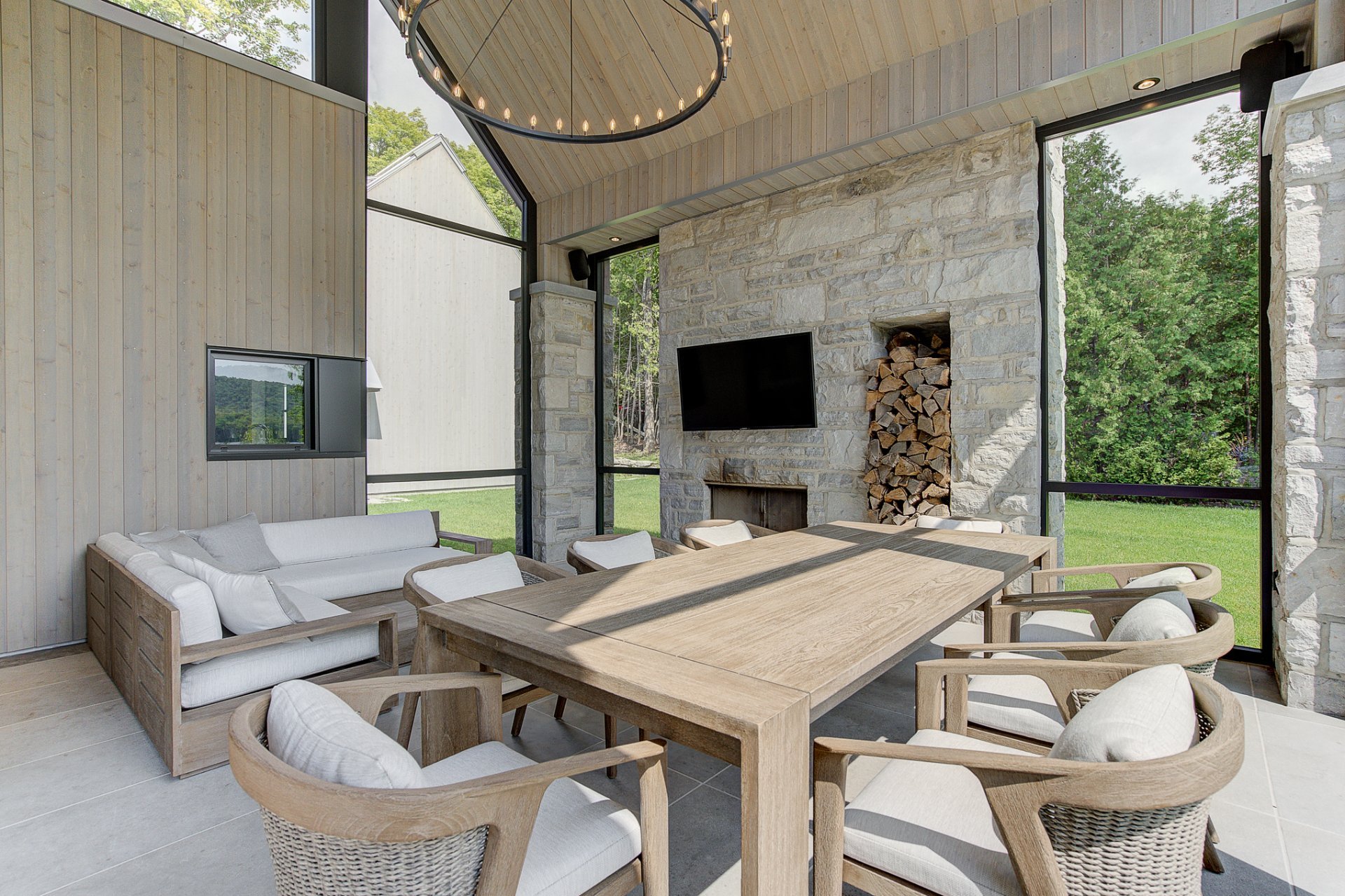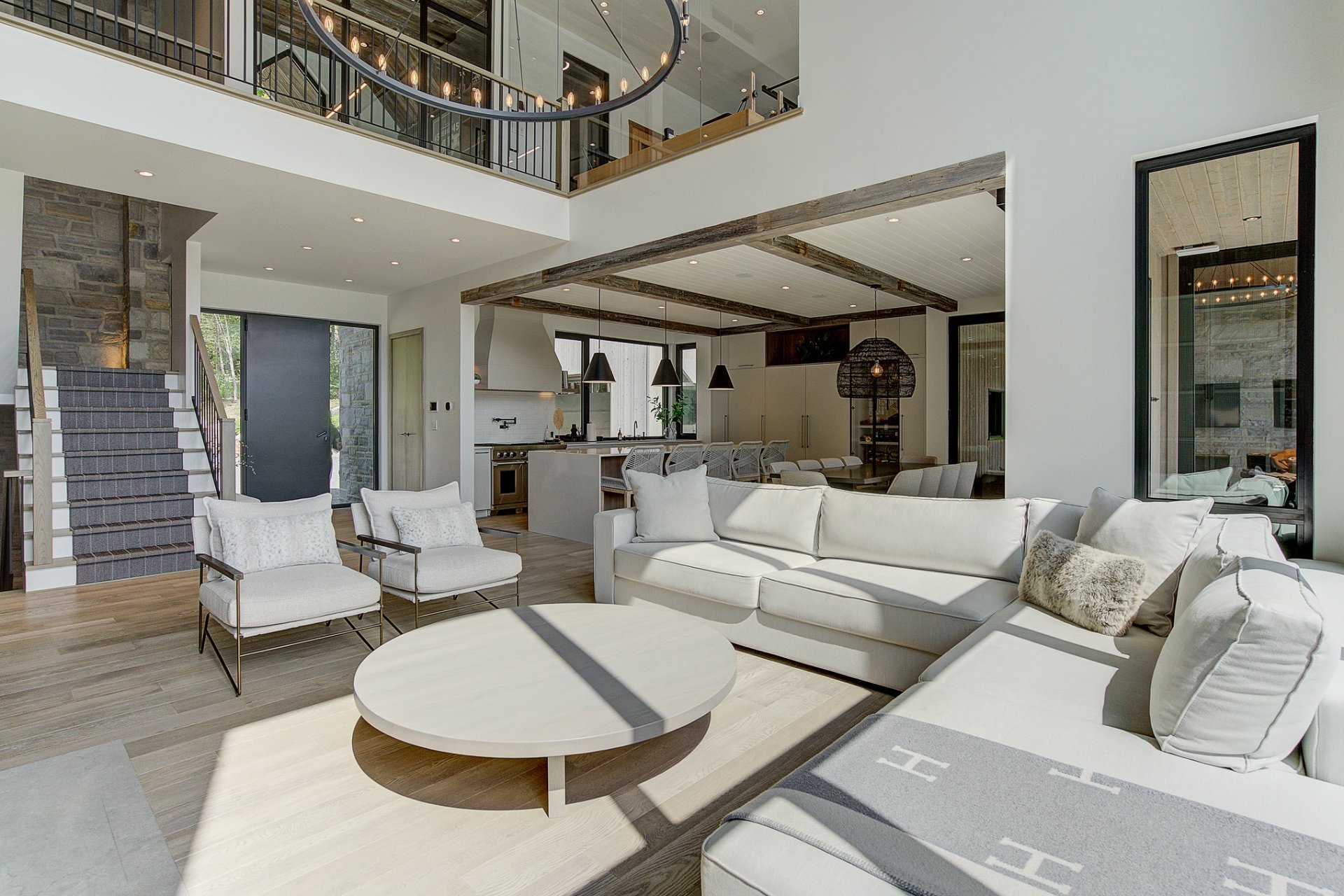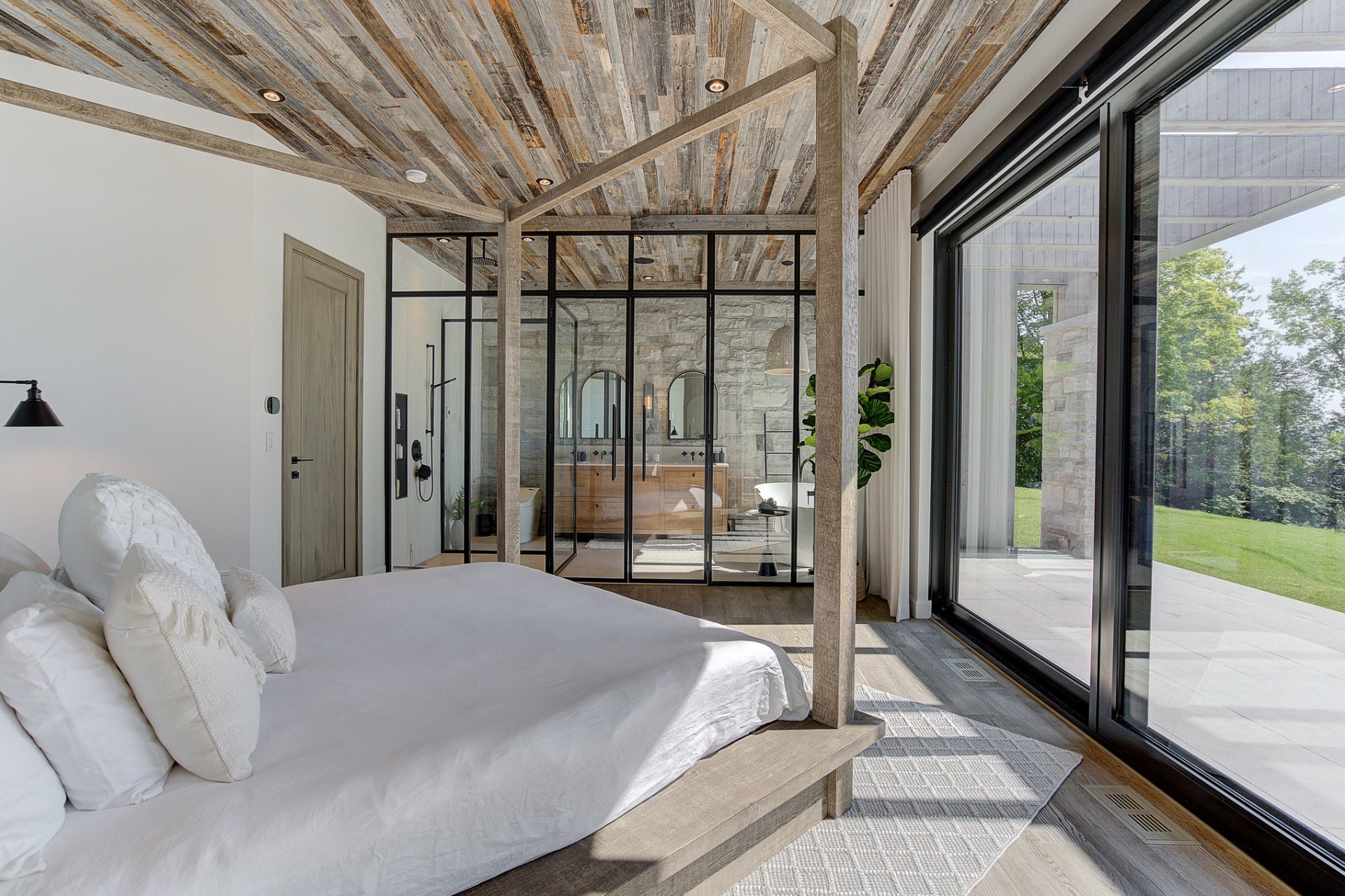 Exceptional materials, such as stone walls, imposing beams, and barn wood, give this home a unique authenticity. Modernity is ensured by high-end equipment, including glycol heating and the Control4 home automation system, which manages lighting, security, sound, and blinds. Fully furnished, the house features pieces from Restoration Hardware and Cabinet P.