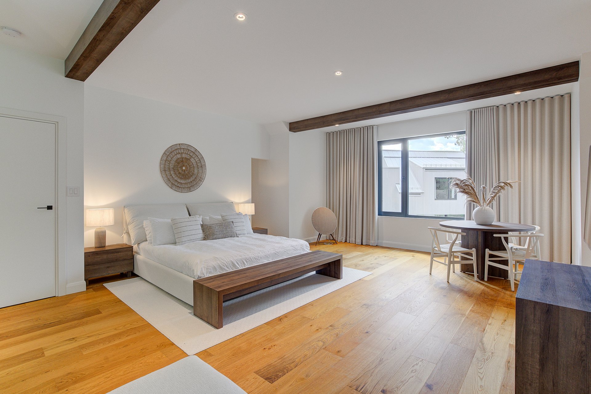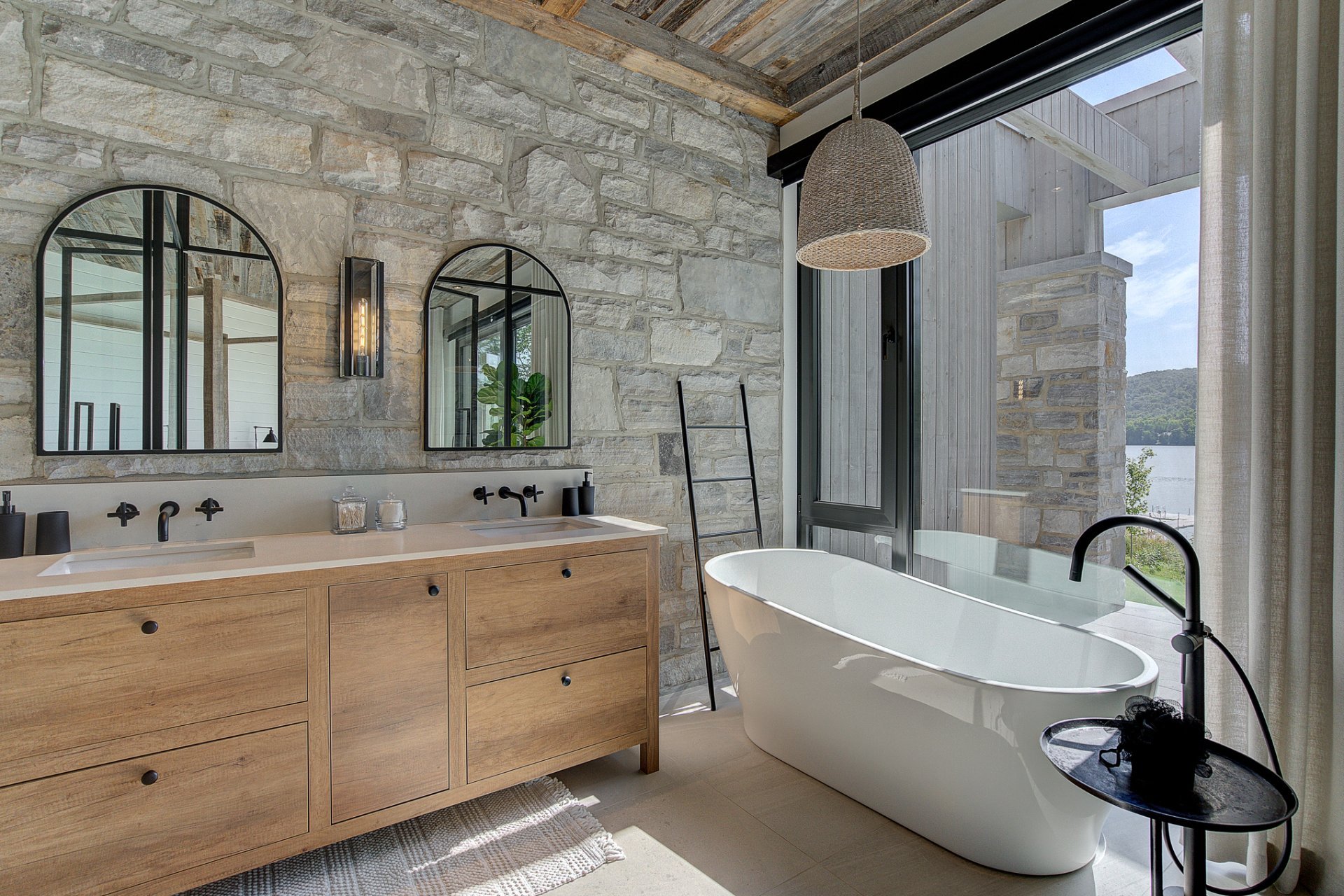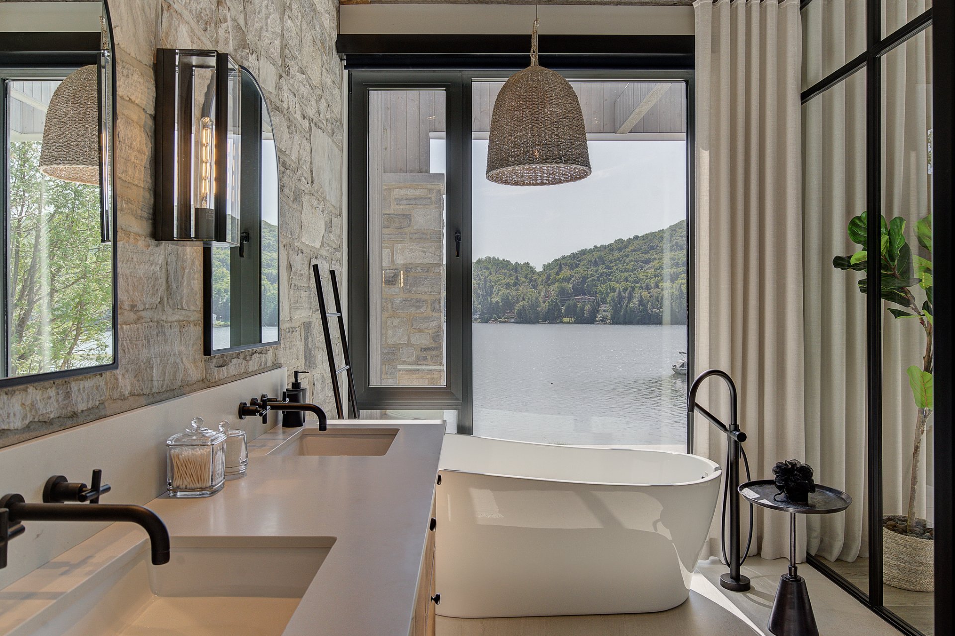The master suite offers a stunning view of the lake. The adjoining bathroom features a freestanding tub, a separate shower, triple sinks, and a stone wall, providing a private spa experience. A walk-in closet with integrated storage completes this sanctuary.