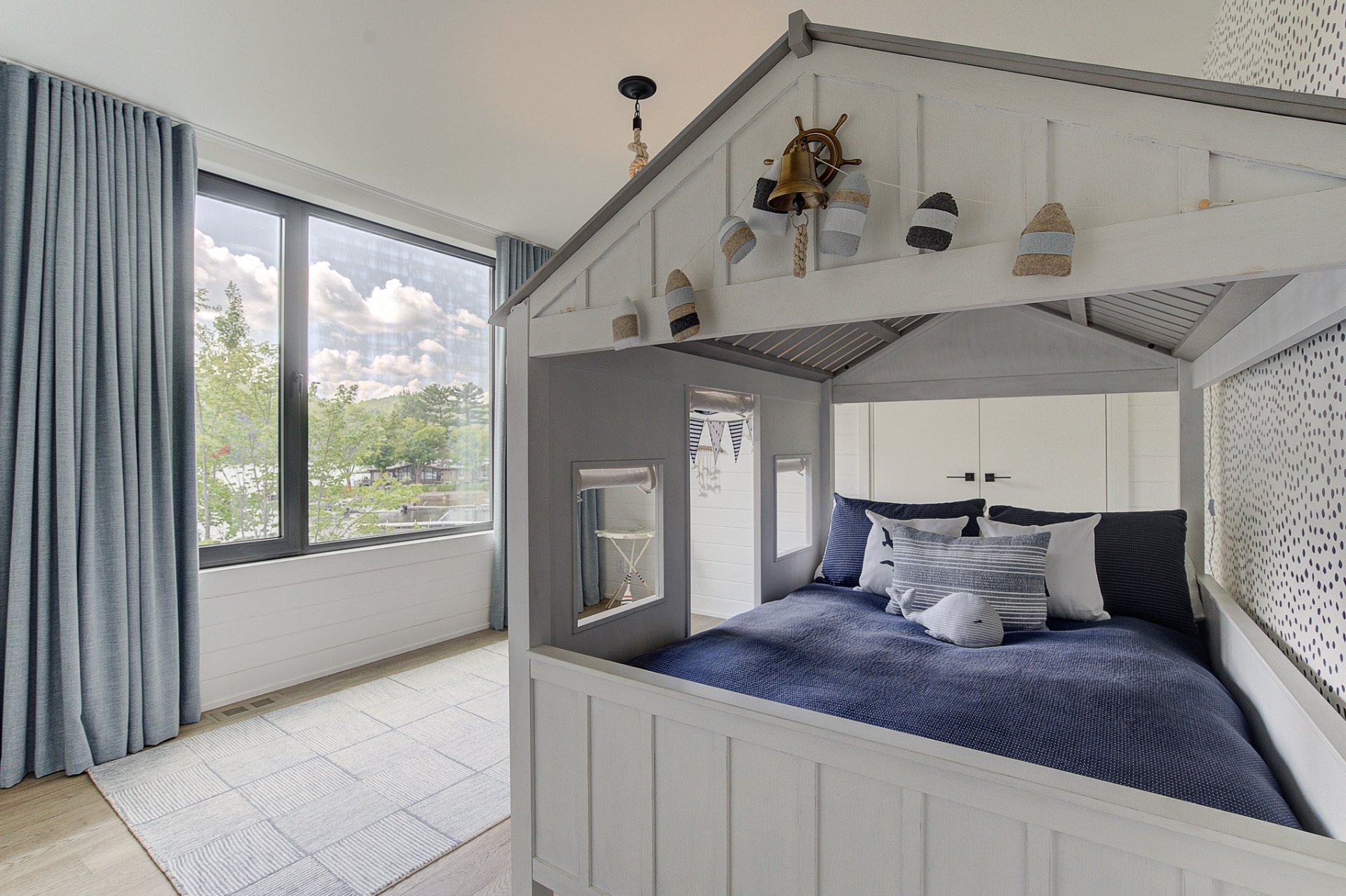 Upon entry, 24-foot ceilings provide a grand sense of space, with spectacular views of the lake and mountains. An elegant wood-burning fireplace adds a touch of warmth and luxury.