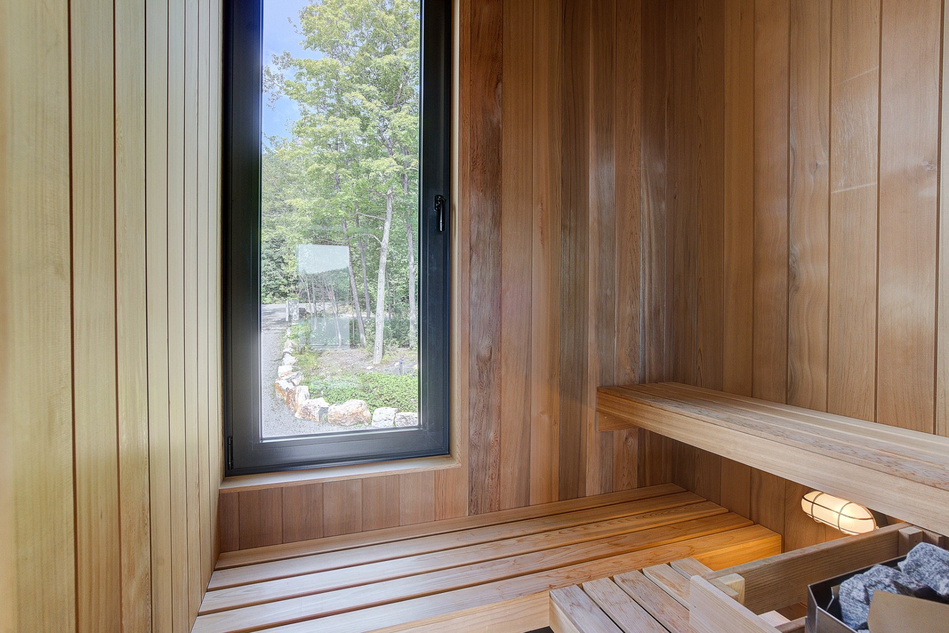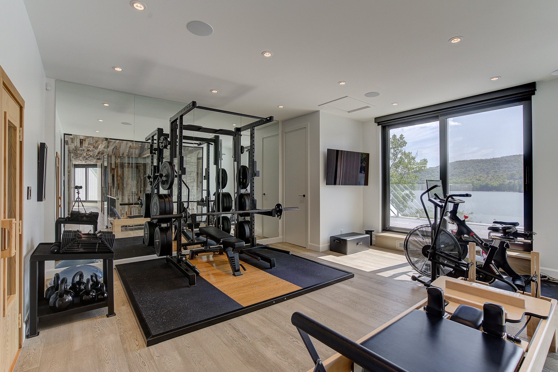An exercise room, equipped with a sauna and shower, offers direct access to the terrace and an unobstructed view for moments of relaxation.