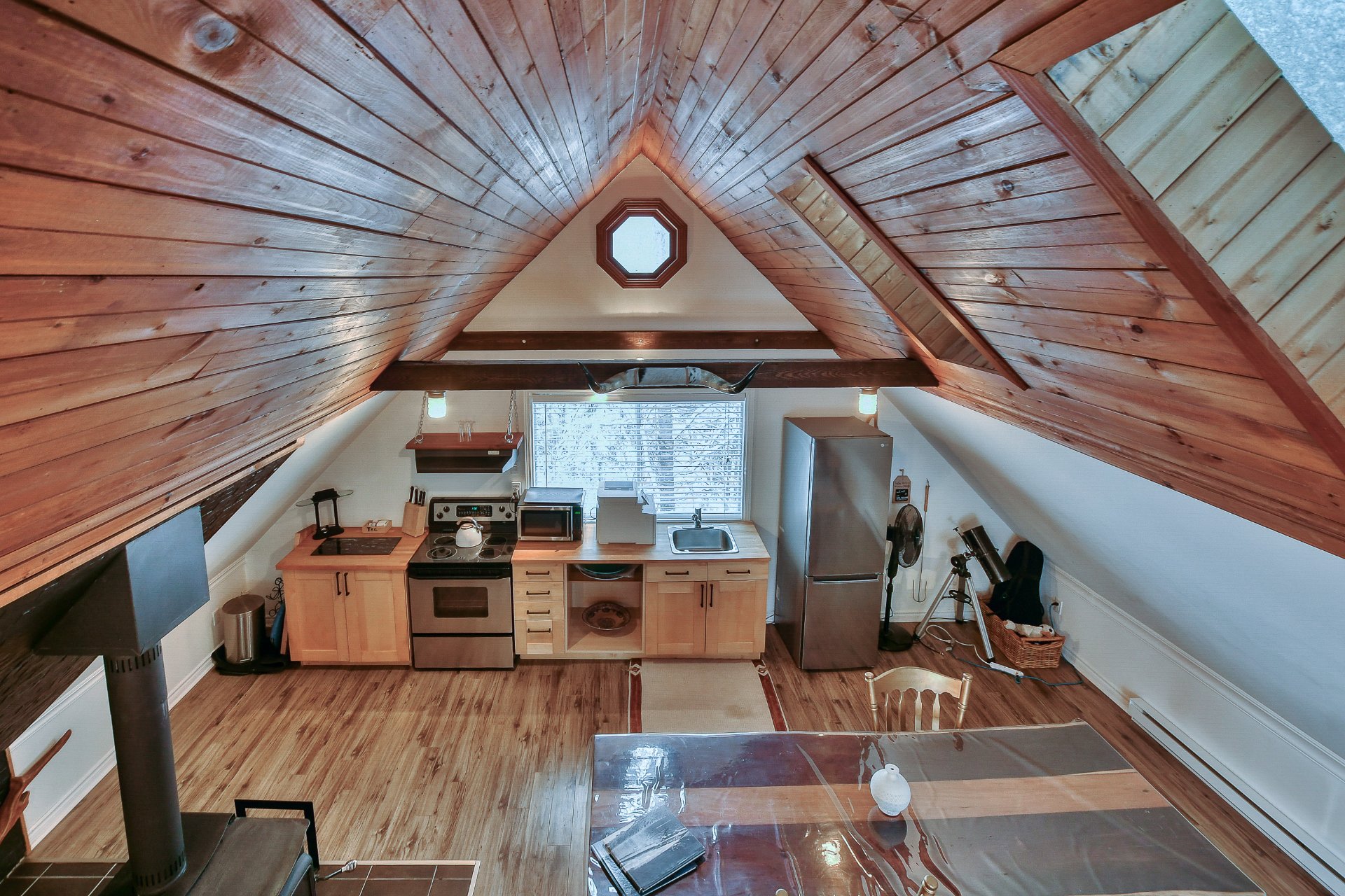 The large double garage provides storage for cars, boats, snowmobiles, etc. The guest loft, complete with kitchen, living area, bathroom, mezzanine bedroom, and solarium, offers an ideal independent space for visitors.