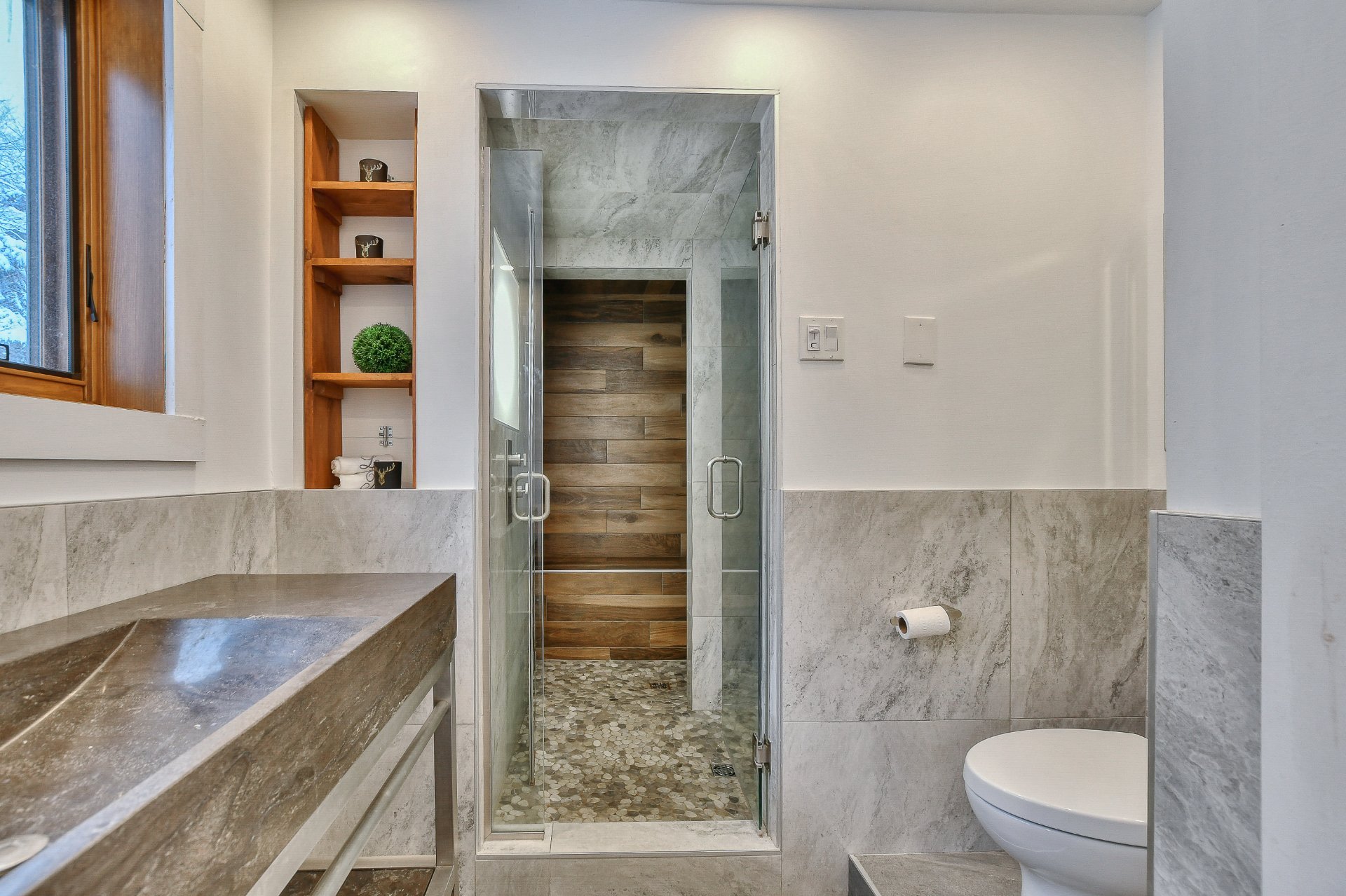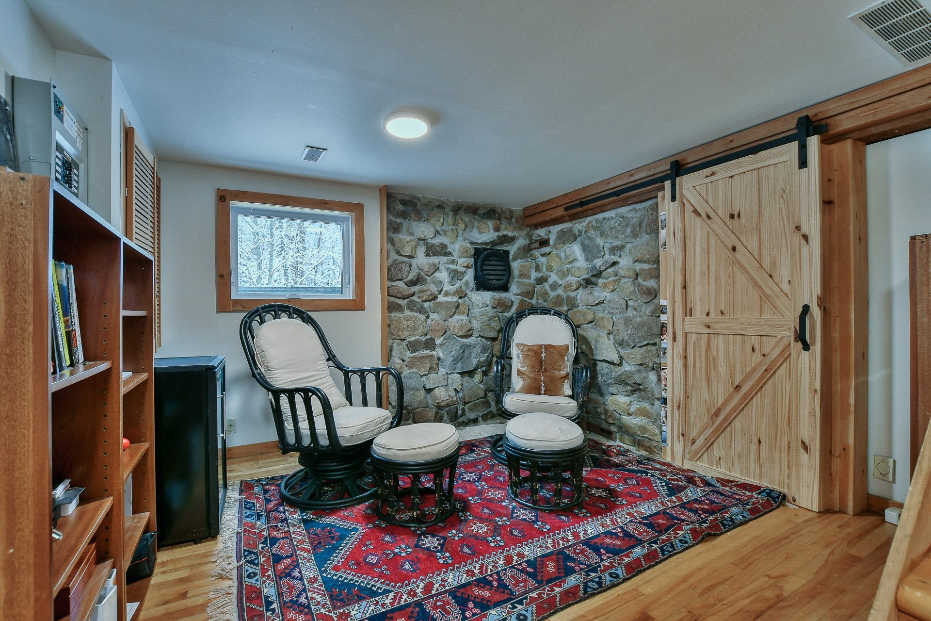 Beautiful home featuring abundant windows, open-concept living spaces, and a stone fireplace. It includes 3 bedrooms, an office, and a playroom, as well as a multi-jet shower and steam bath, wood paneling, and pine floors. A screened-in veranda with built-in spa and a large deck make it perfect for entertaining family and friends.
