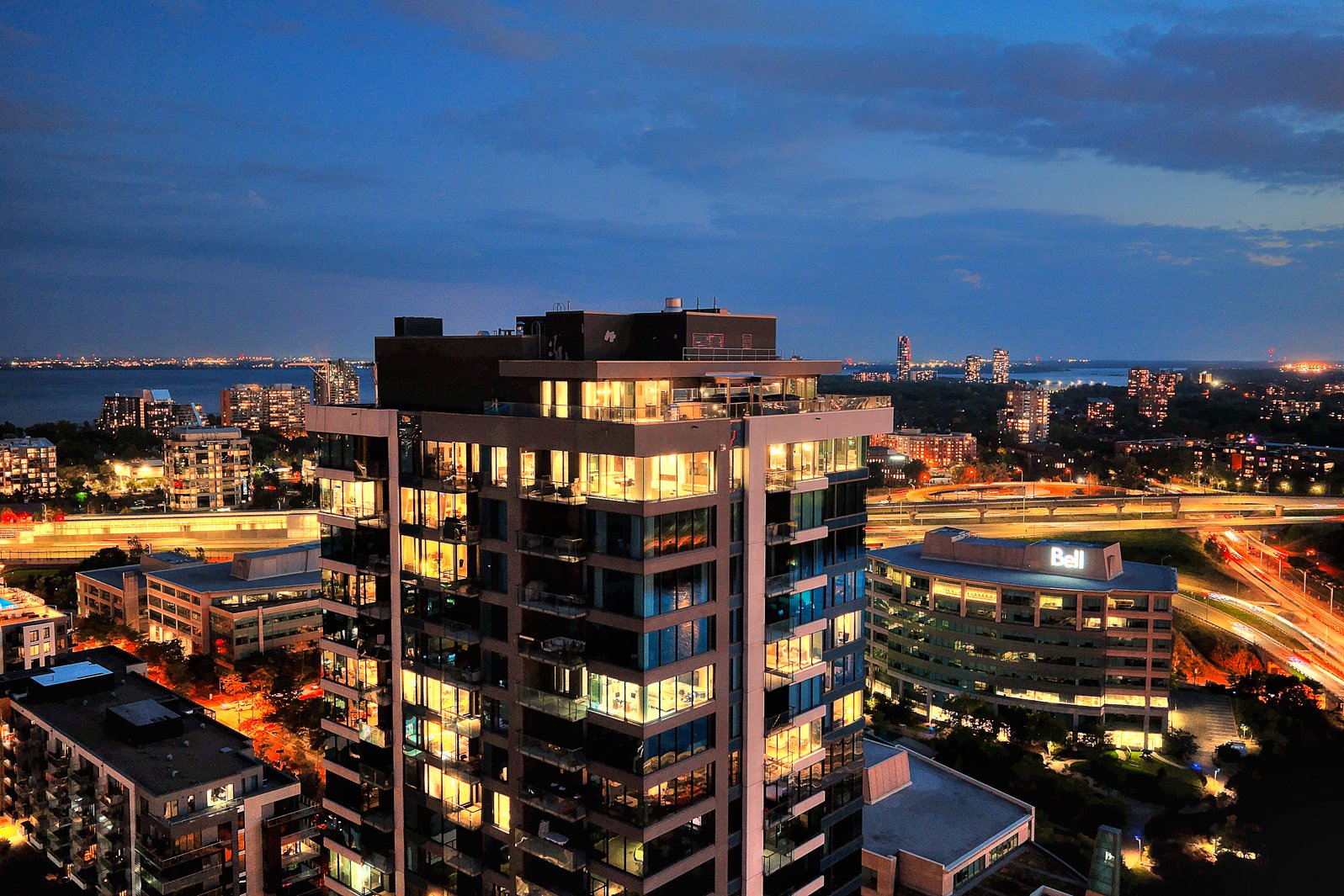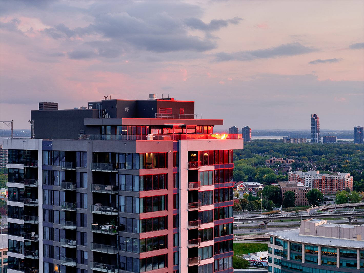 This residence enjoys a privileged position with breathtaking vistas of downtown Montréal, the St. Lawrence River, and spectacular sunsets.