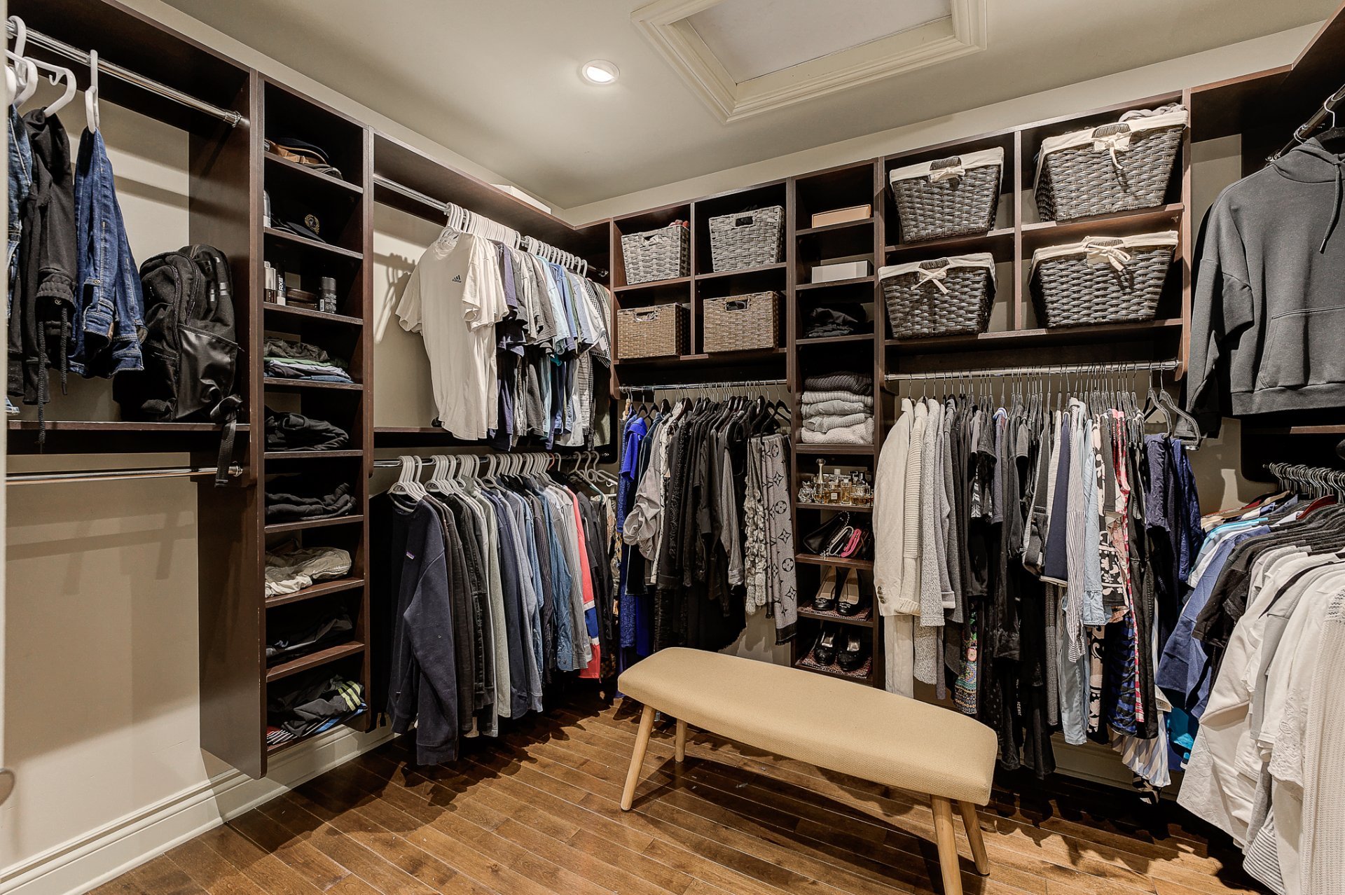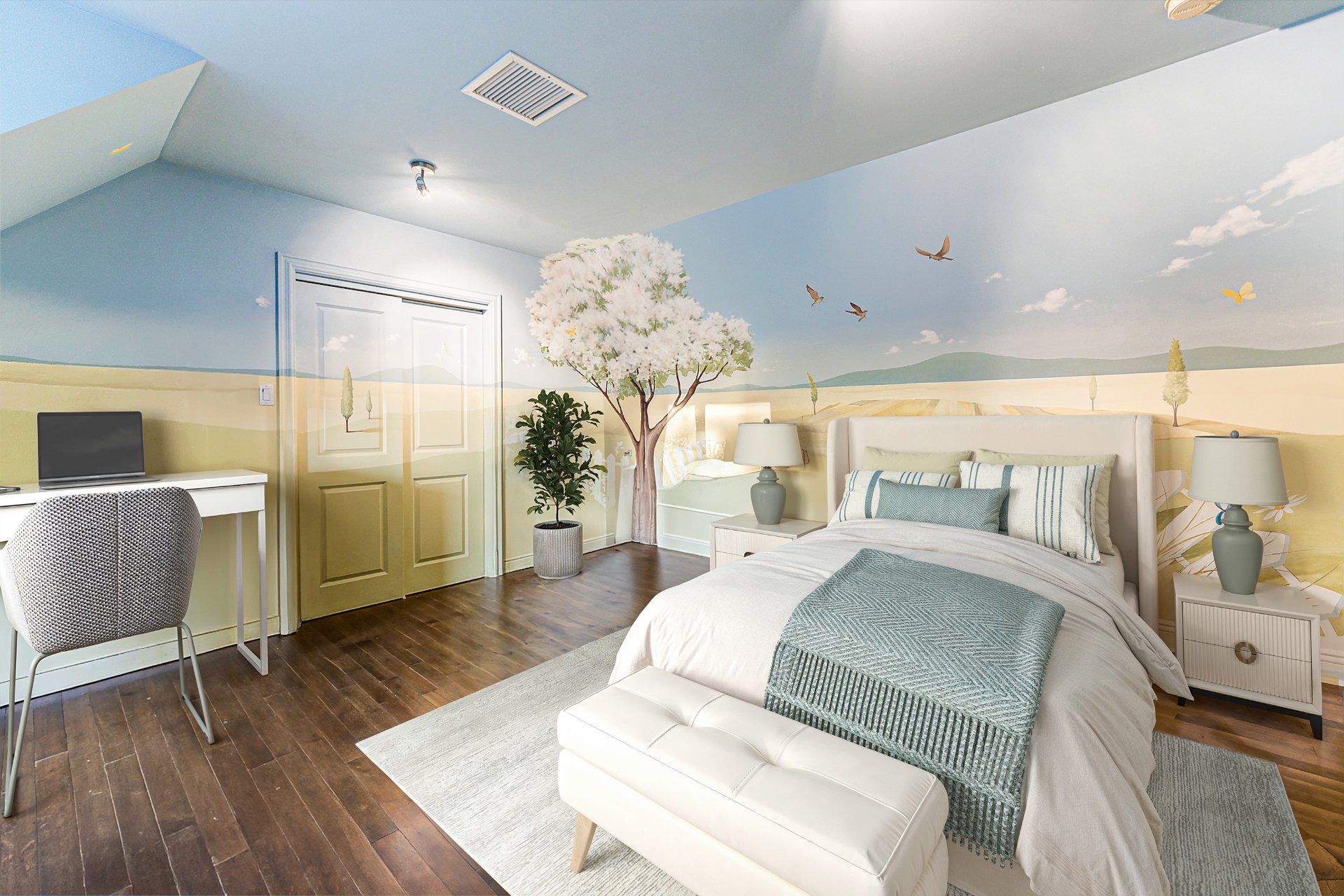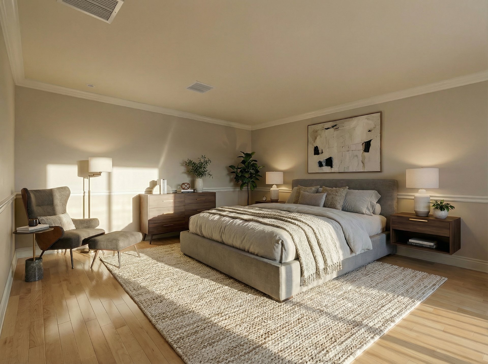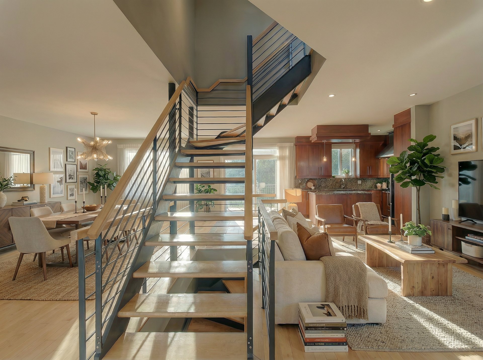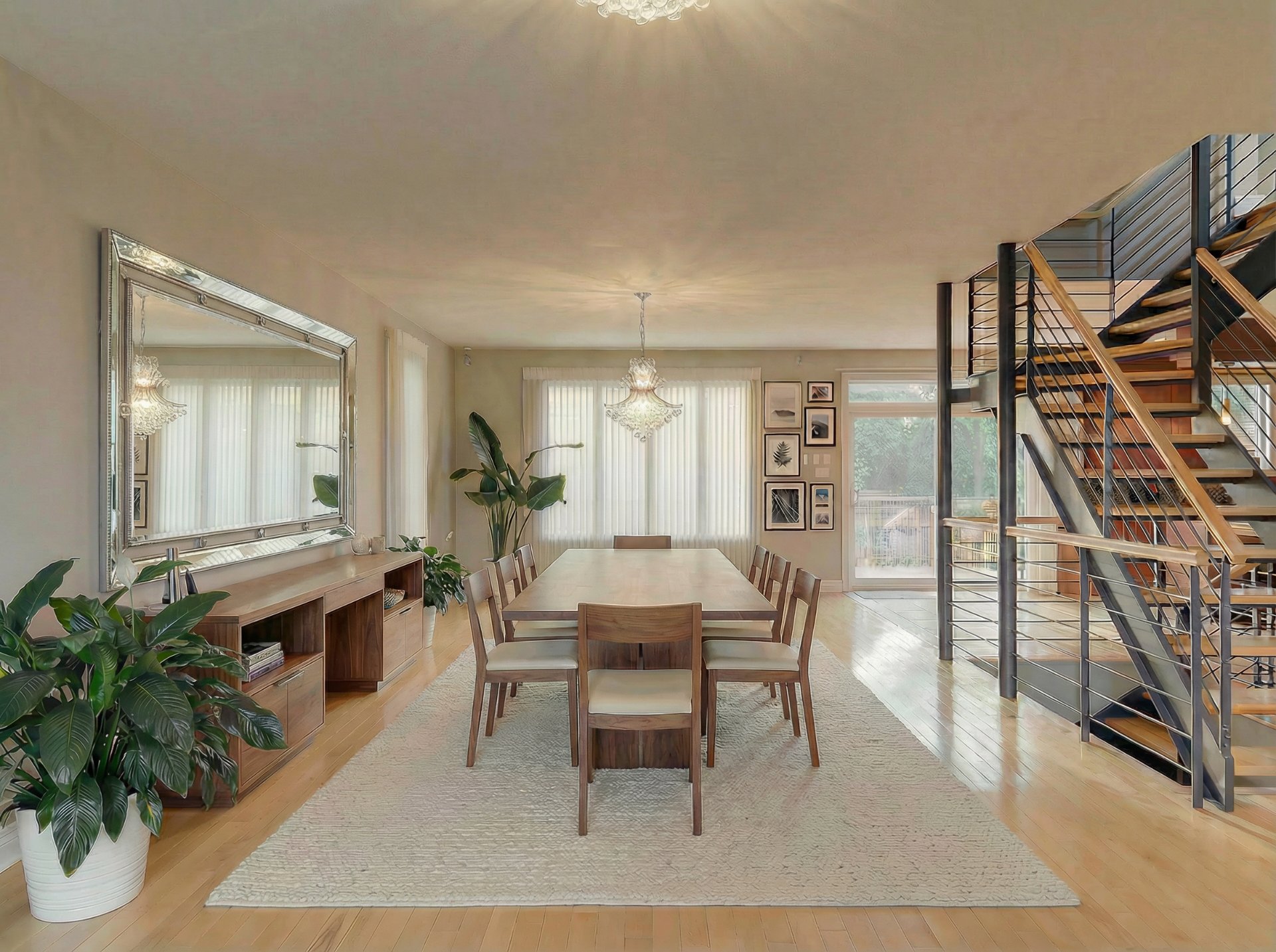 The spacious entrance opens to a modern architectural staircase and airy open-concept living spaces. The main floor includes a high-end kitchen with granite countertops, a cozy dining nook, a refined living room, and a formal dining area perfect for entertaining. Upstairs offers several large bedrooms, including a luxurious primary suite with a walk-in closet and ensuite bathroom.