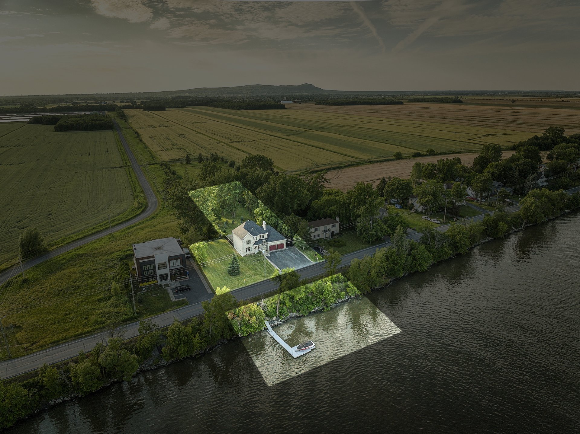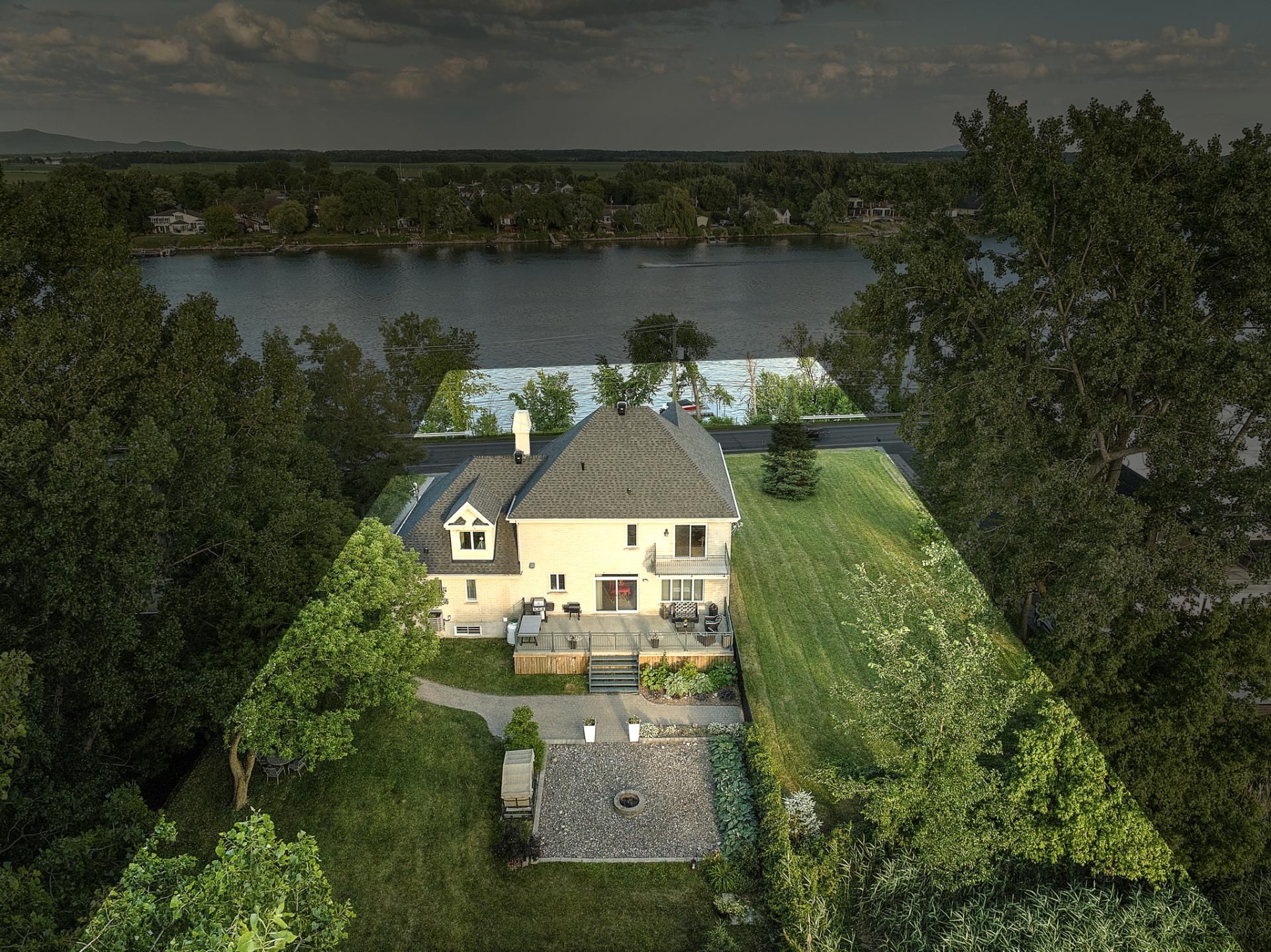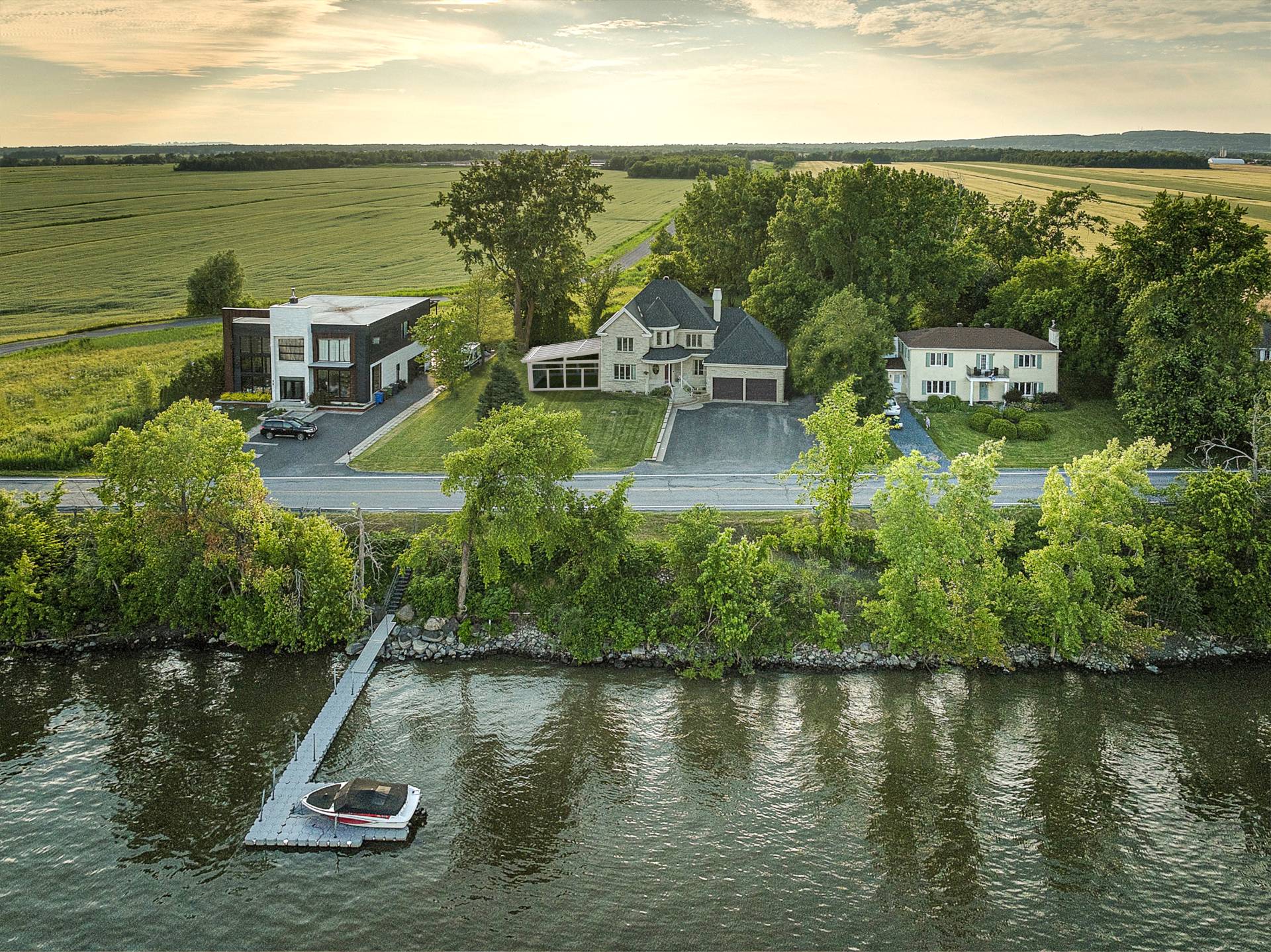 Gracefully nestled on over 39,000 sq. ft. along the serene banks of the Richelieu River, this distinguished residence embodies timeless elegance and elevated living. Bathed in natural light, its open-concept layout features a sculptural staircase, radiant heated floors, a chef's kitchen adorned with granite, a private sauna, EV charging station, double garage, and generous parking for up to 8 vehicles. Manicured grounds, an intimate firepit lounge, and a private dock complete this rare sanctuary of sophistication and quiet grandeur.