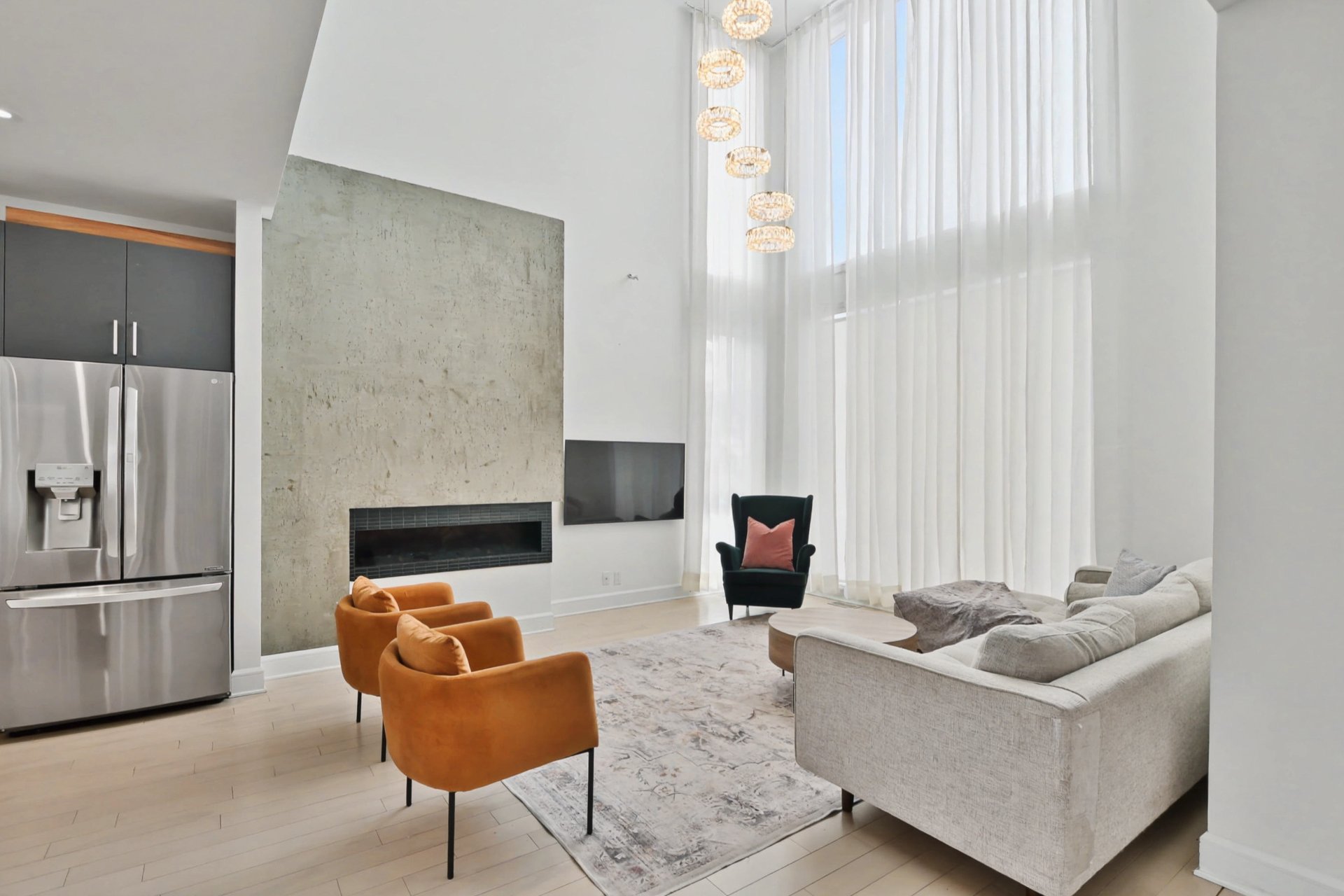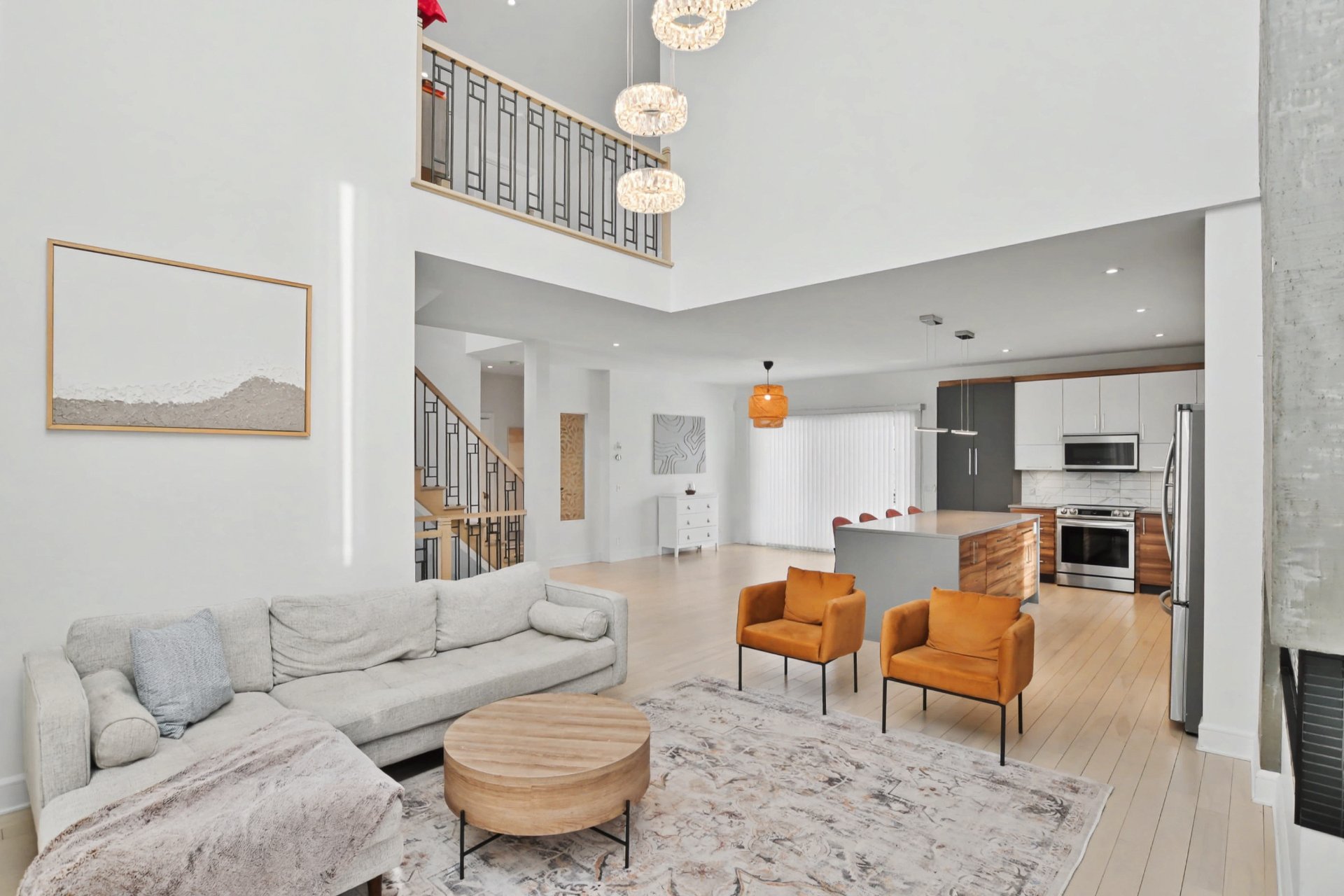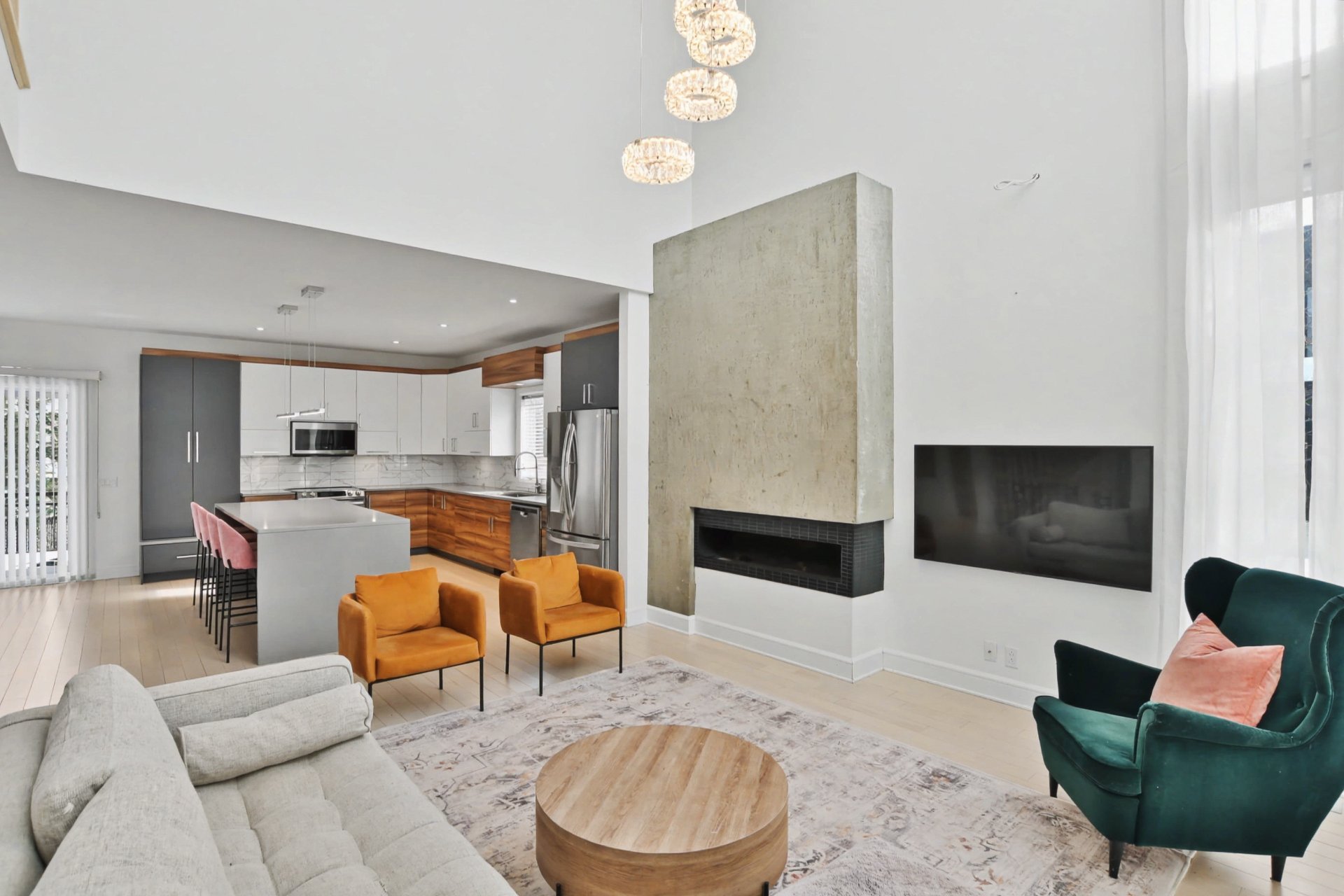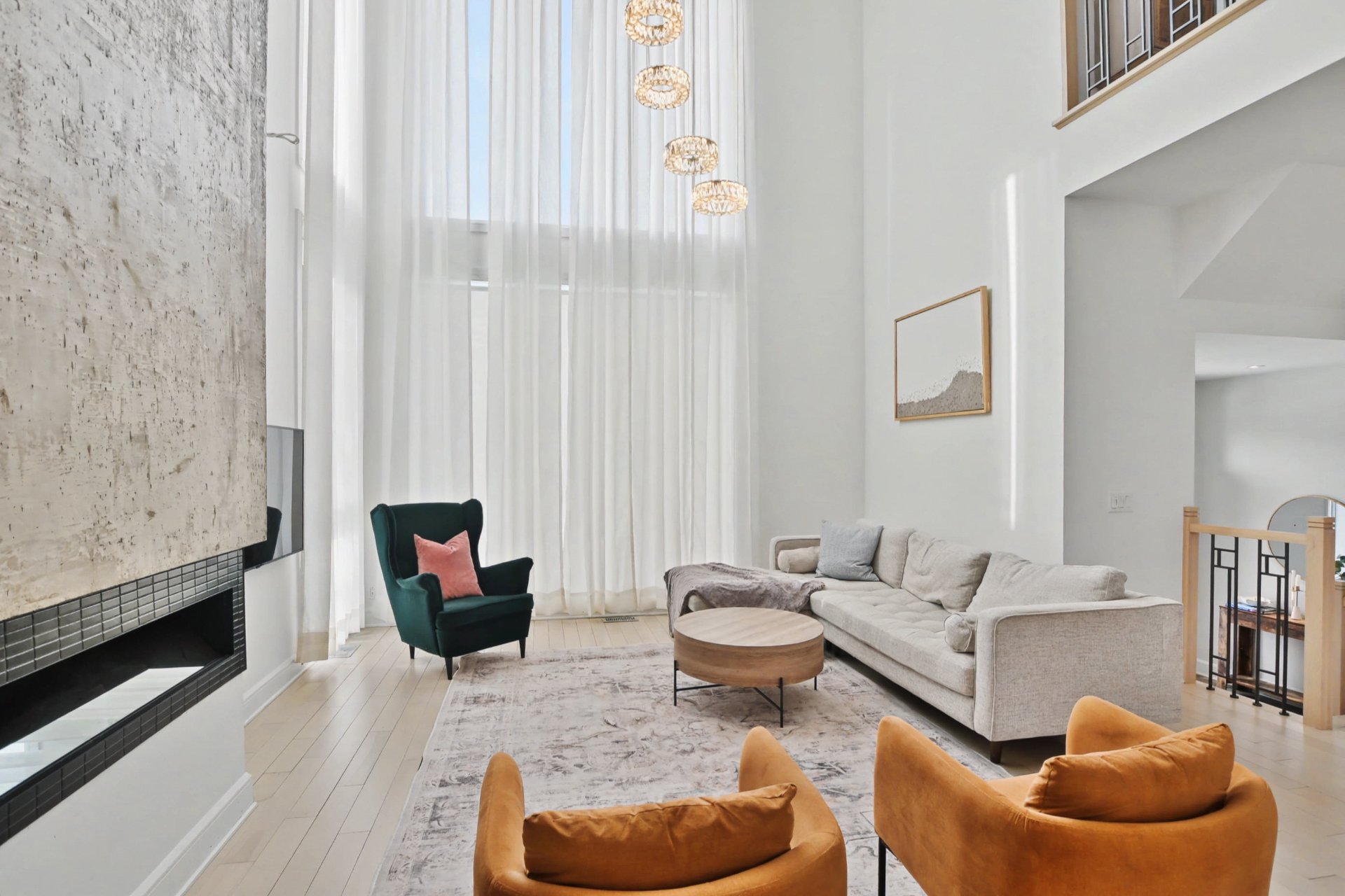 The open-concept main floor showcases a contemporary kitchen with ample storage and a spectacular living room with an 18-foot ceiling, creating an immediate wow factor.