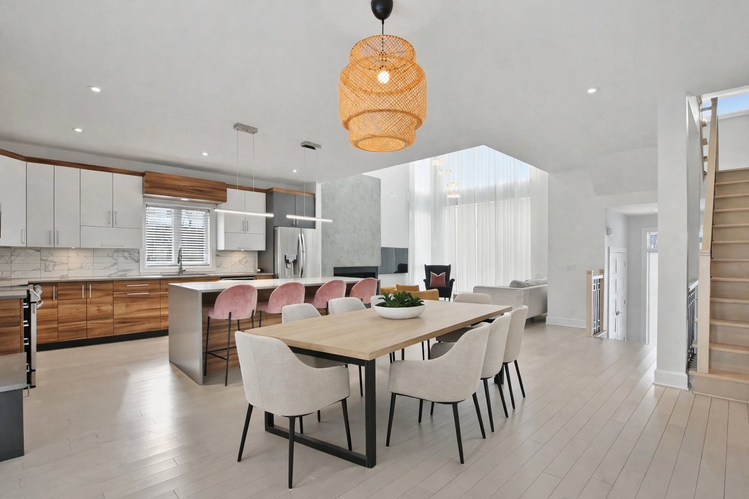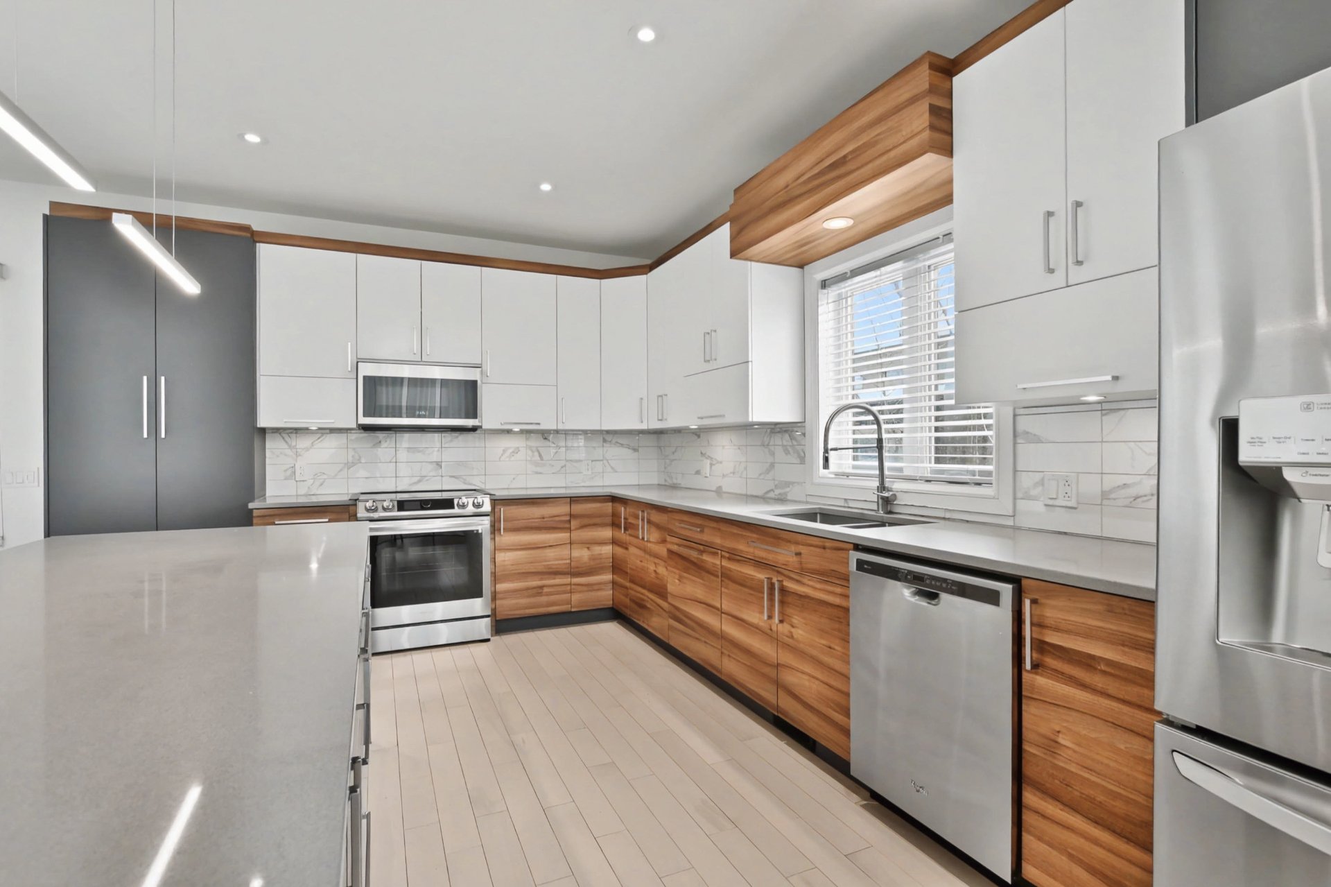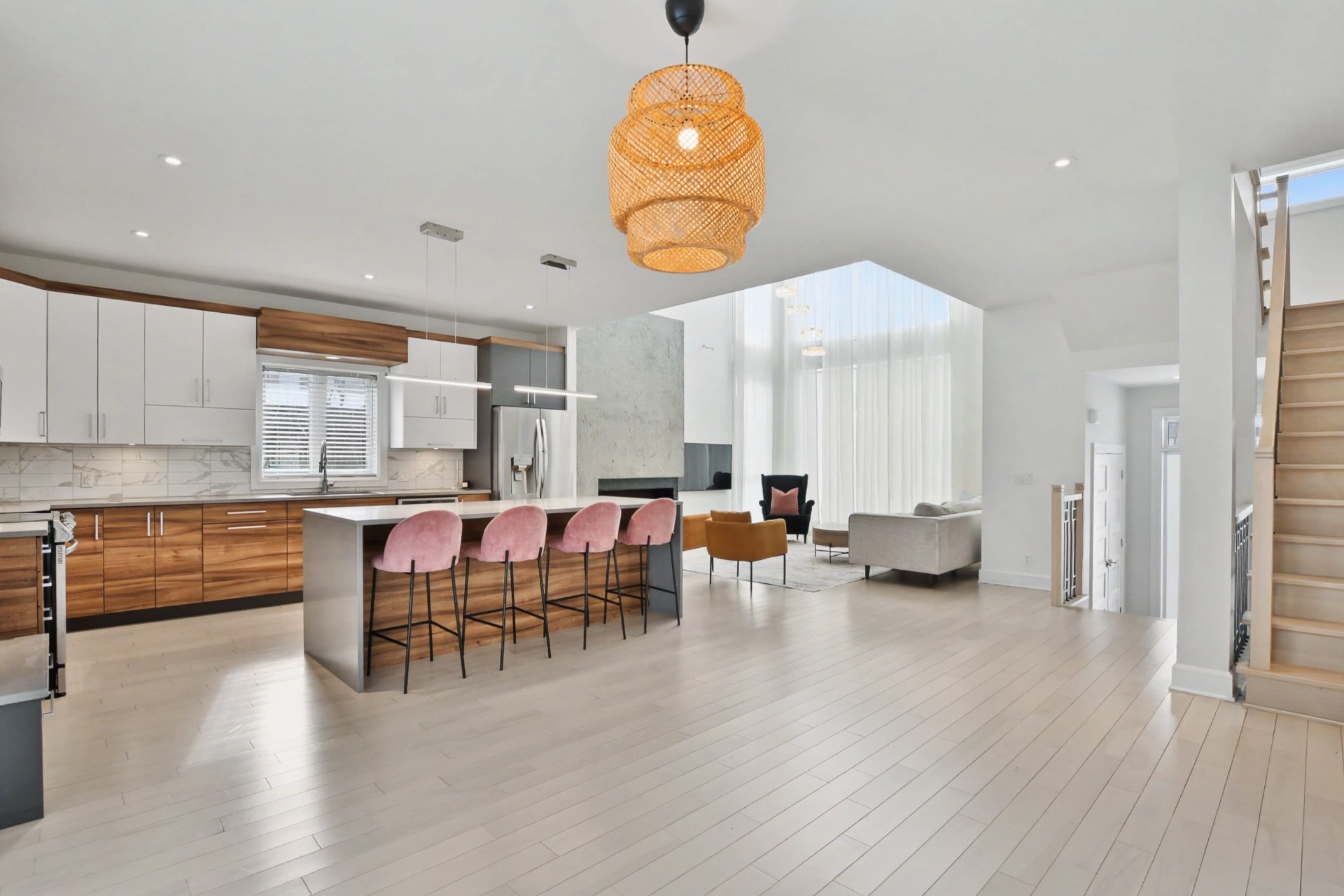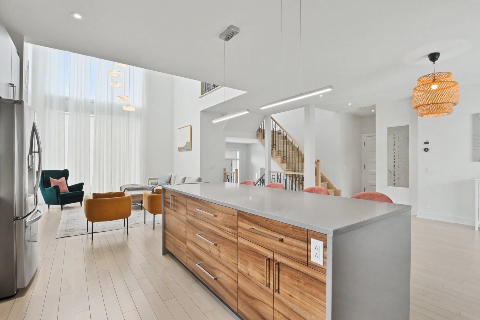 The open-concept main floor showcases a contemporary kitchen with ample storage and a spectacular living room with an 18-foot ceiling, creating an immediate wow factor.