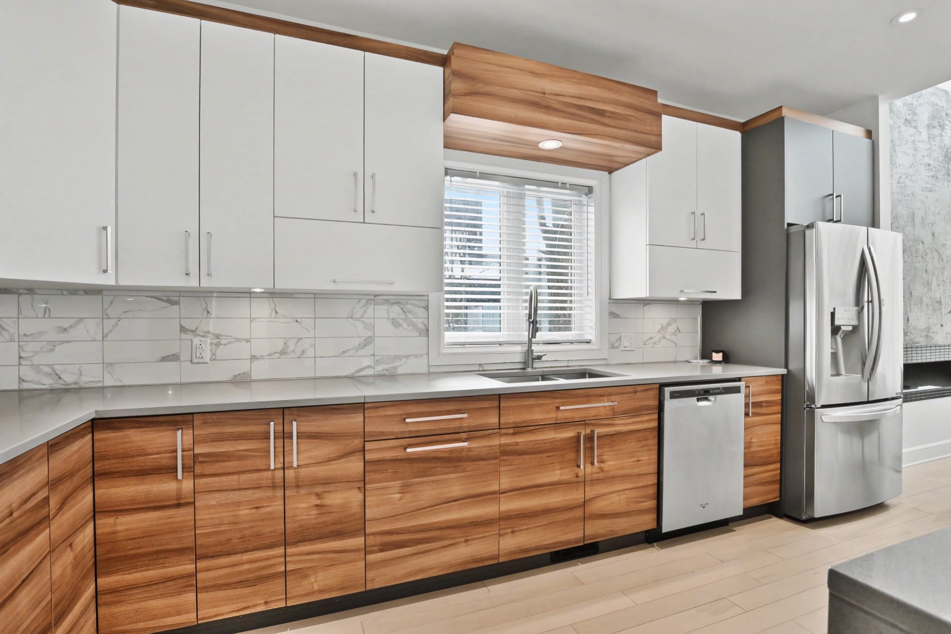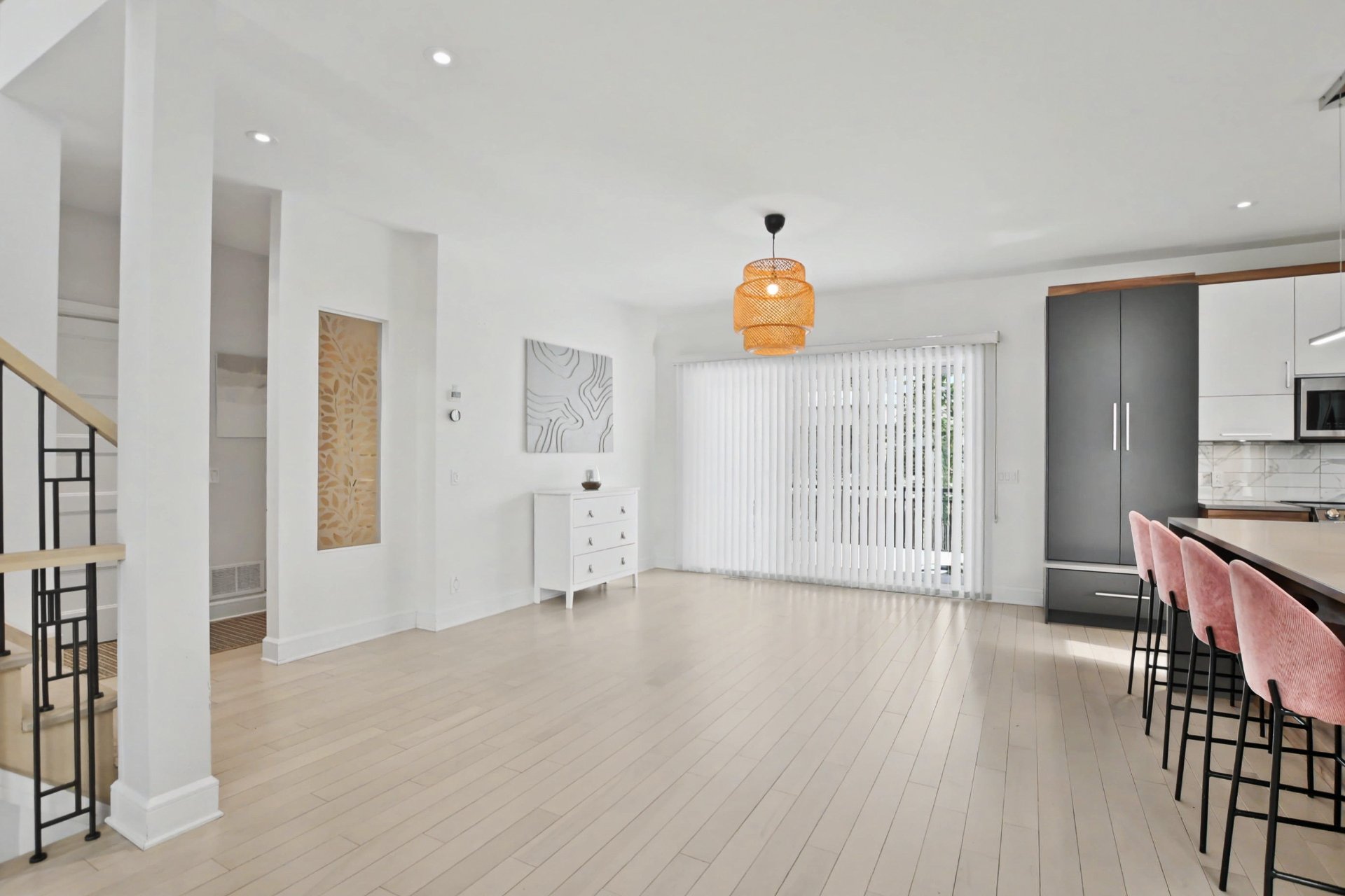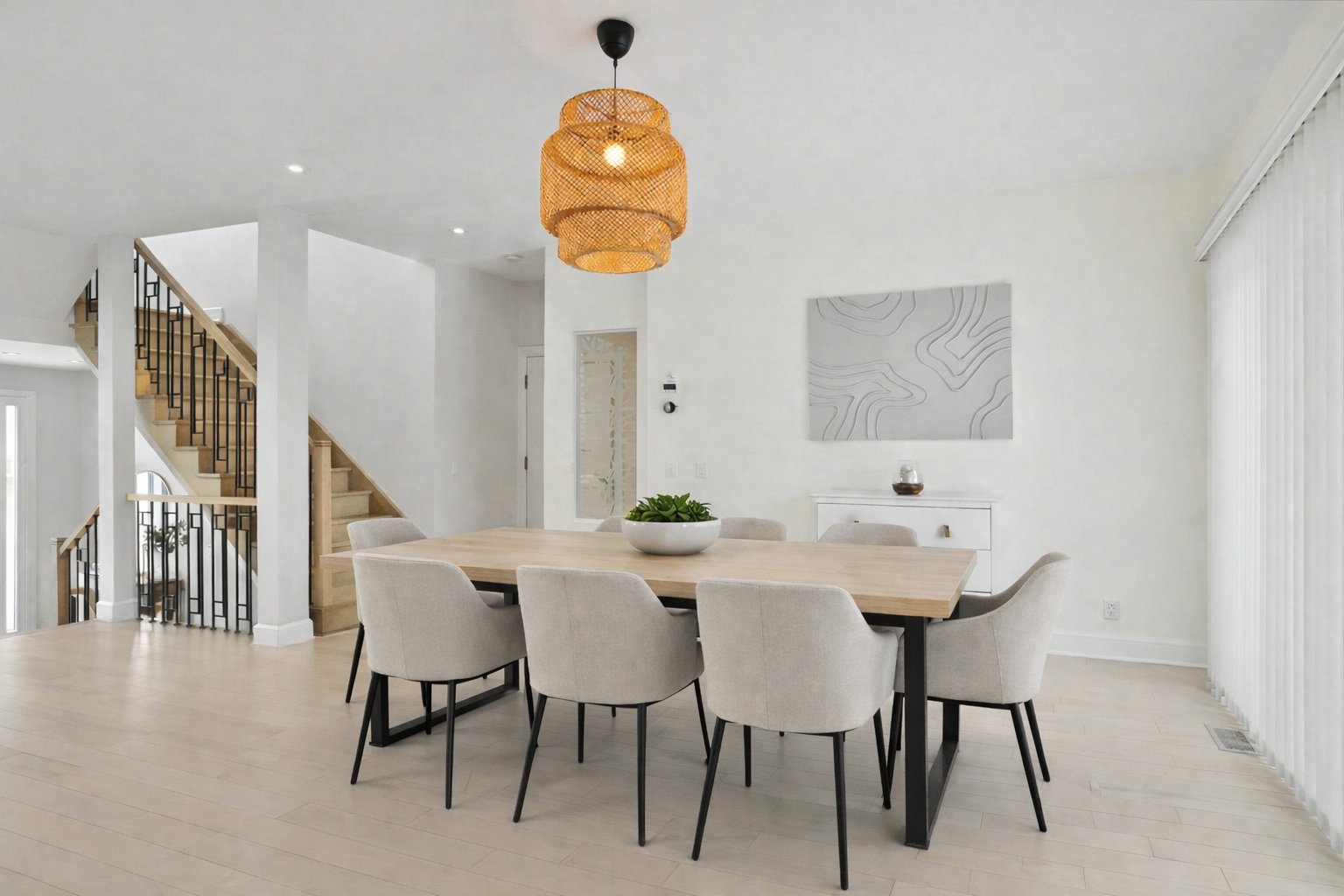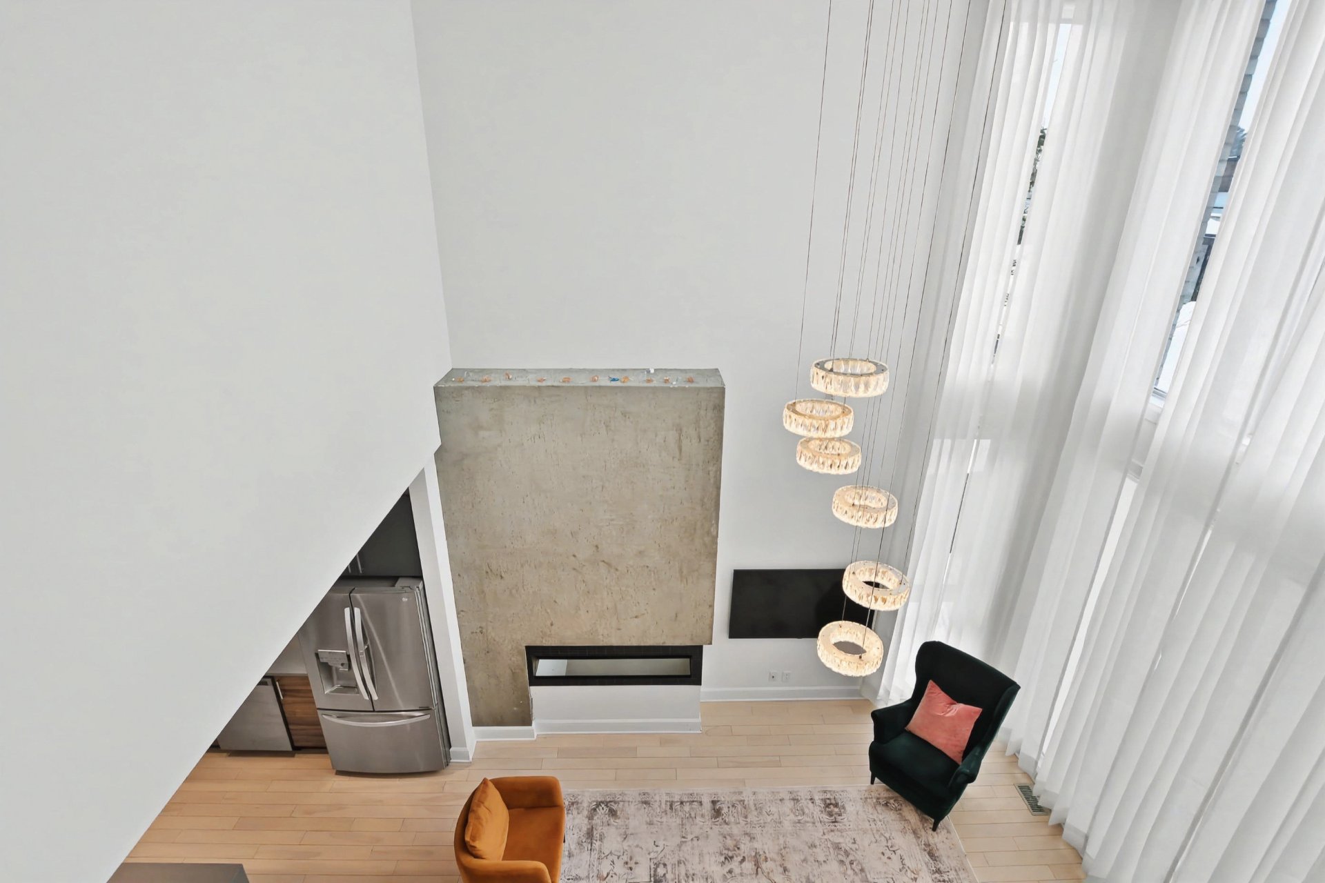 The open-concept main floor showcases a contemporary kitchen with ample storage and a spectacular living room with an 18-foot ceiling, creating an immediate wow factor.