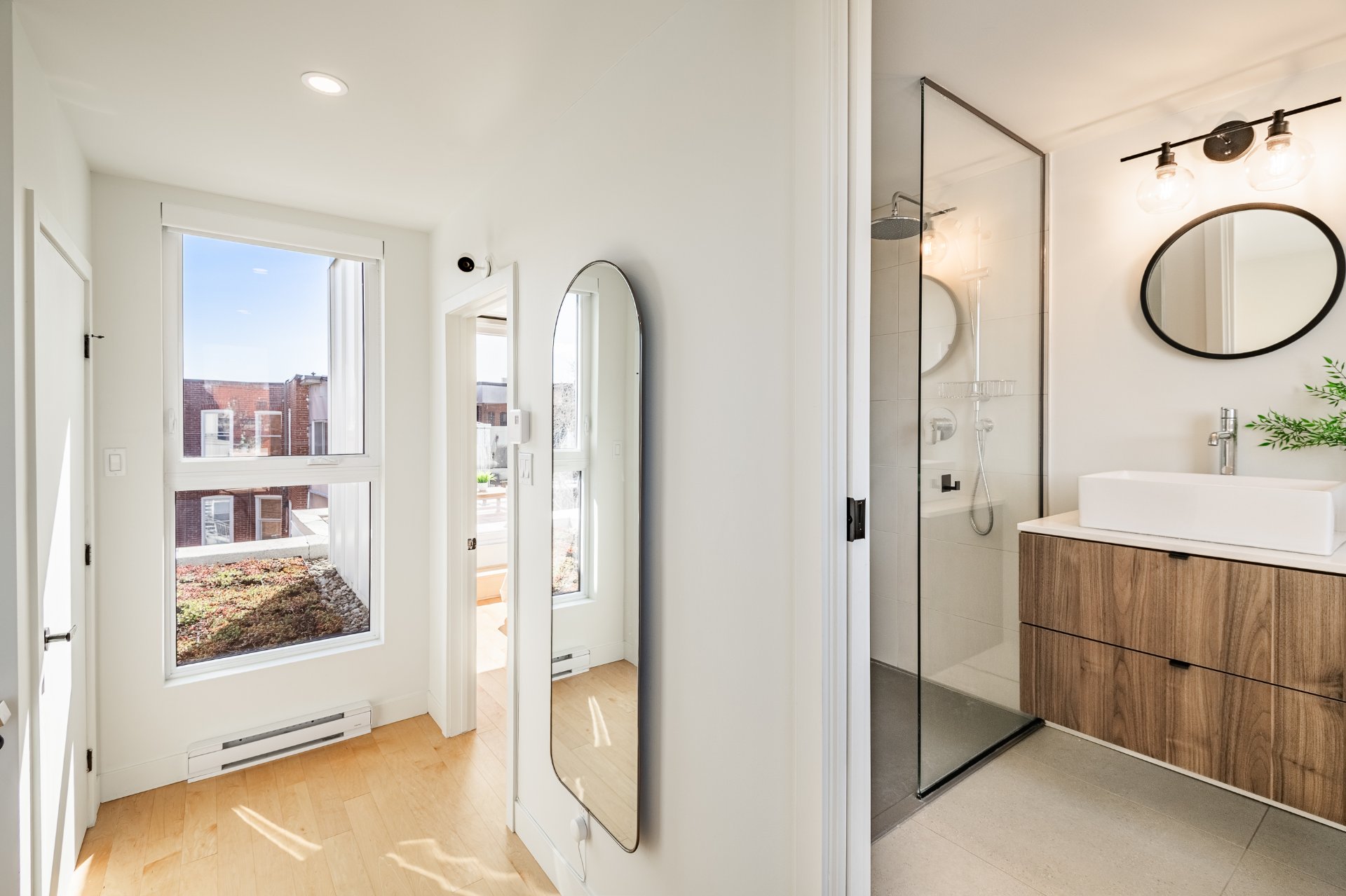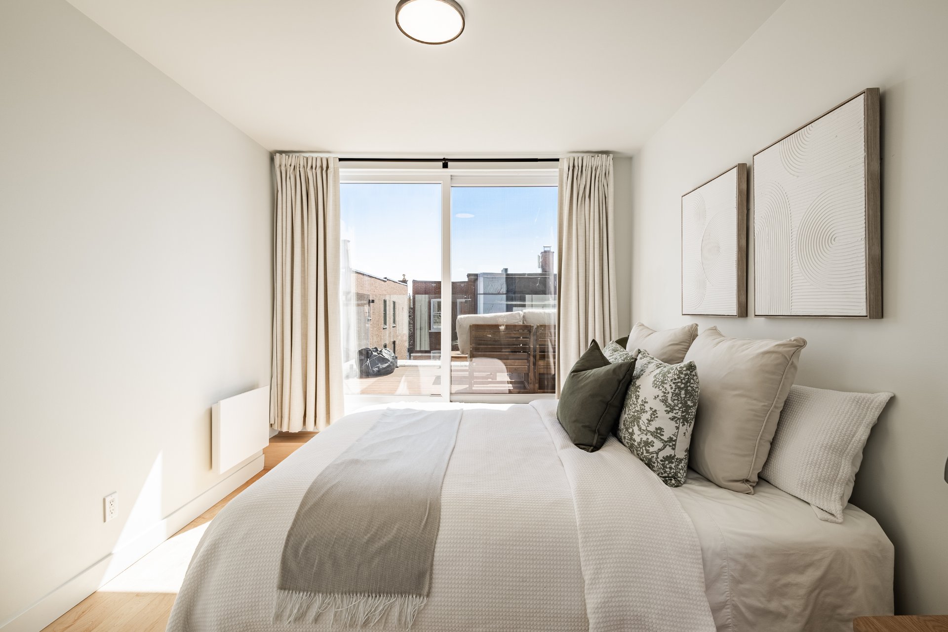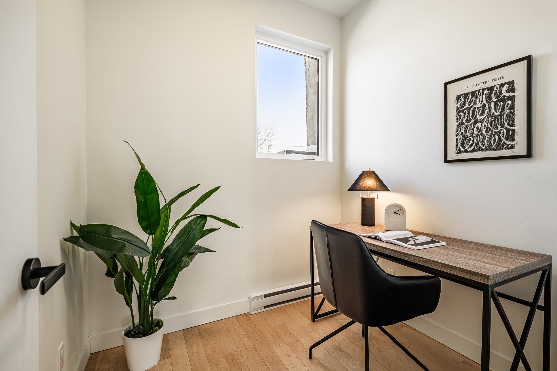 LE BERRI, a project by architect Maurice Martel. In the heart of Villeray in Montreal, stunning two-storey condo with 2 private terraces offering open views and optimal sunlight. Open-concept living space filled with natural light through generous windows. The unit features a home office area, living room with access to a first terrace, and a modern kitchen with quartz countertops. Two bedrooms + an office including a mezzanine primary suite with walk-in closet and ensuite bathroom. Two bathrooms in total. Close to Montreal Metro Jarry station, the park, bike paths, and all services.