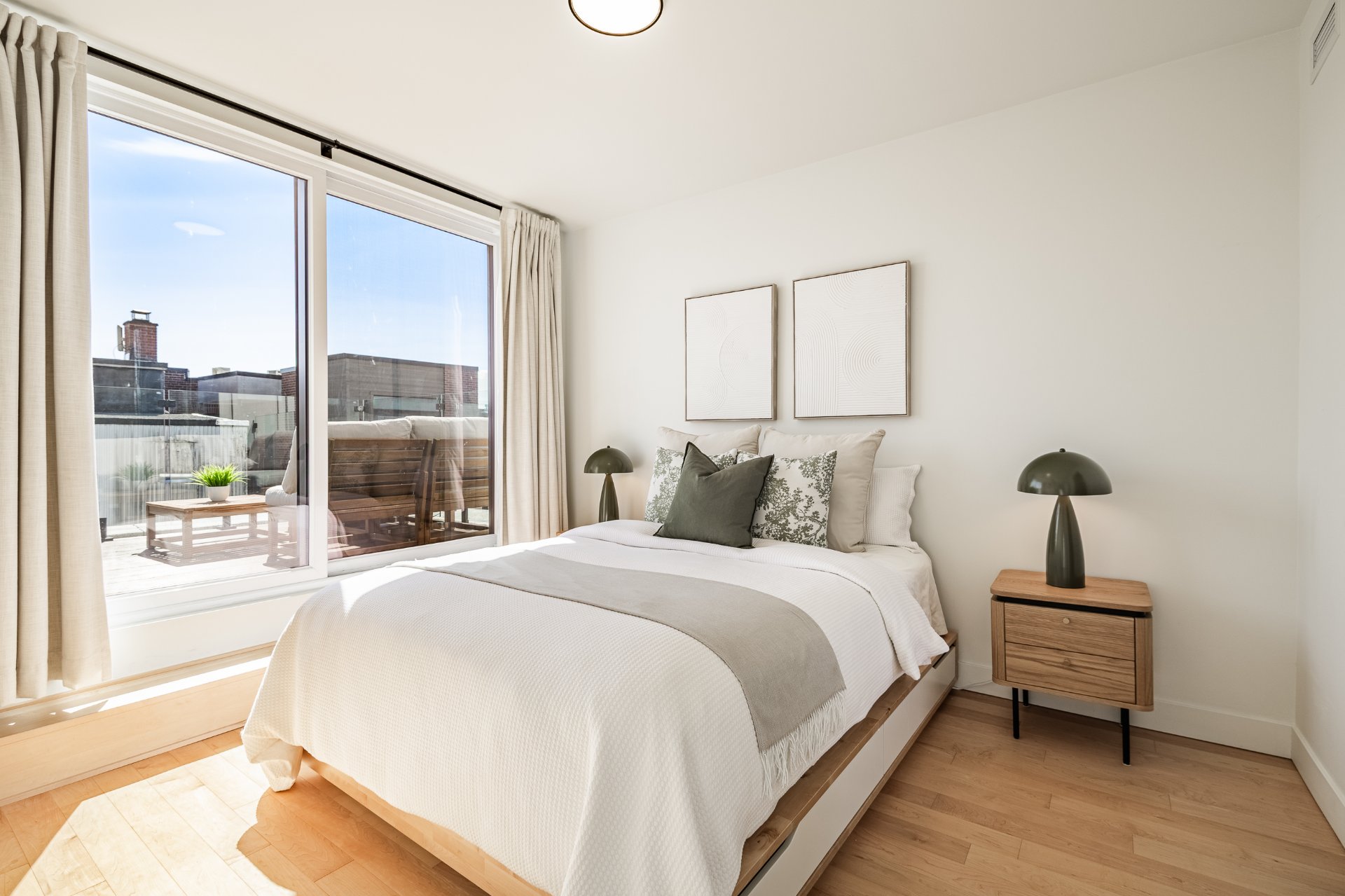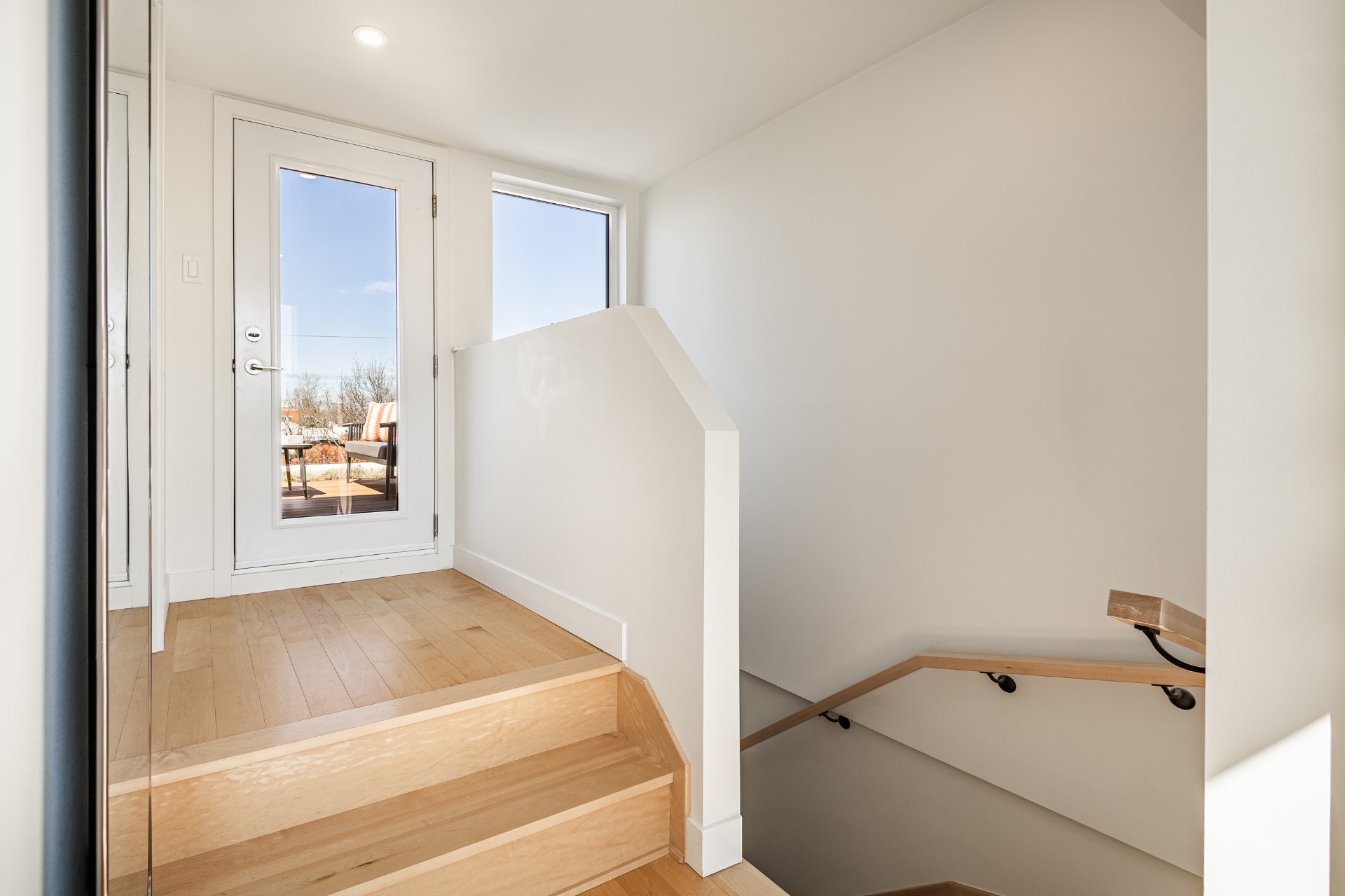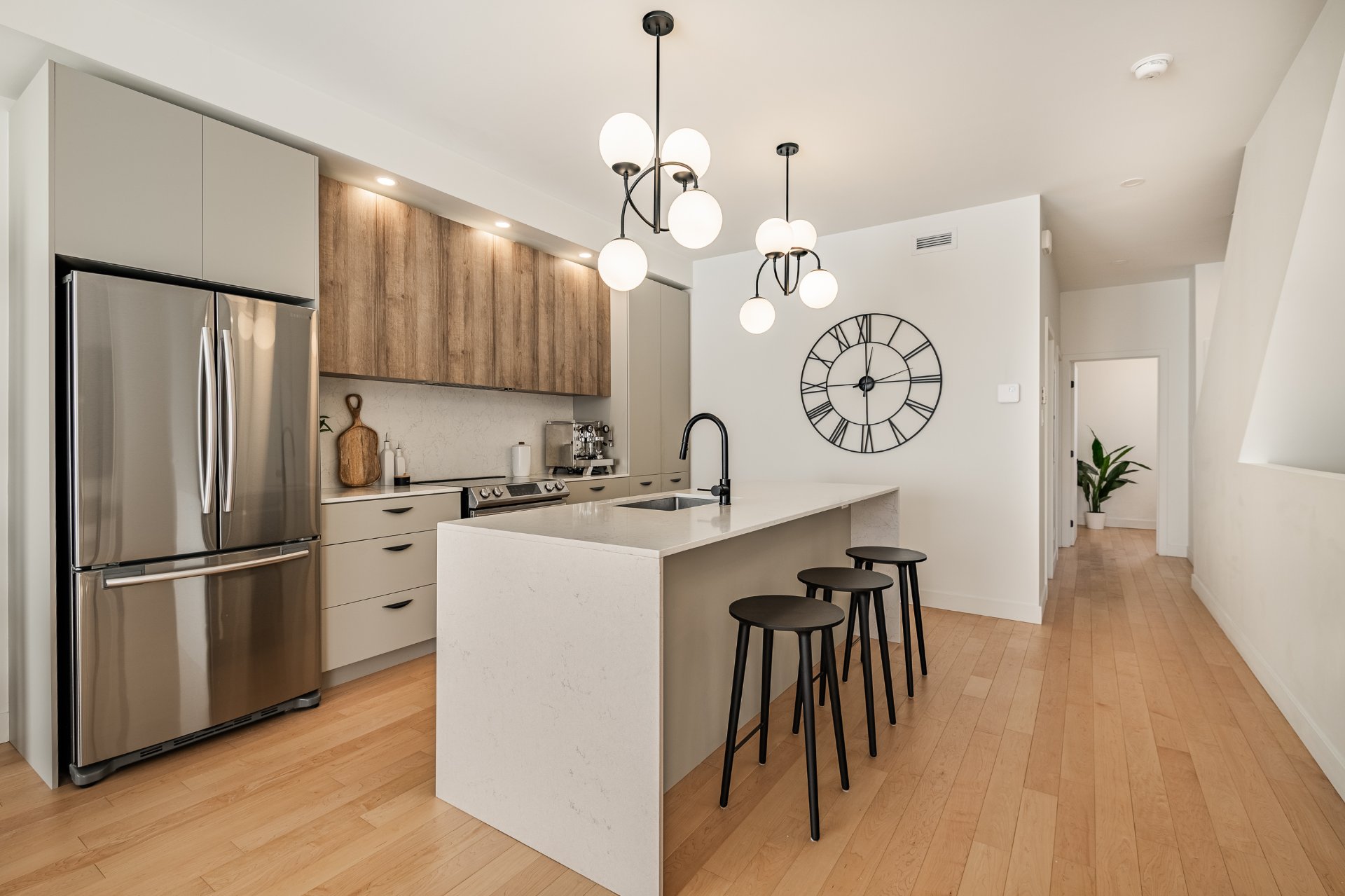LE BERRI, a project by architect Maurice Martel. In the heart of Villeray in Montreal, stunning two-storey condo with 2 private terraces offering open views and optimal sunlight. Open-concept living space filled with natural light through generous windows. The unit features a home office area, living room with access to a first terrace, and a modern kitchen with quartz countertops. Two bedrooms + an office including a mezzanine primary suite with walk-in closet and ensuite bathroom. Two bathrooms in total. Close to Montreal Metro Jarry station, the park, bike paths, and all services.