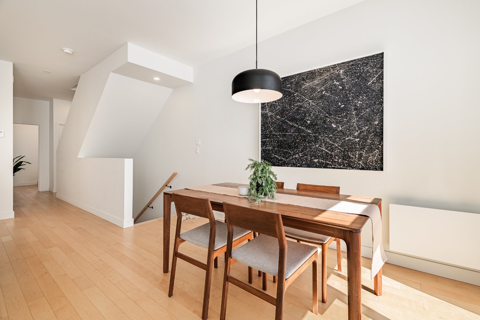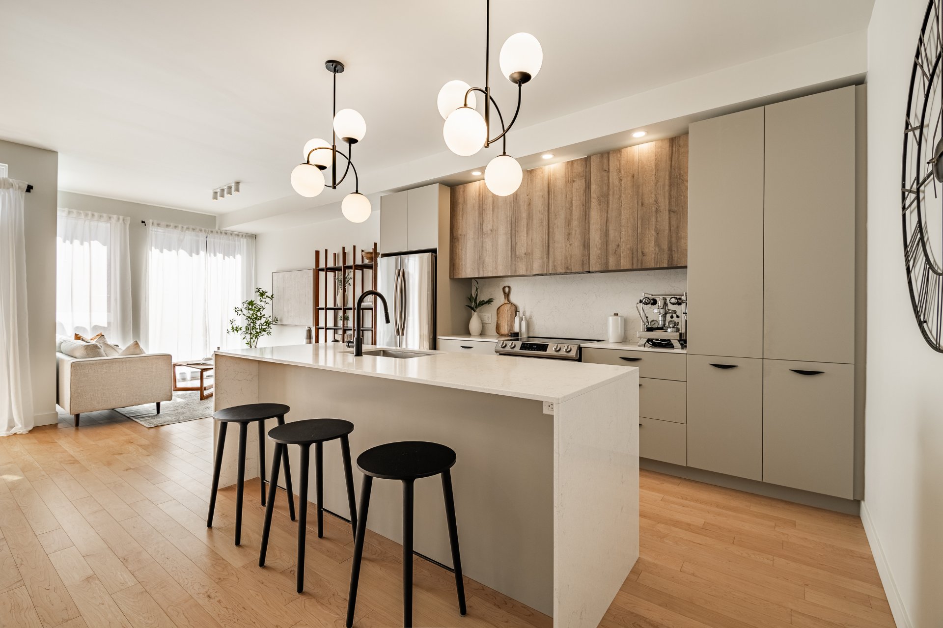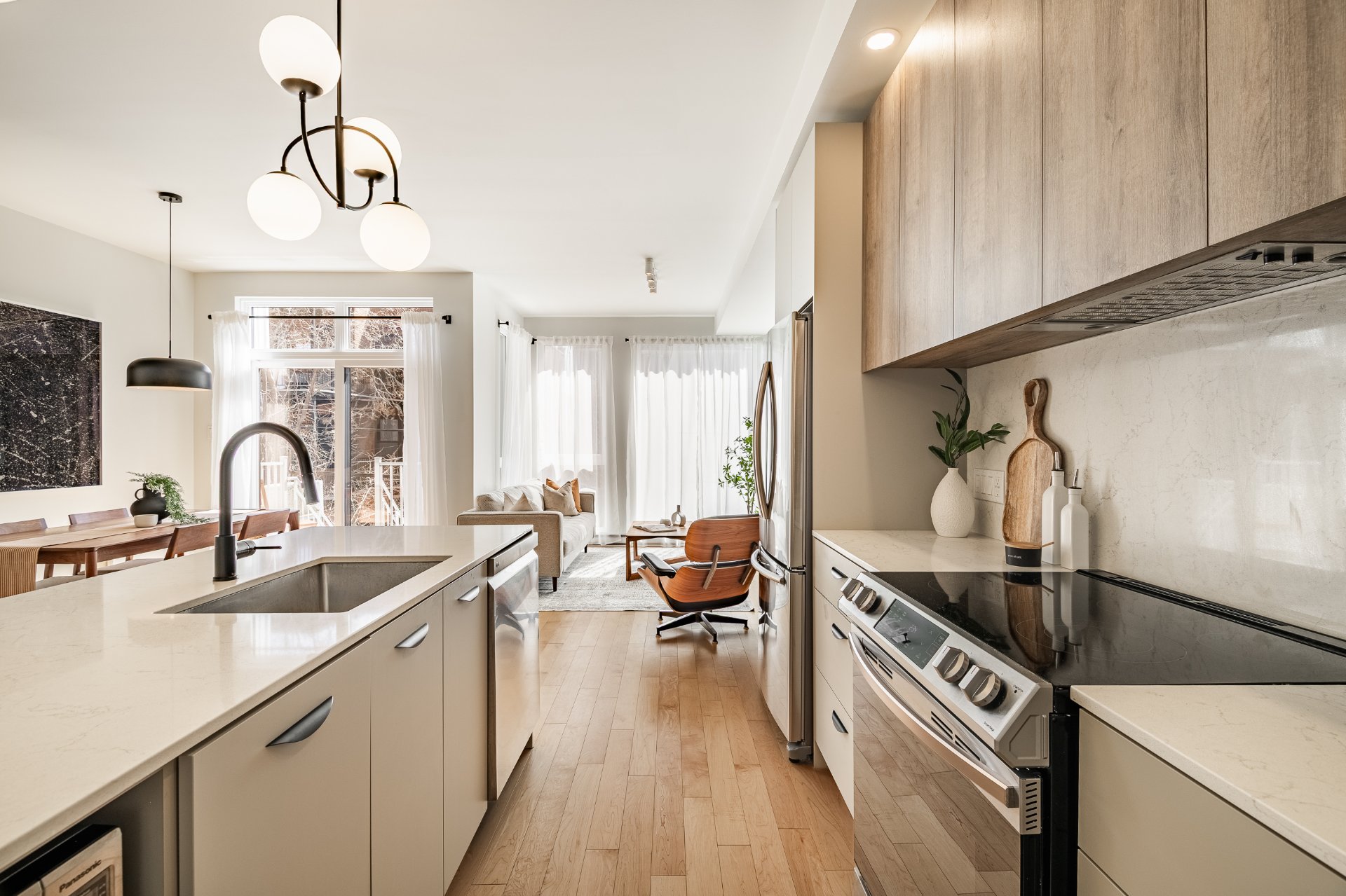 The two-tone kitchen stands out with quality materials: quartz countertops and backsplash, full-height cabinetry, and a breakfast counter with seating for three. The dining area, elegant and well proportioned, is perfectly suited for entertaining.
