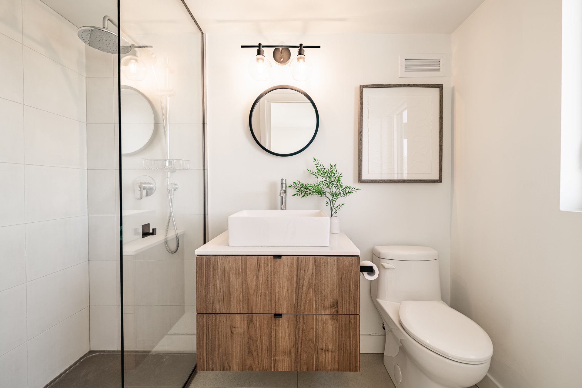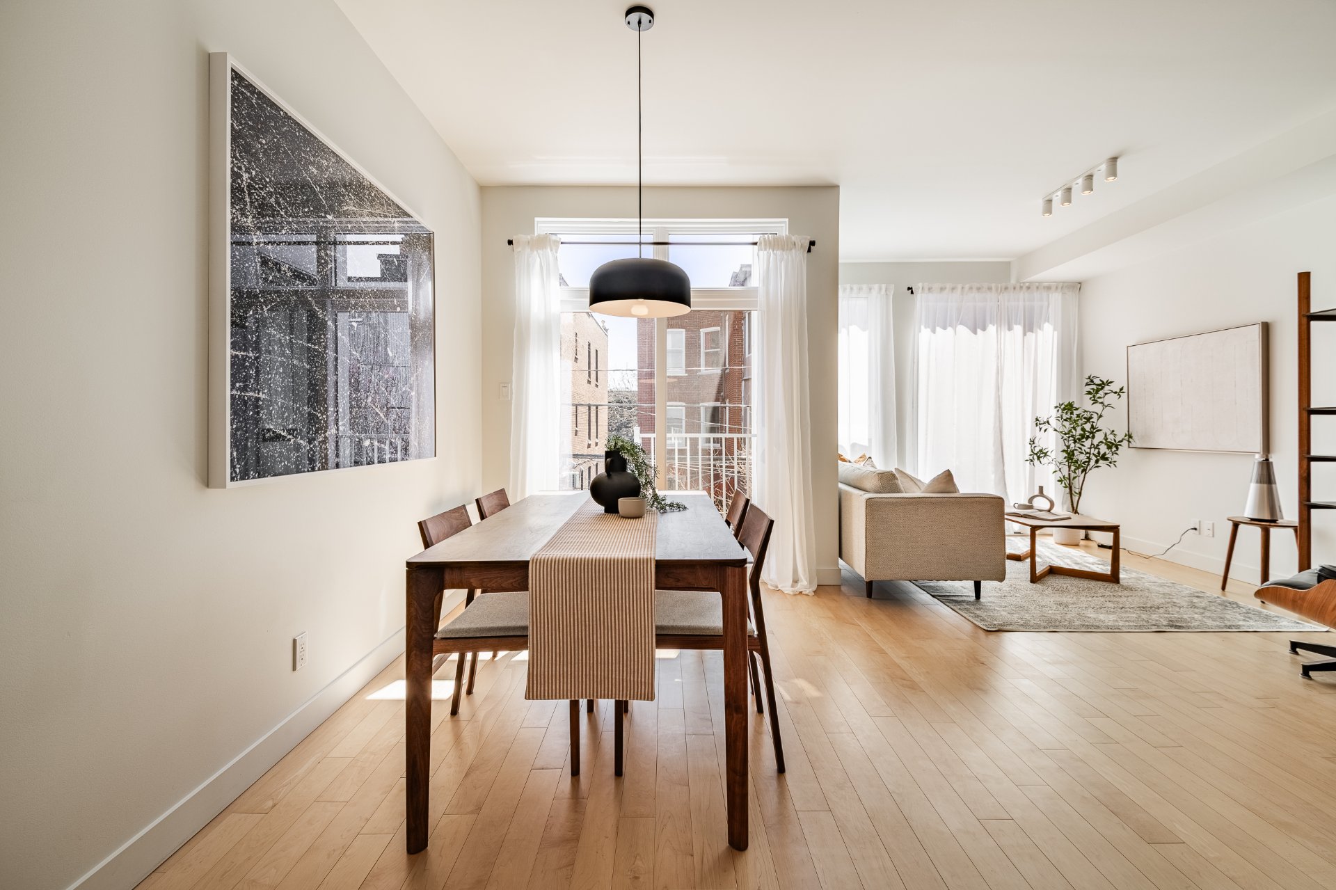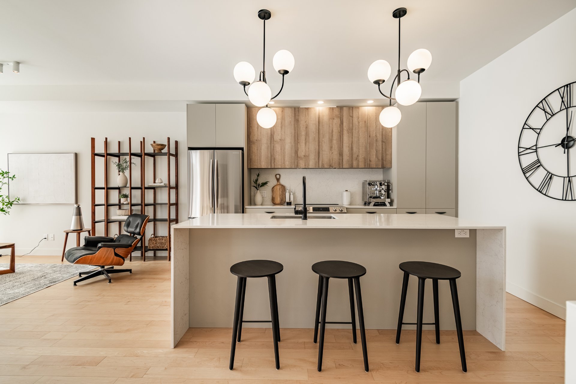 The two-tone kitchen stands out with quality materials: quartz countertops and backsplash, full-height cabinetry, and a breakfast counter with seating for three. The dining area, elegant and well proportioned, is perfectly suited for entertaining.