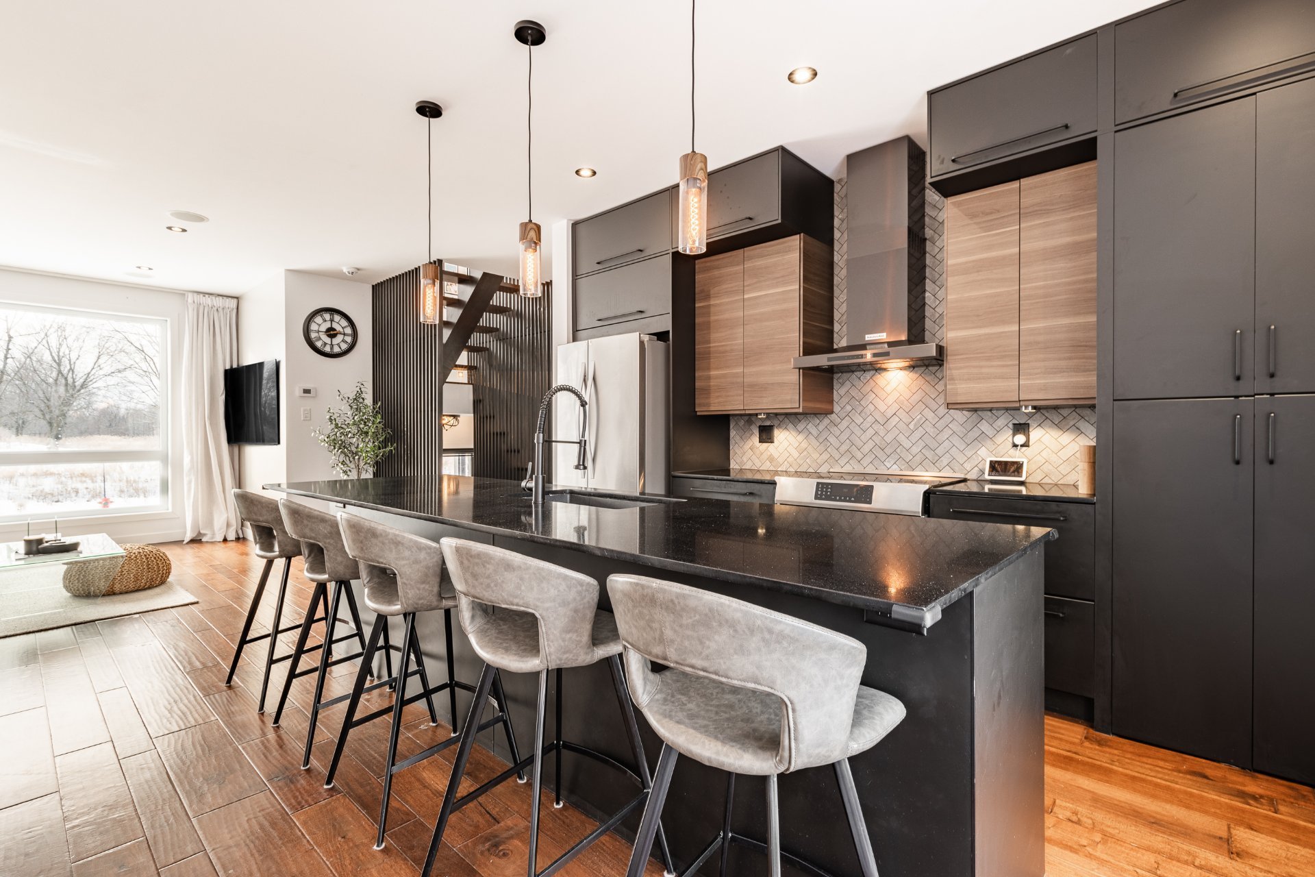 + Kitchen with granit island for 5, full-height cabinetry and herringbone backsplash with Pantry room