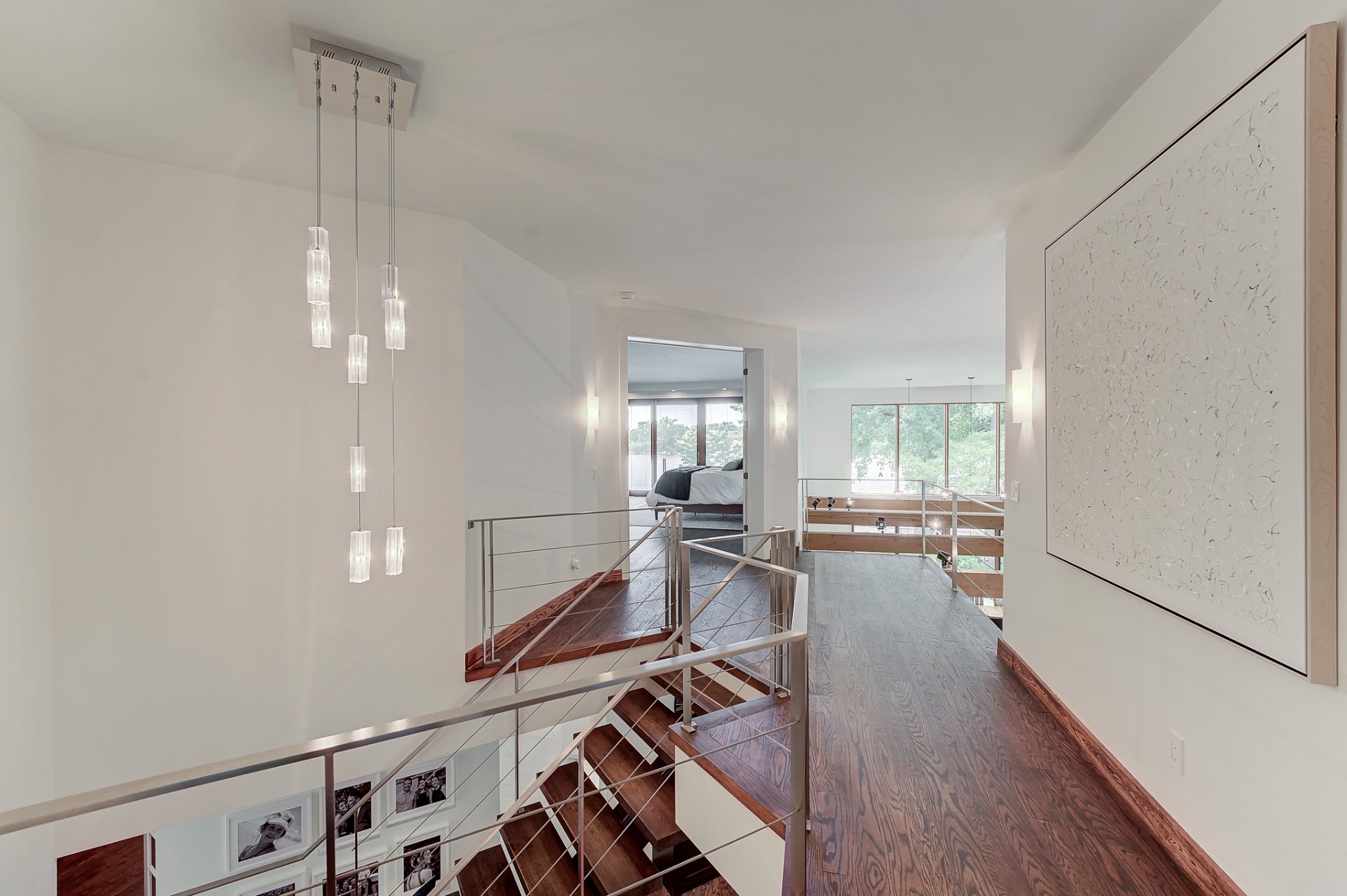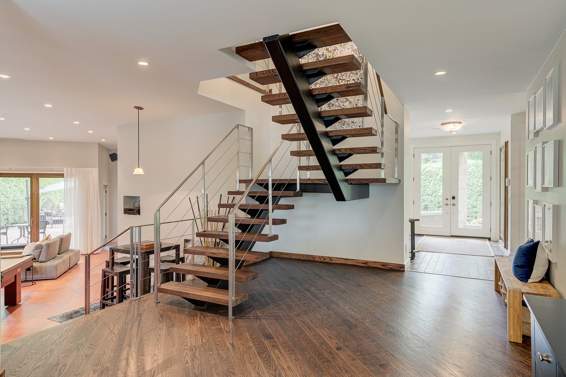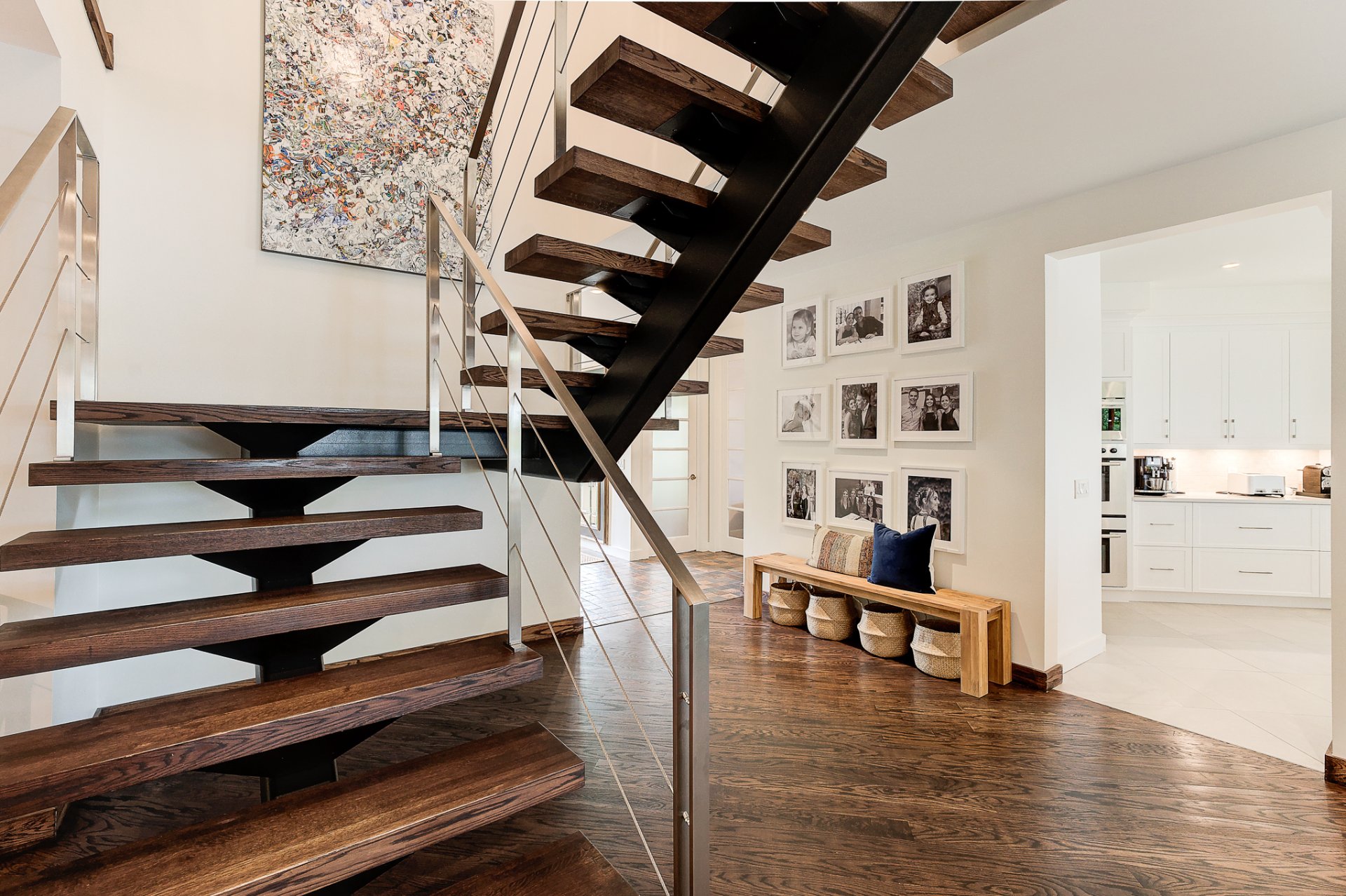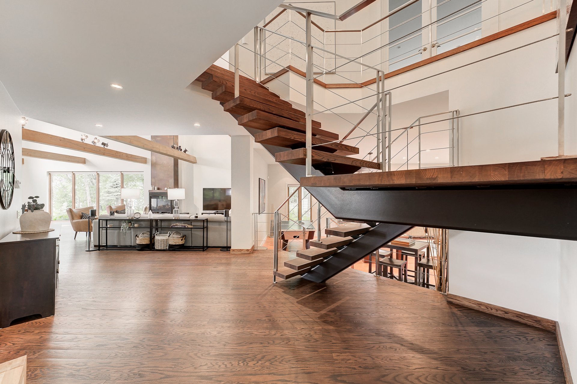 The spectacular central wooden staircase with stainless steel railing leads to the bedrooms upstairs.