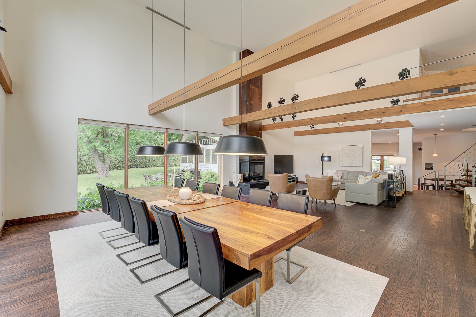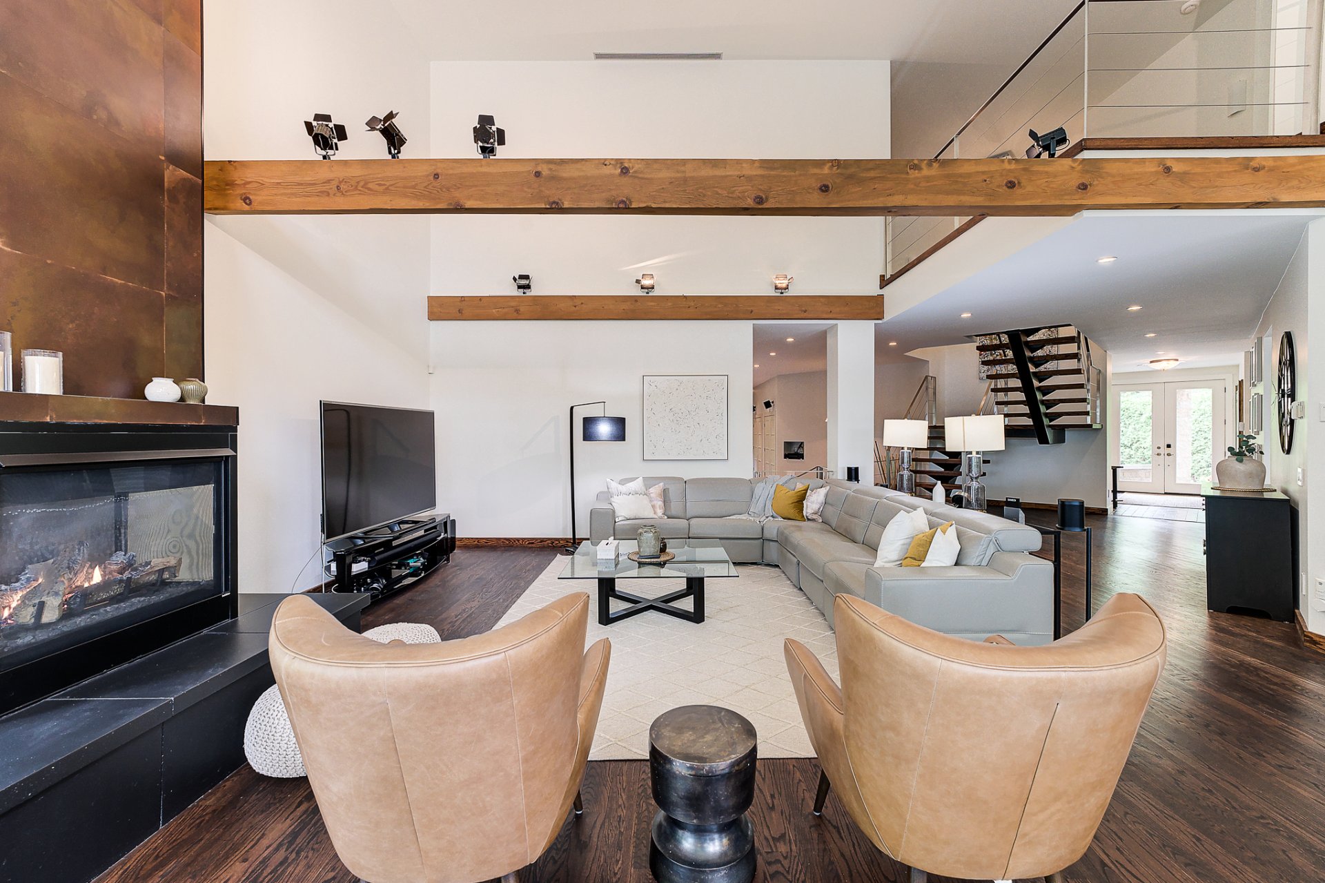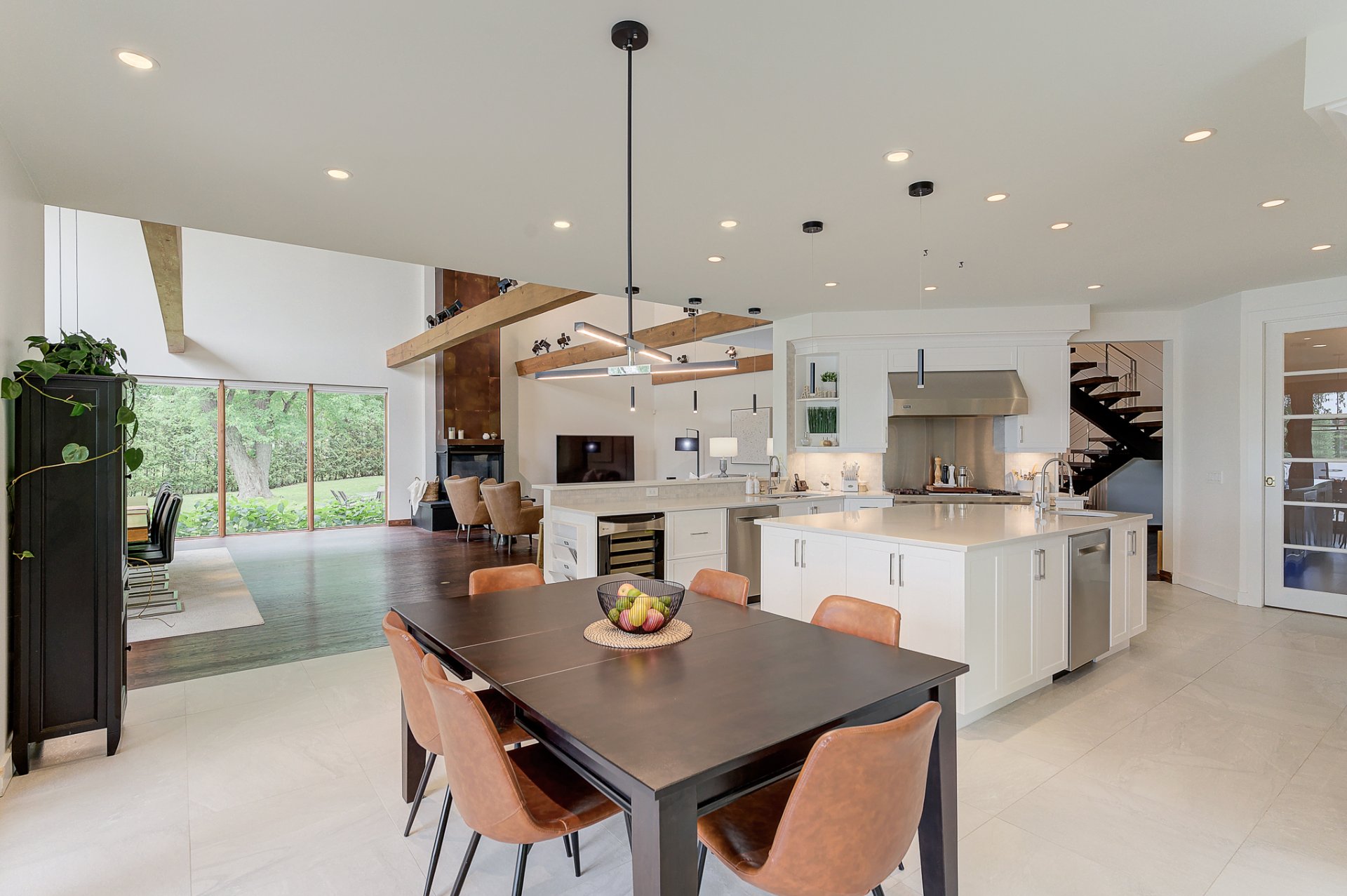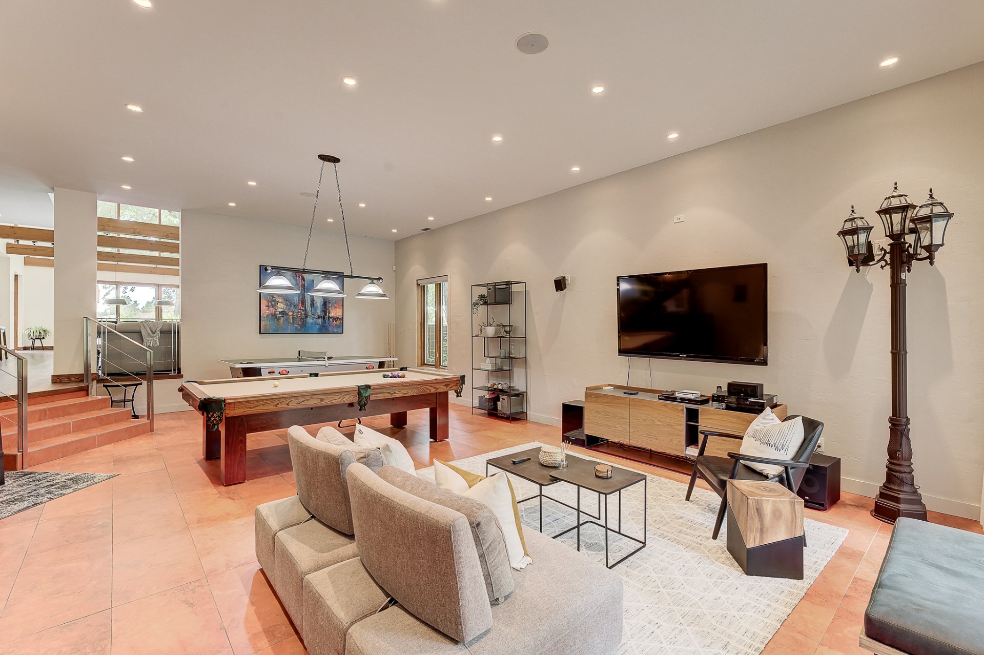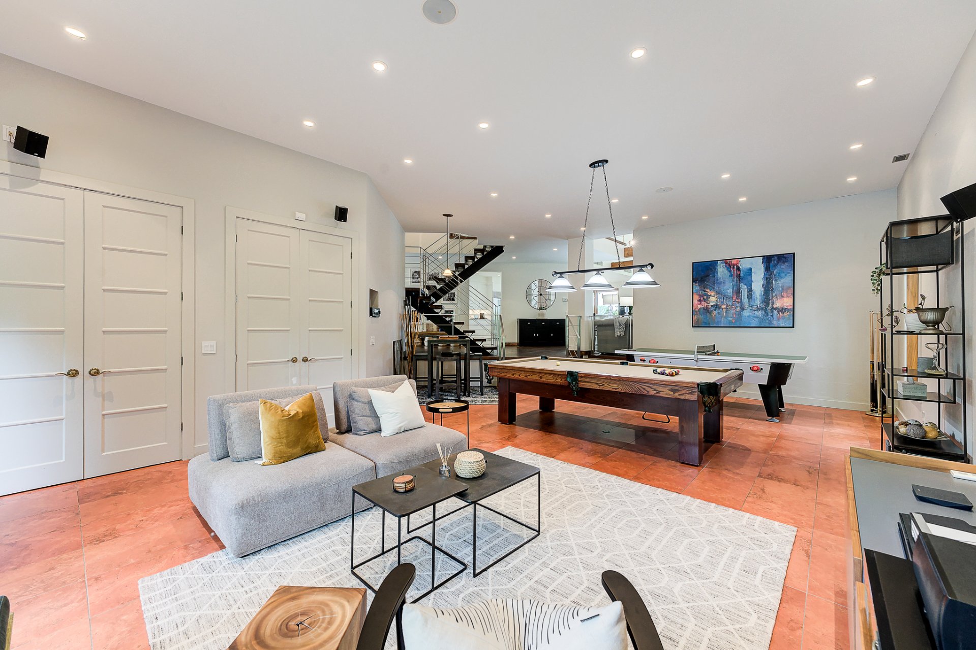 The main floor offers a feeling of grandeur with its cathedral ceiling and exposed beams. The open concept allows for easy flow between the large game room, the more formal living room, the large dining room that can accommodate several guests, and the kitchen with a central island, walk-in pantry, breakfast nook, and high-end appliances including a gas cooktop, two built-in ovens, and two dishwashers.