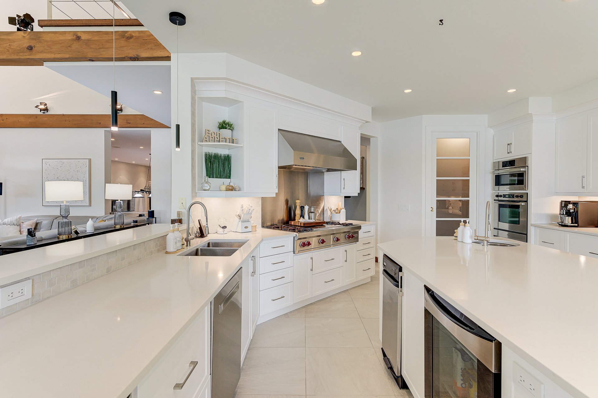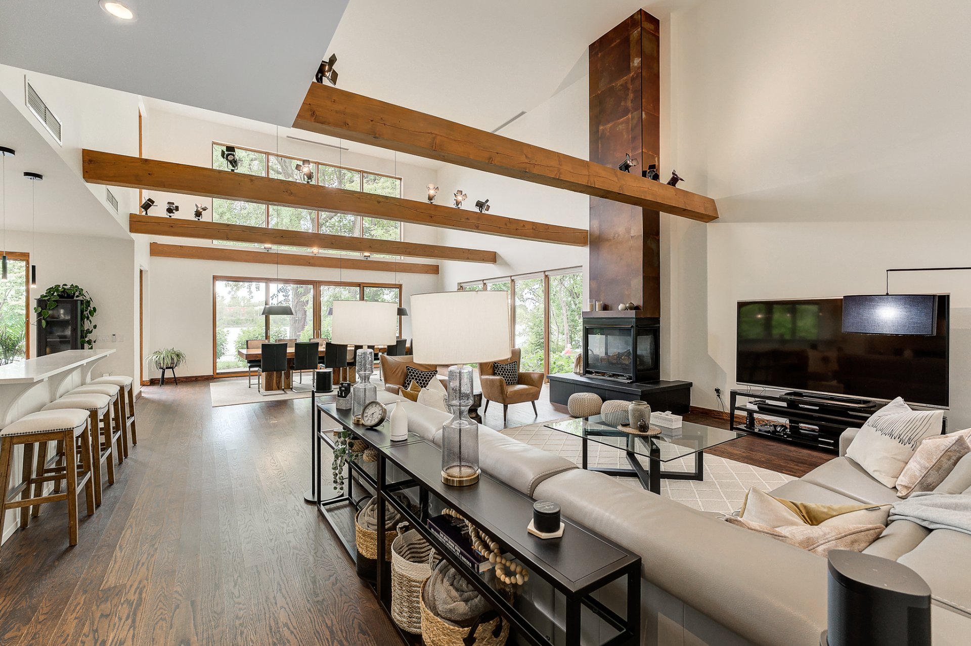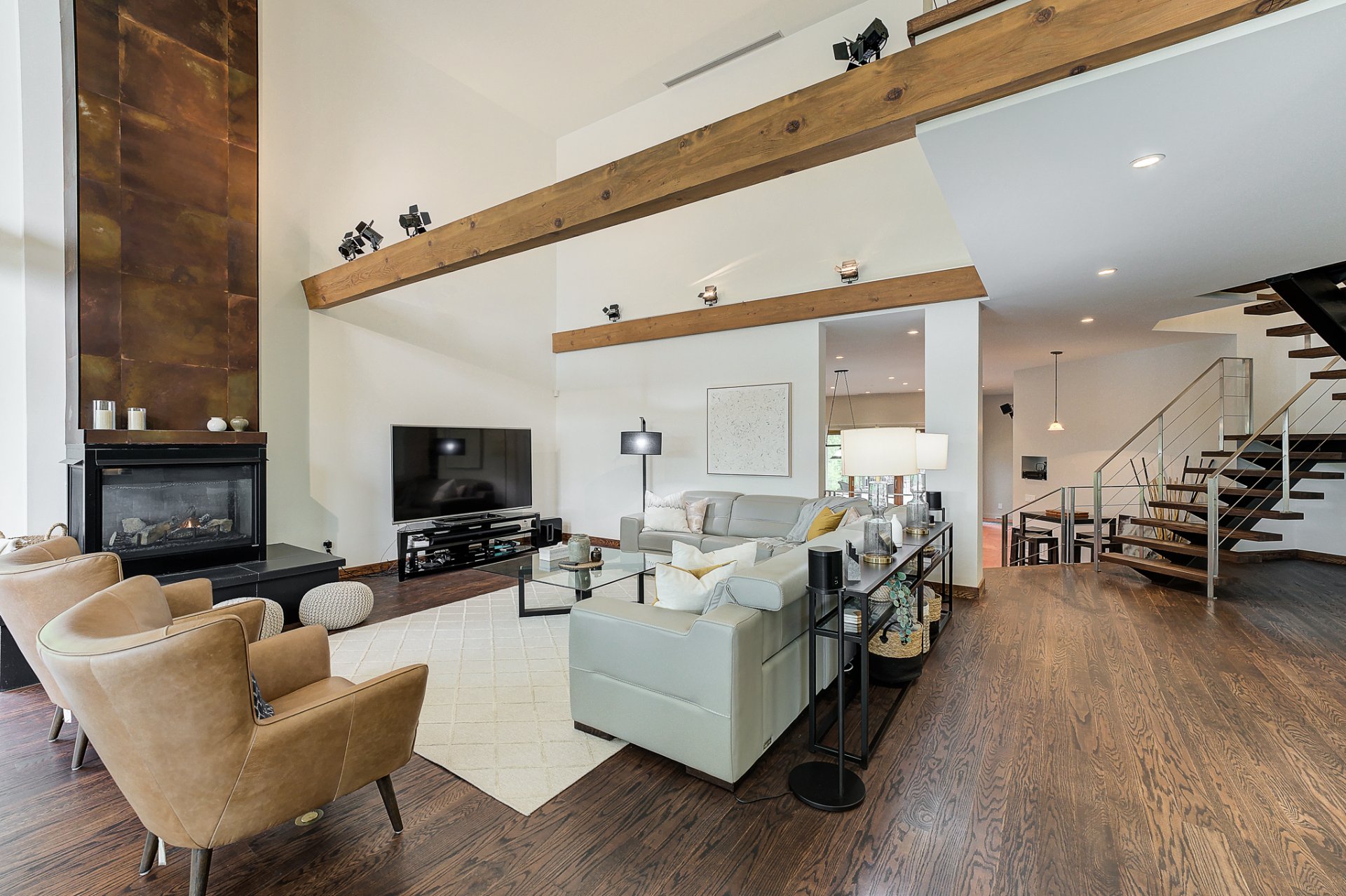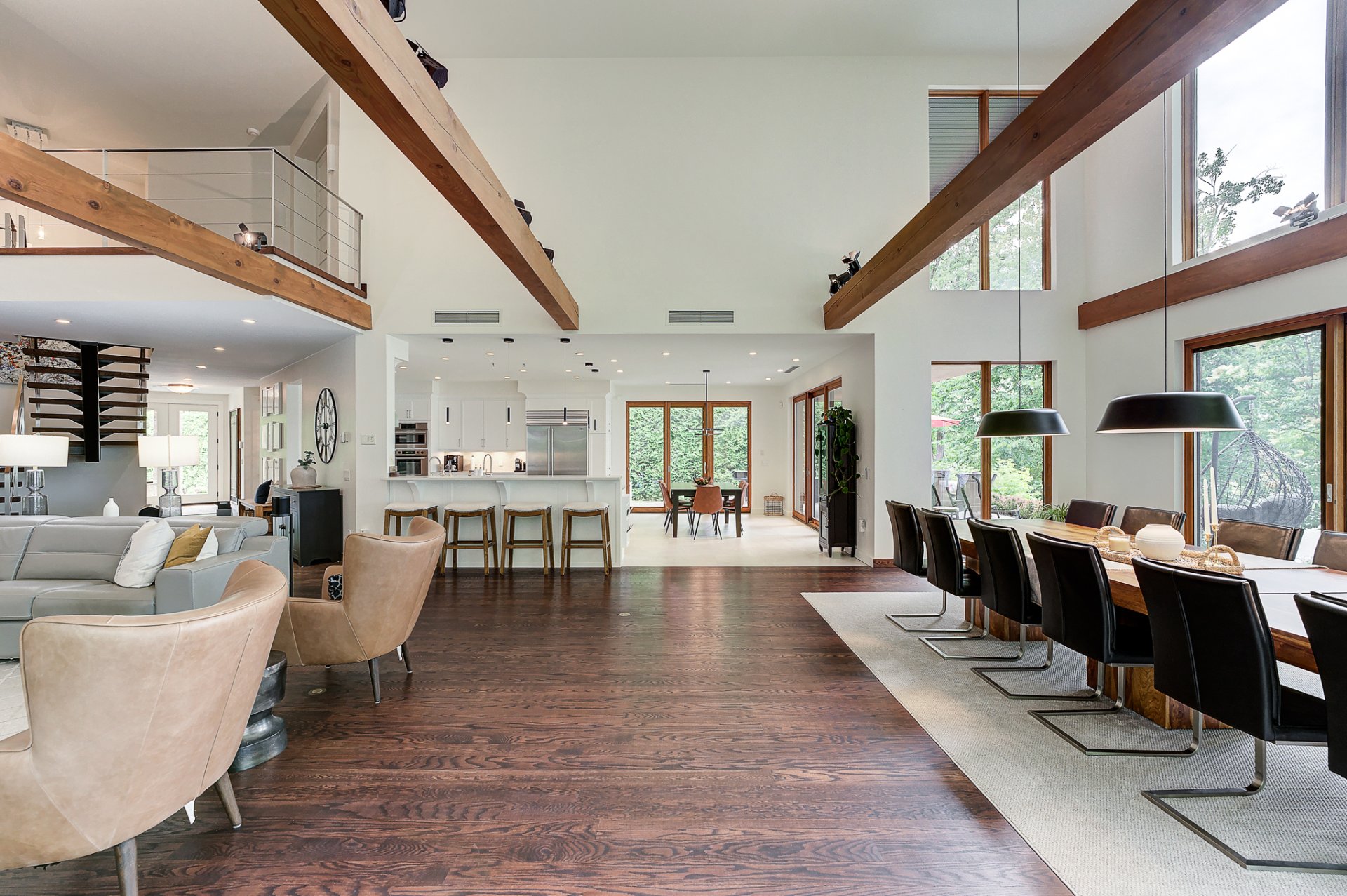 The main floor offers a feeling of grandeur with its cathedral ceiling and exposed beams. The open concept allows for easy flow between the large game room, the more formal living room, the large dining room that can accommodate several guests, and the kitchen with a central island, walk-in pantry, breakfast nook, and high-end appliances including a gas cooktop, two built-in ovens, and two dishwashers.
