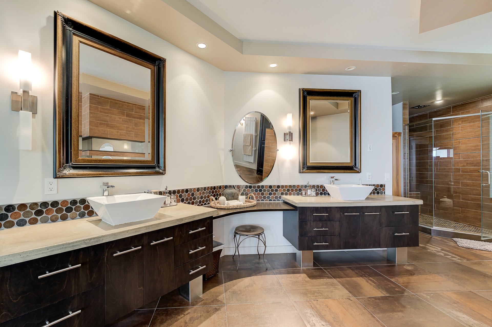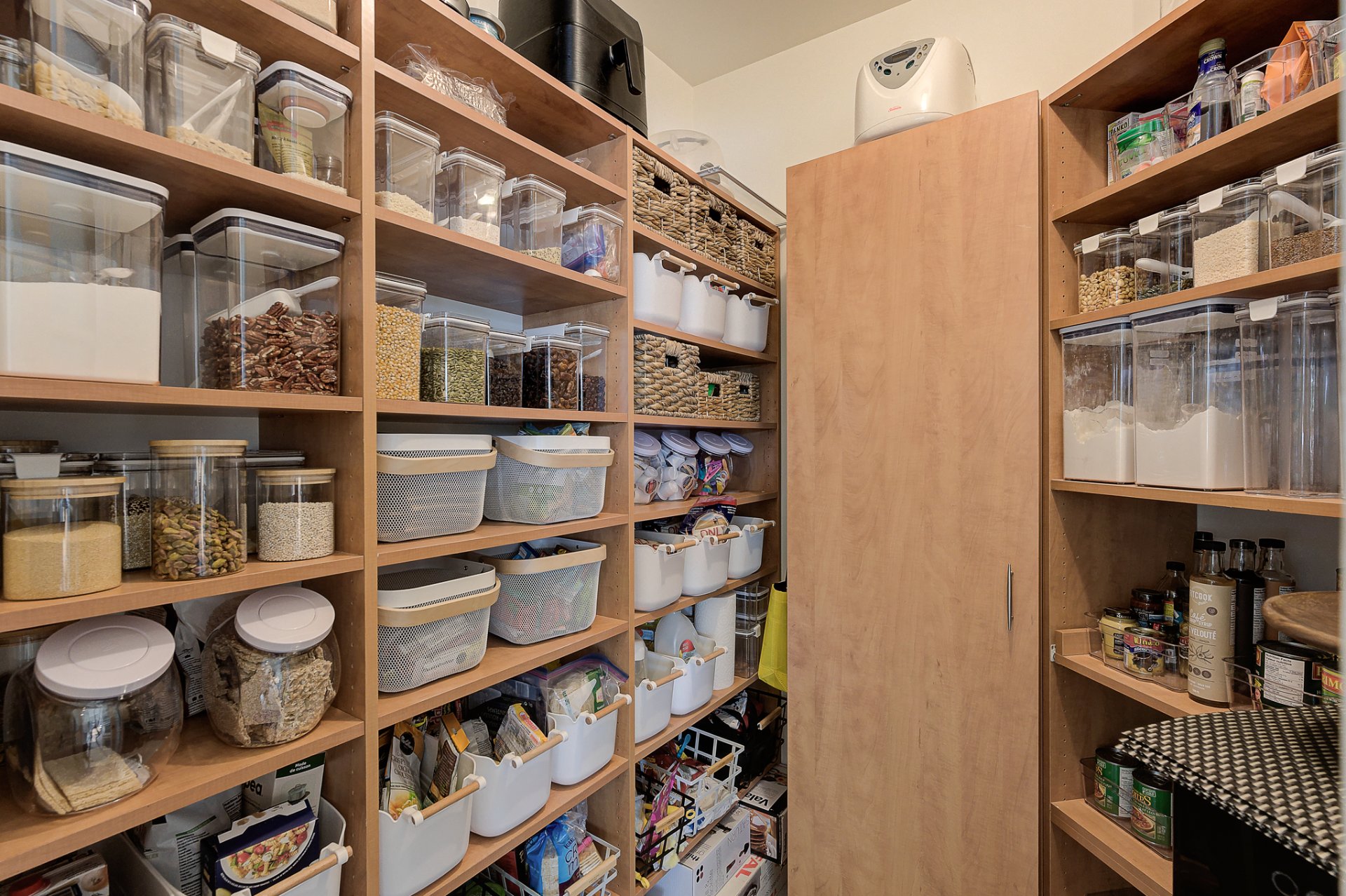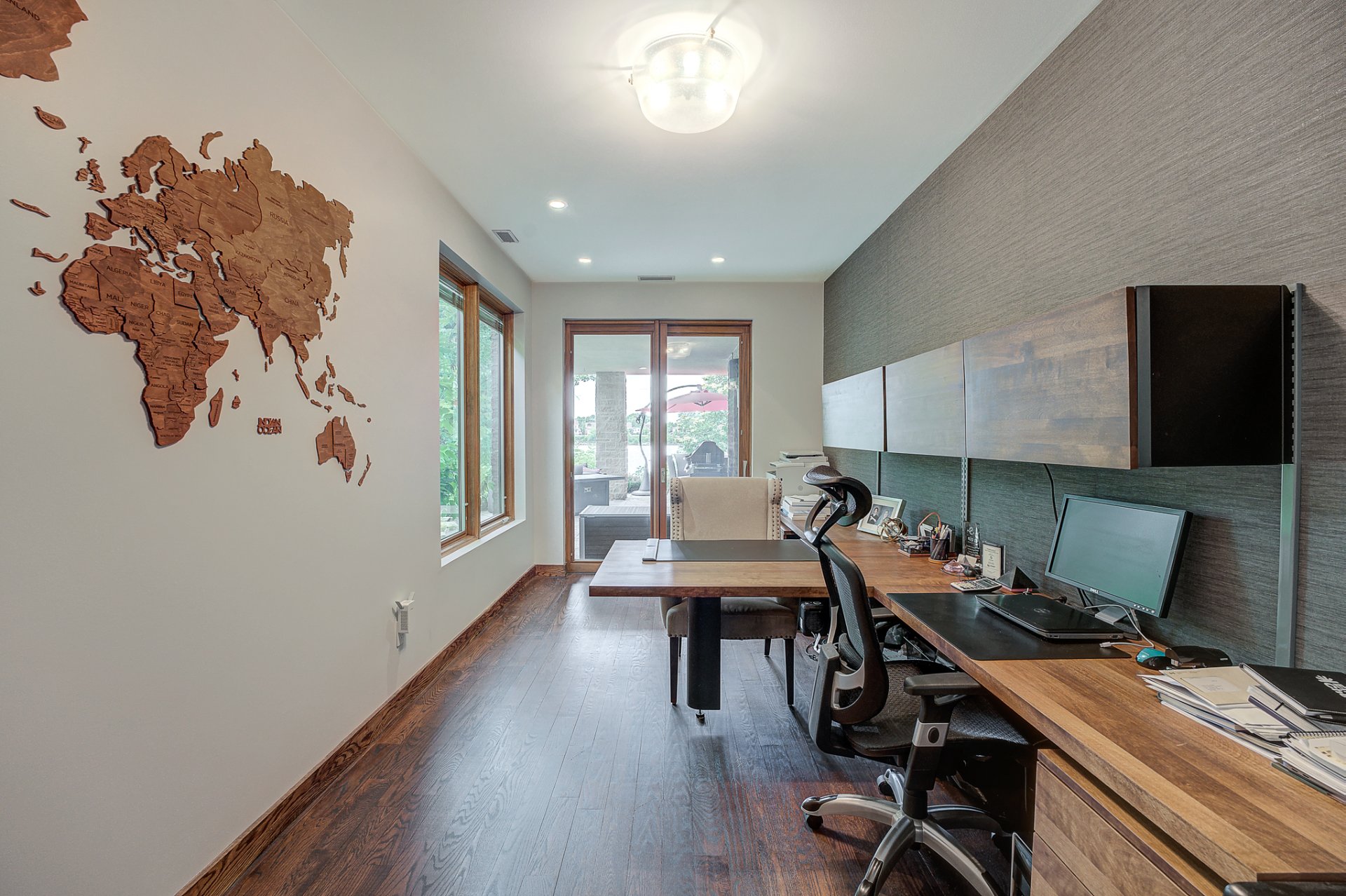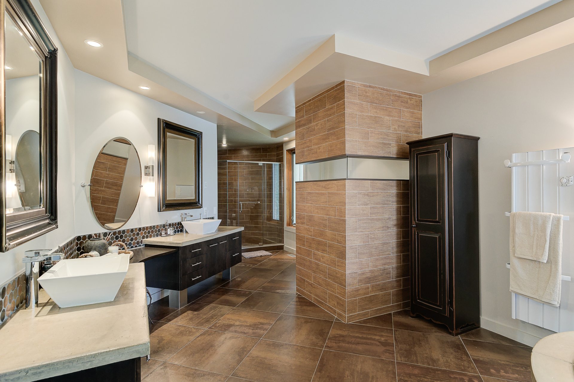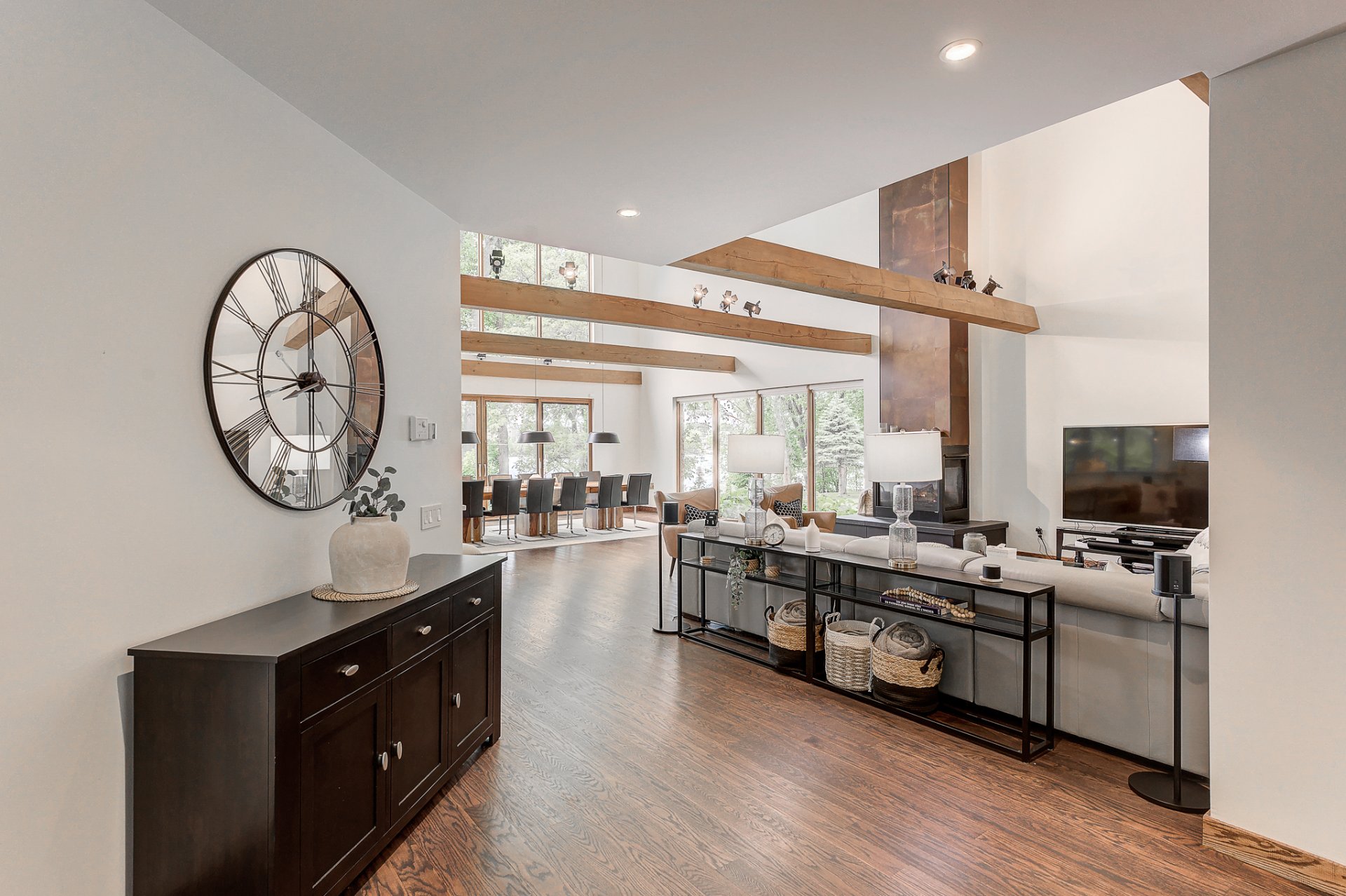 The main floor offers a feeling of grandeur with its cathedral ceiling and exposed beams. The open concept allows for easy flow between the large game room, the more formal living room, the large dining room that can accommodate several guests, and the kitchen with a central island, walk-in pantry, breakfast nook, and high-end appliances including a gas cooktop, two built-in ovens, and two dishwashers.