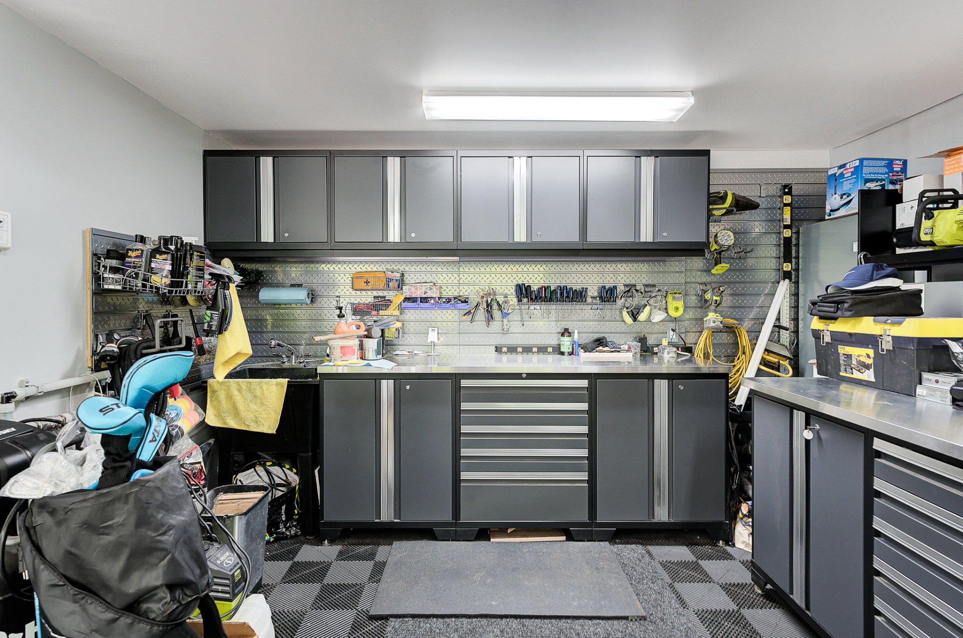 - washer, dryer, pool robot, metal shelving unit in garage, platform for seadoo.