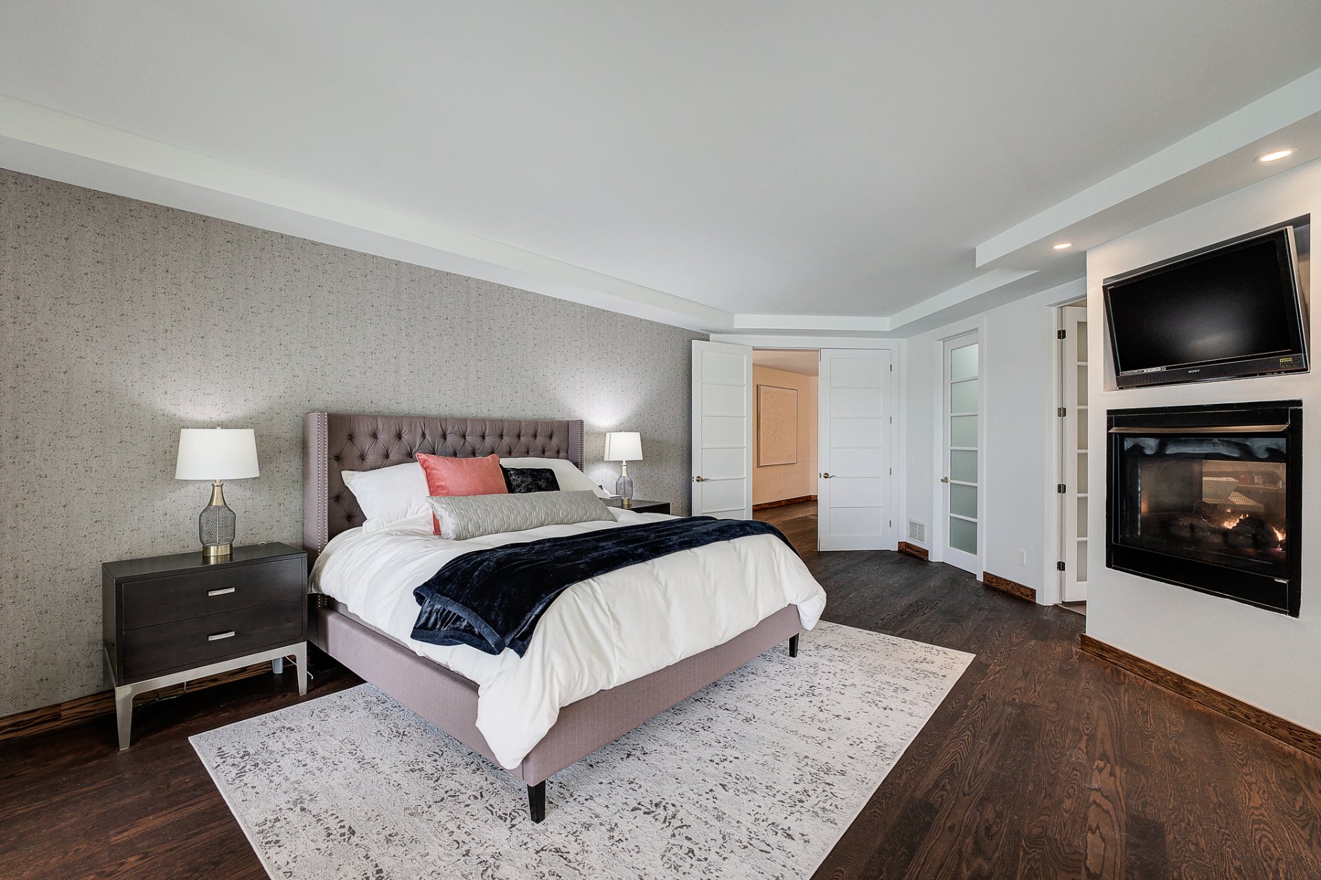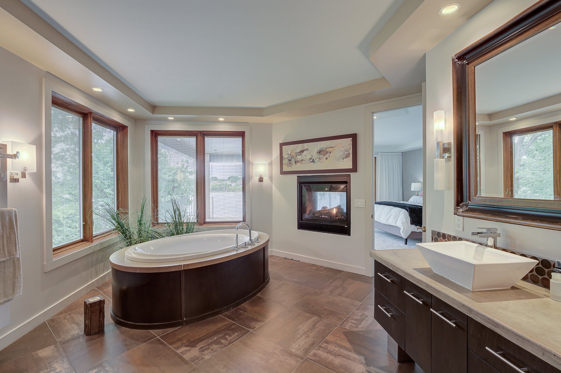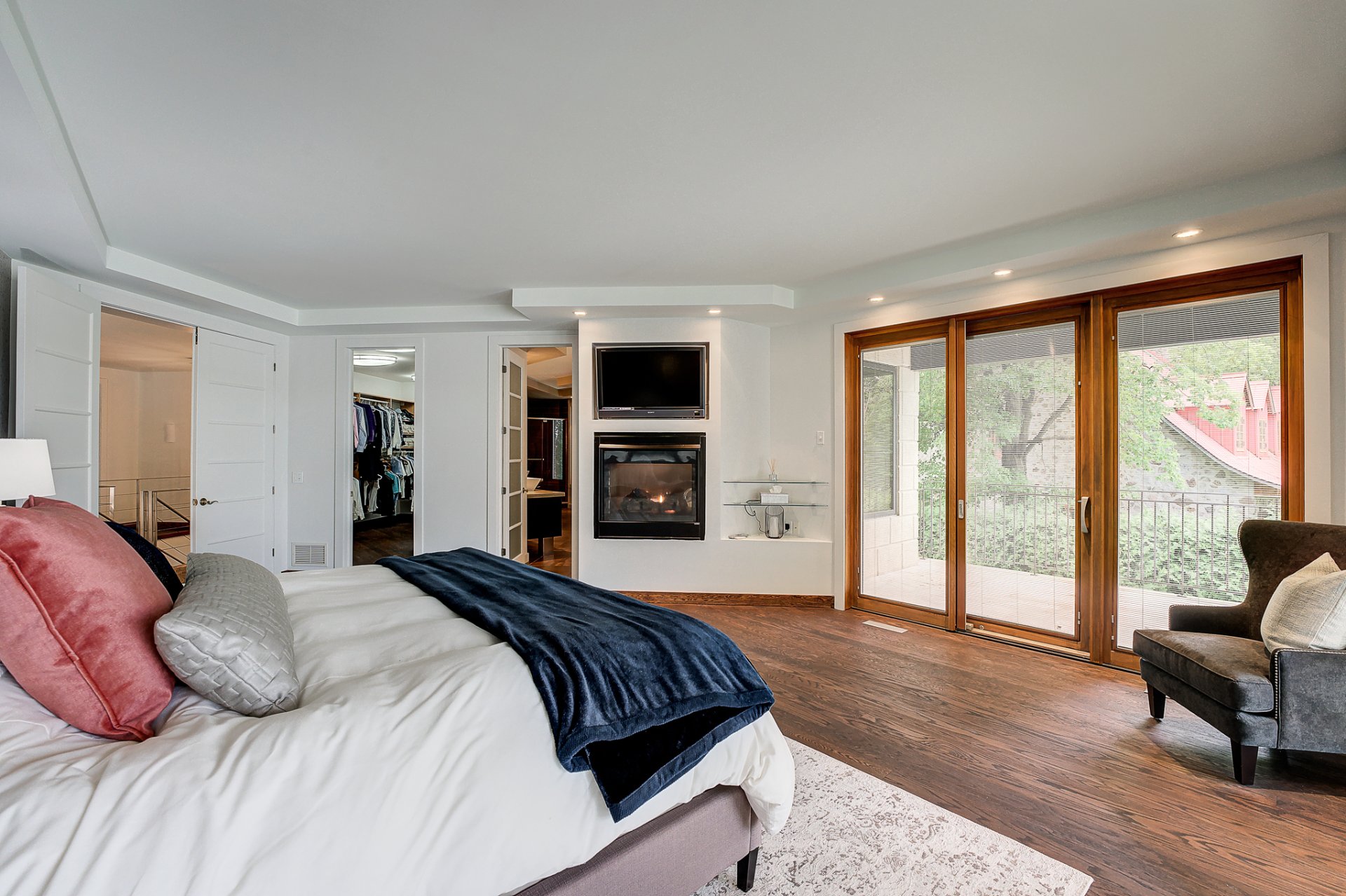In a private wing, the luxurious master suite features a balcony with river views. The two-sided gas fireplace invites relaxation. Adjoining it is a spacious walk-in closet and a stunning bathroom with a glass shower and whirlpool tub.