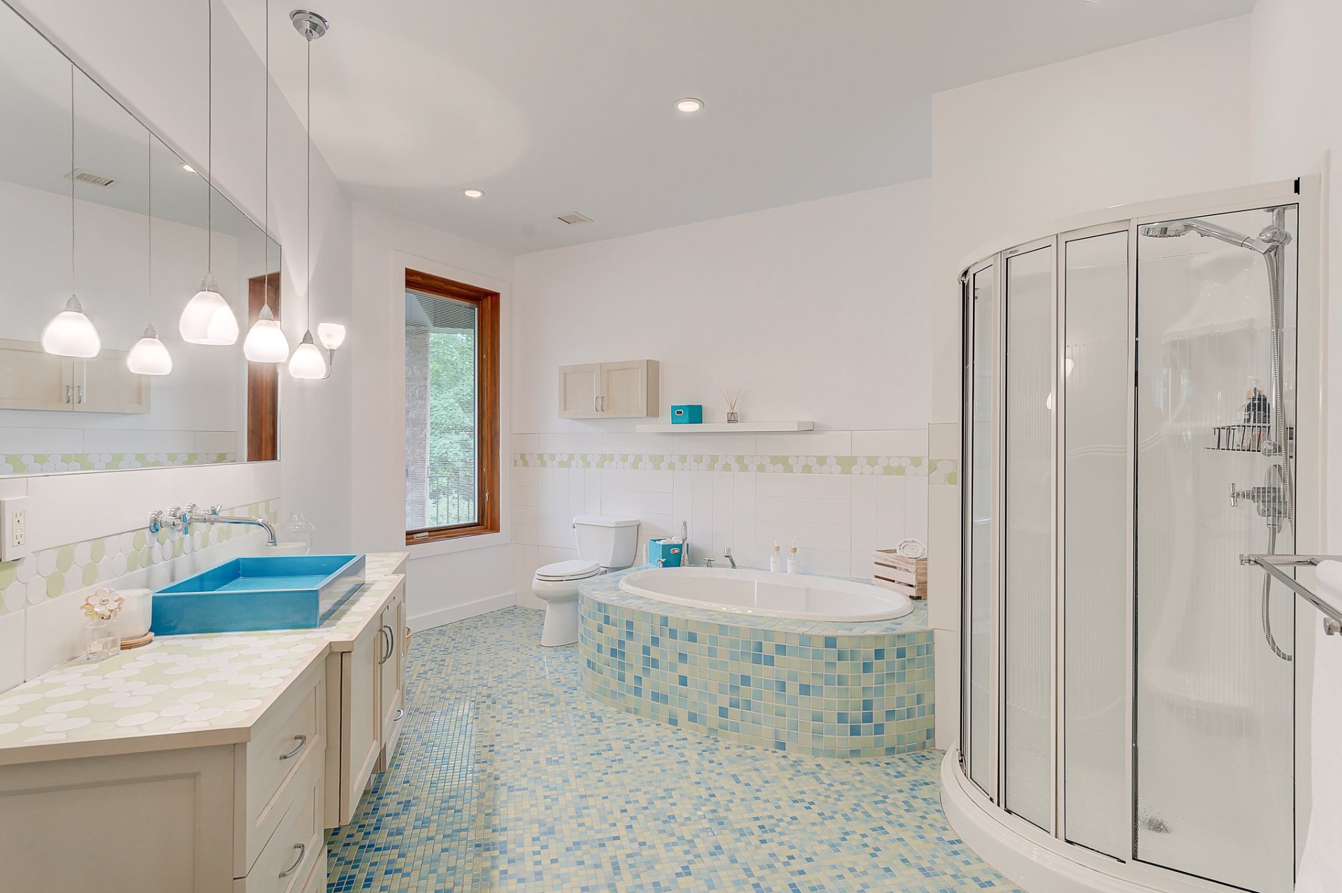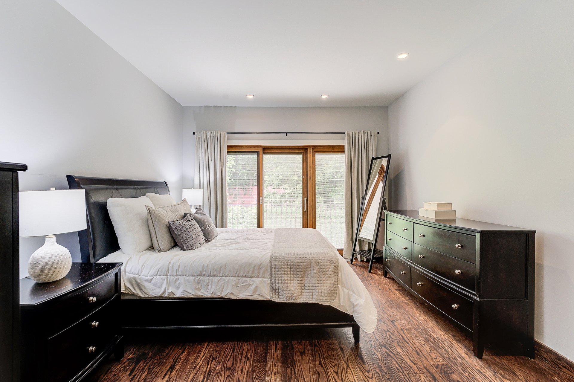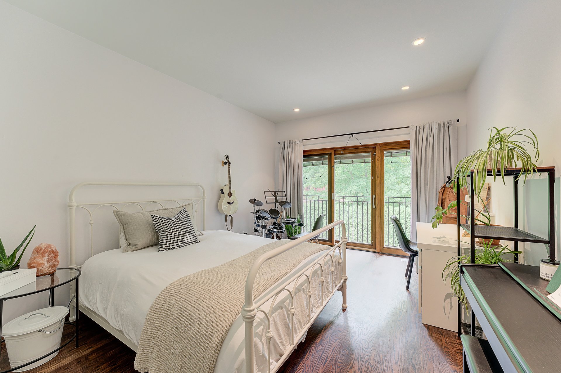In a private wing, the luxurious master suite features a balcony with river views. The two-sided gas fireplace invites relaxation. Adjoining it is a spacious walk-in closet and a stunning bathroom with a glass shower and whirlpool tub.