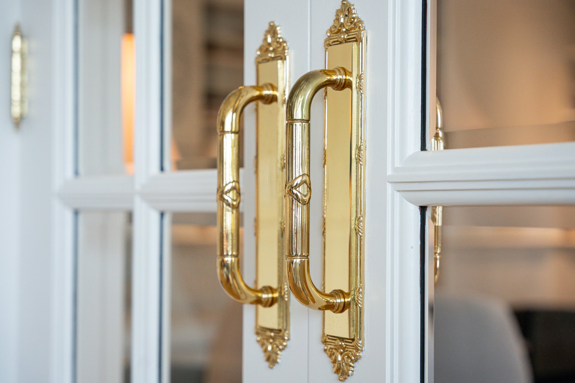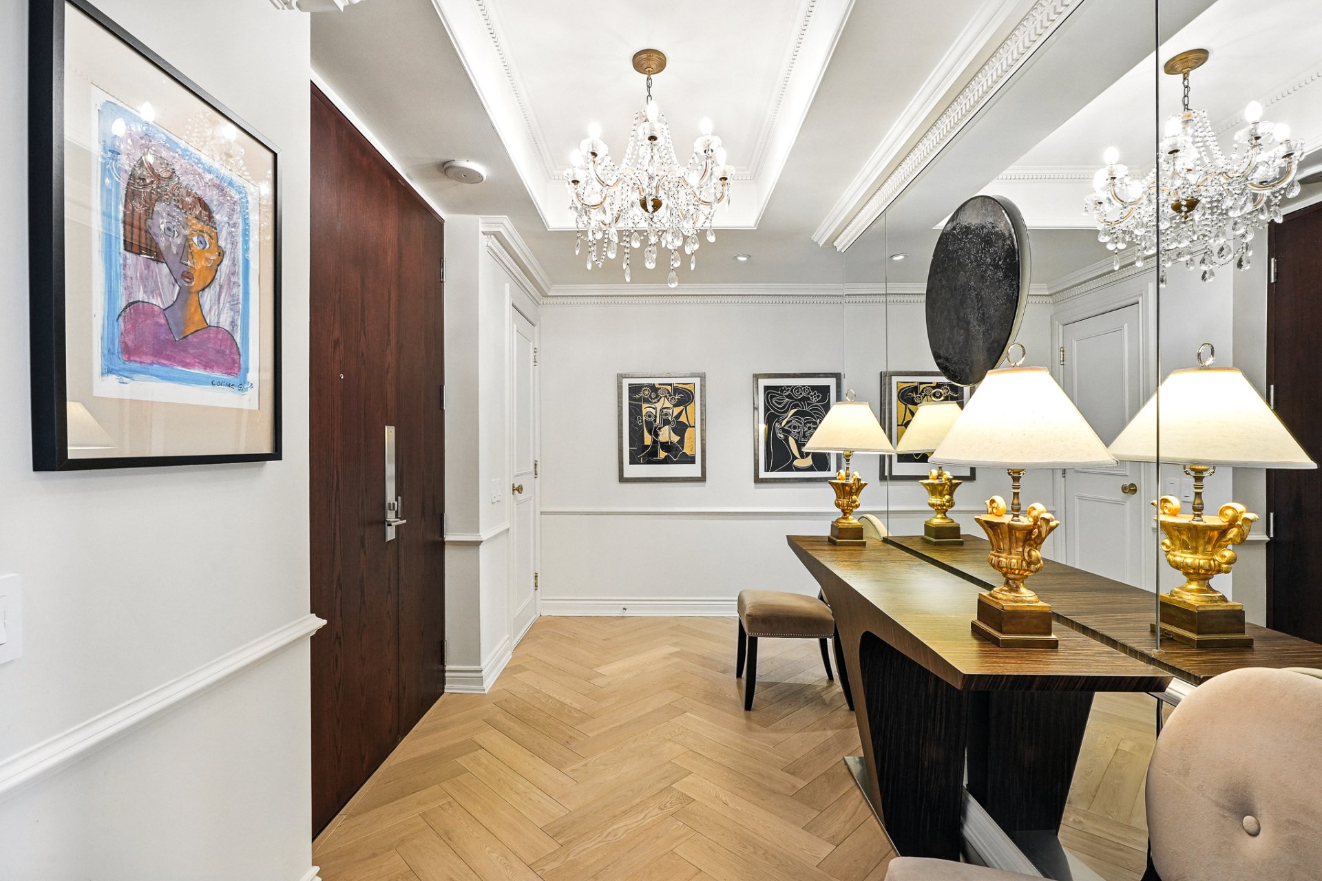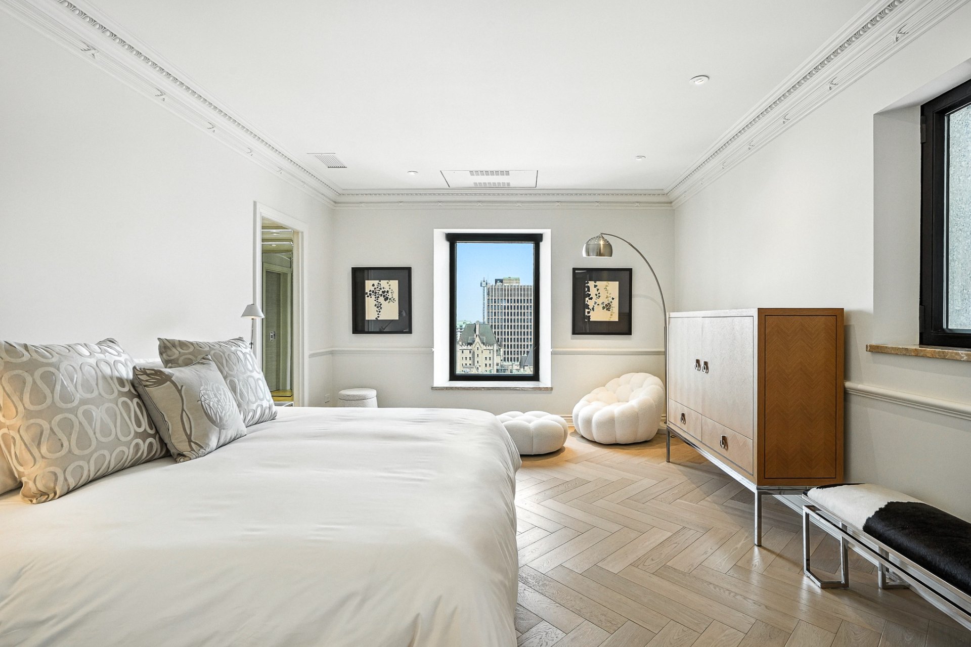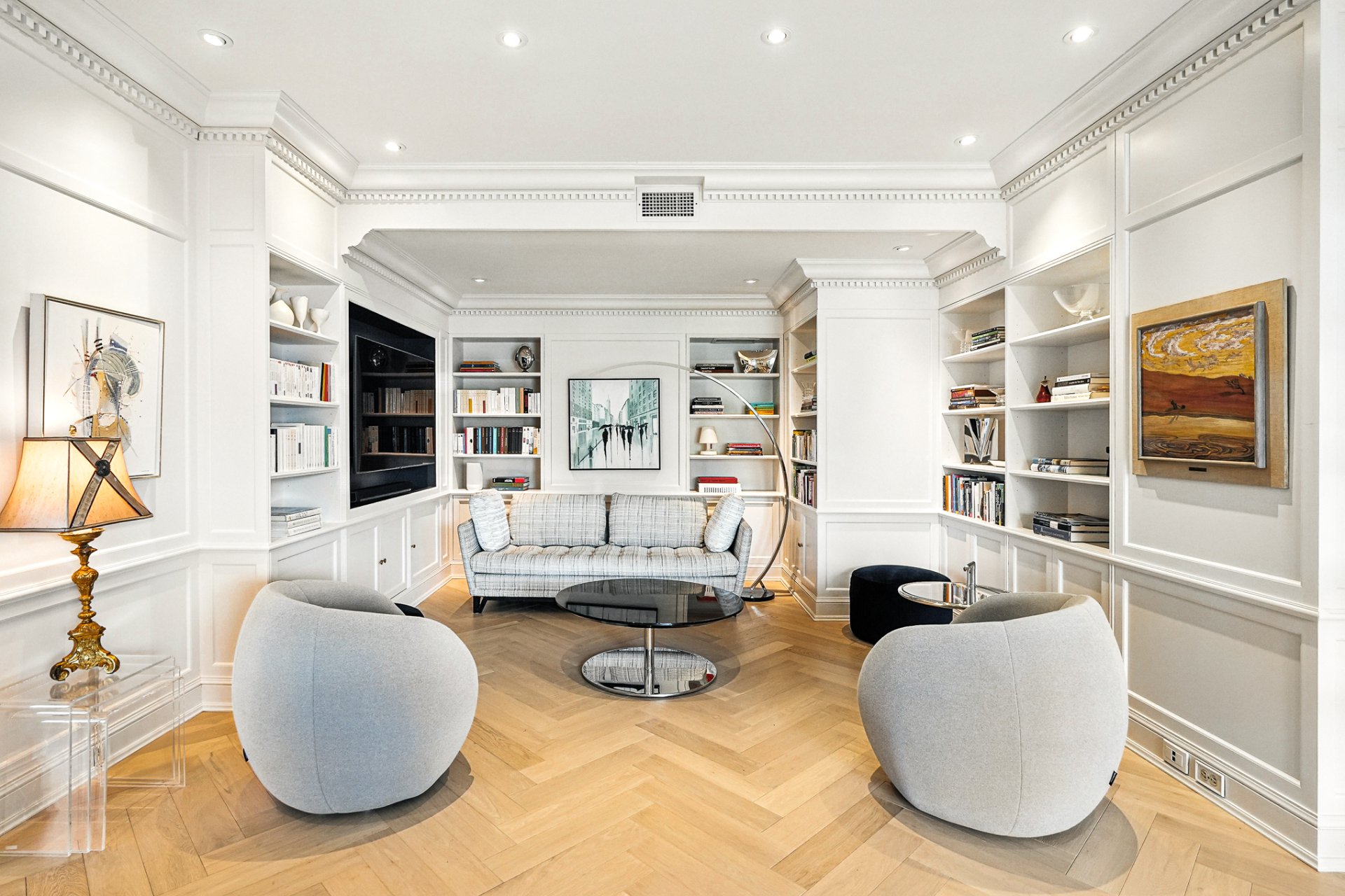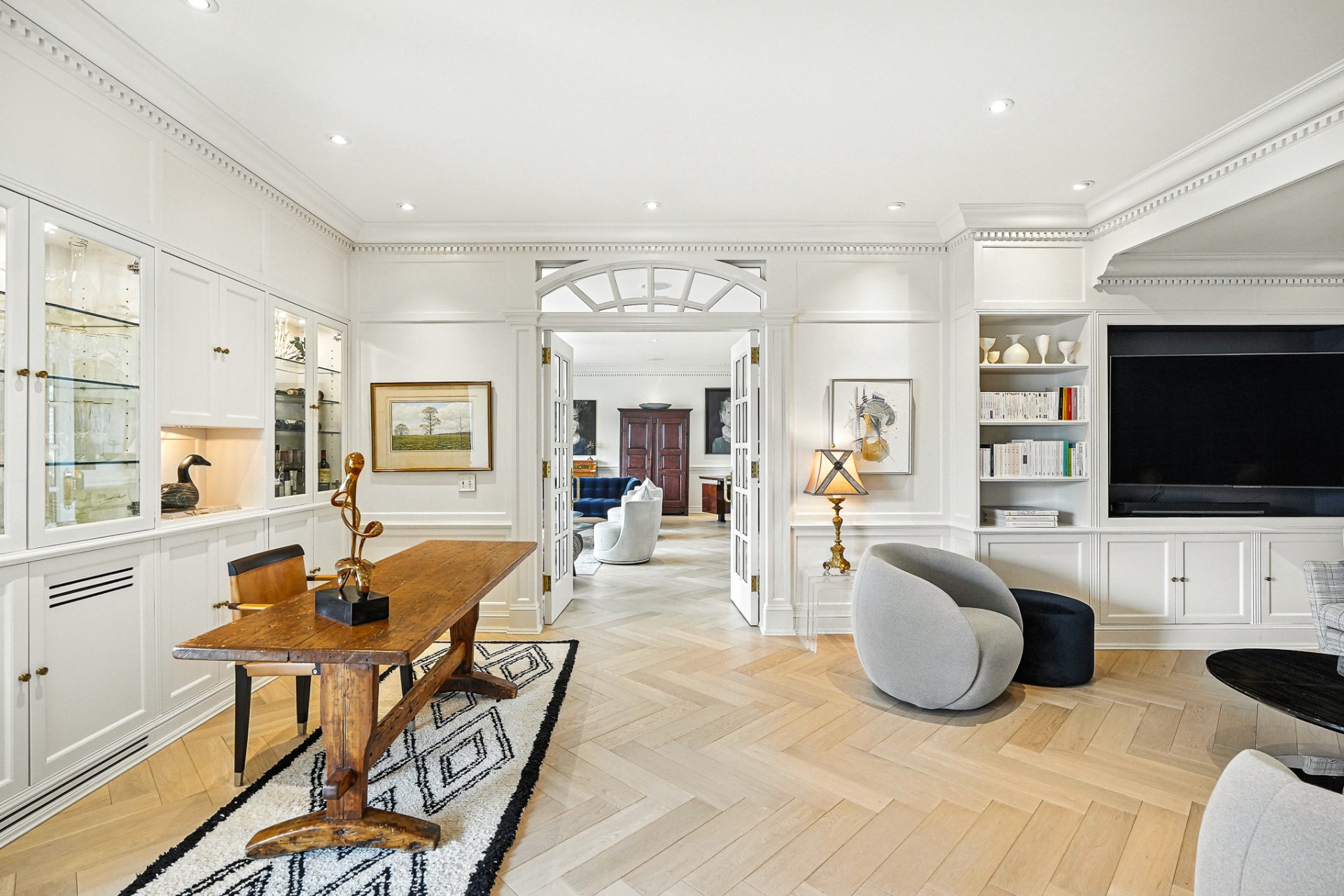 White Austrian oak floors laid in a herringbone pattern, high ceilings with finely crafted mouldings, built-in furniture, bright open concept living area, oversized windows, wall sconces and French doors: absolute refinement.