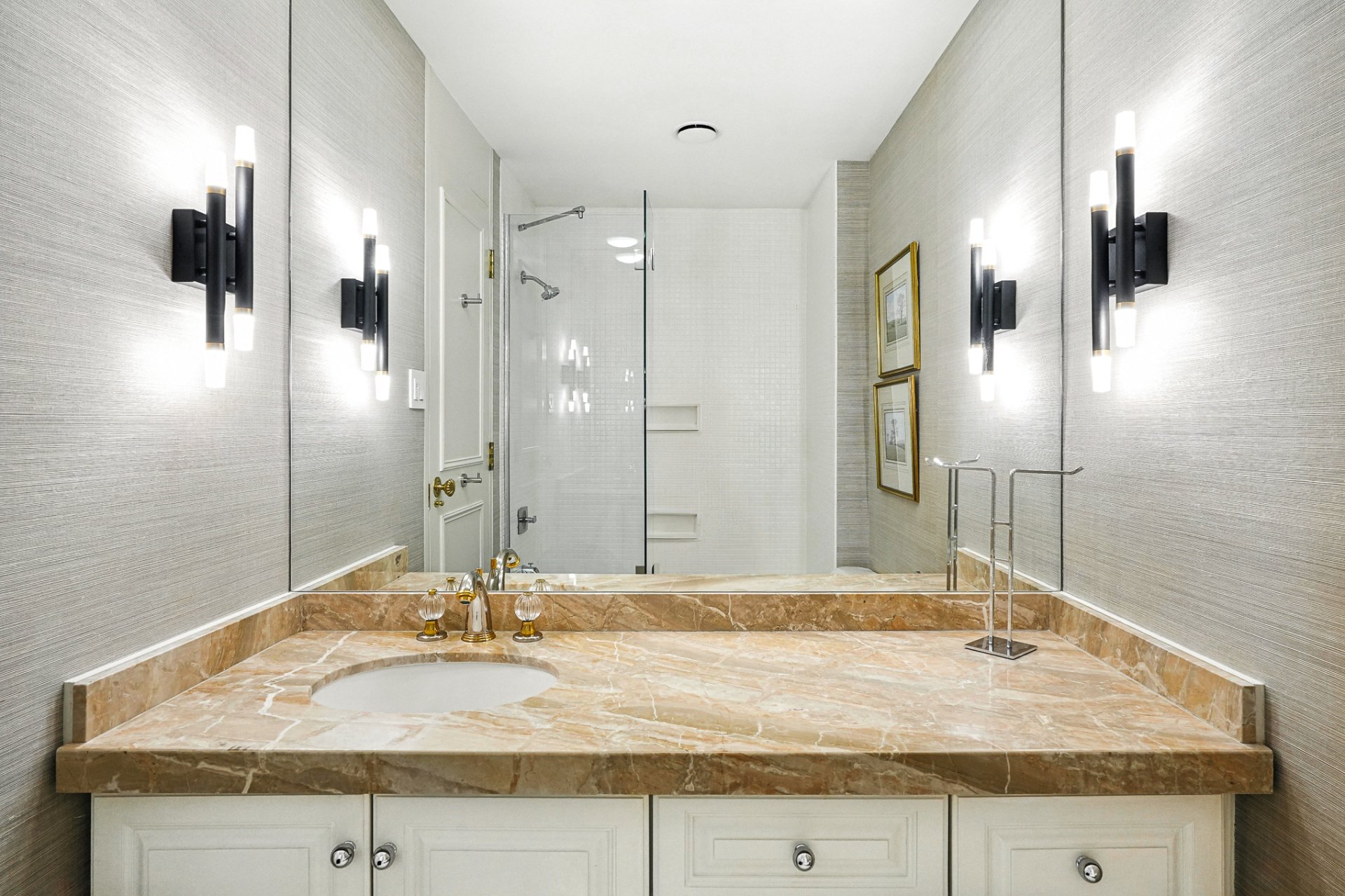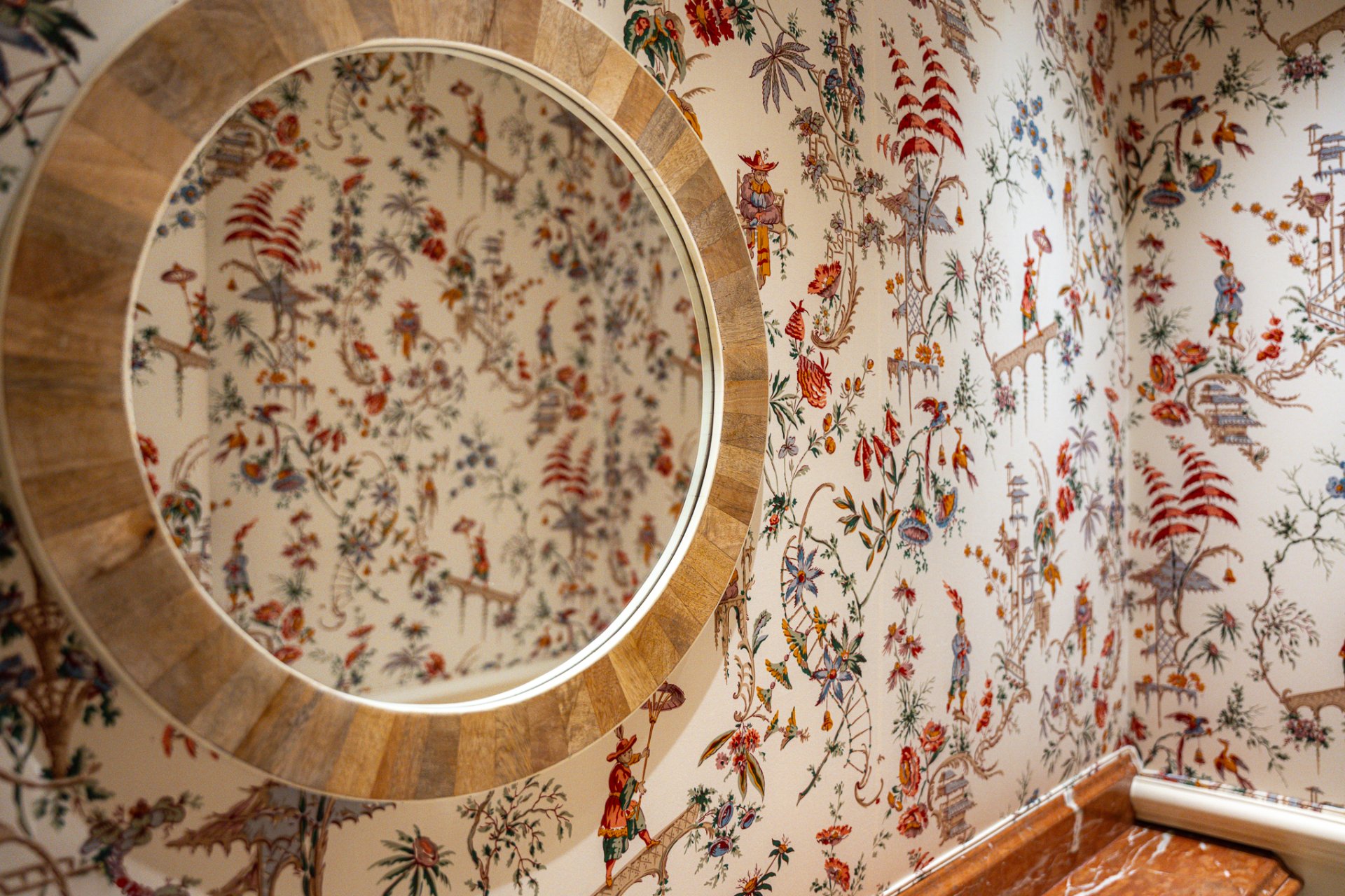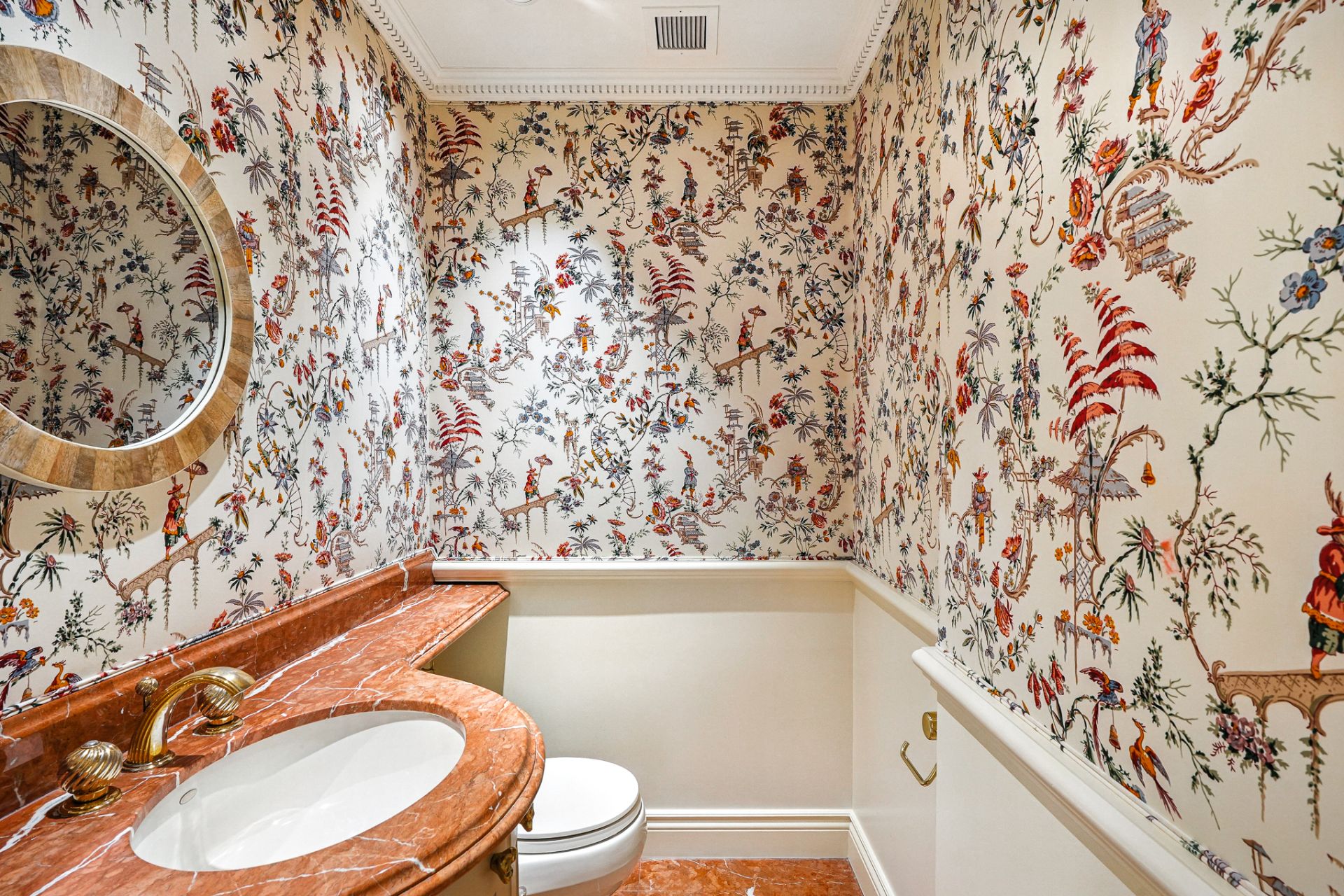 + Powder room with beautiful canvas wallpaper and red marble countertops
