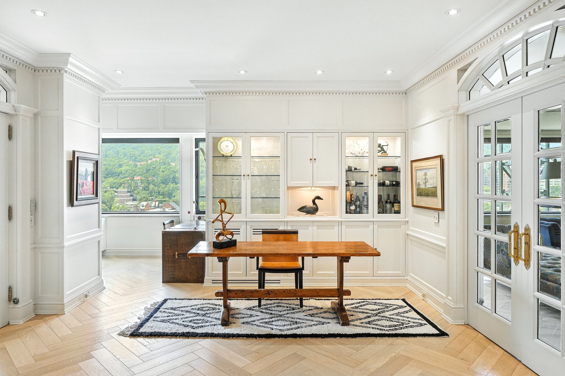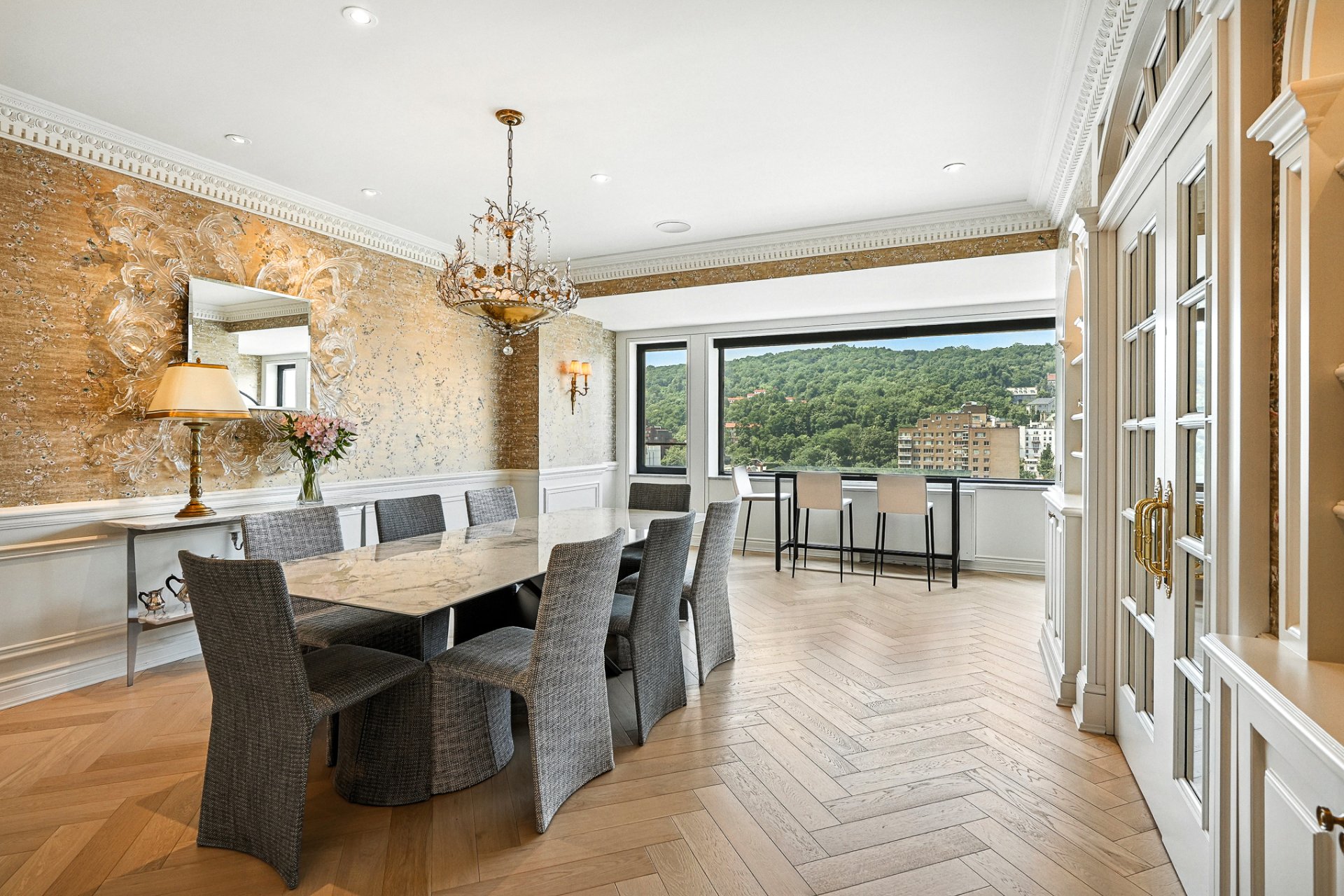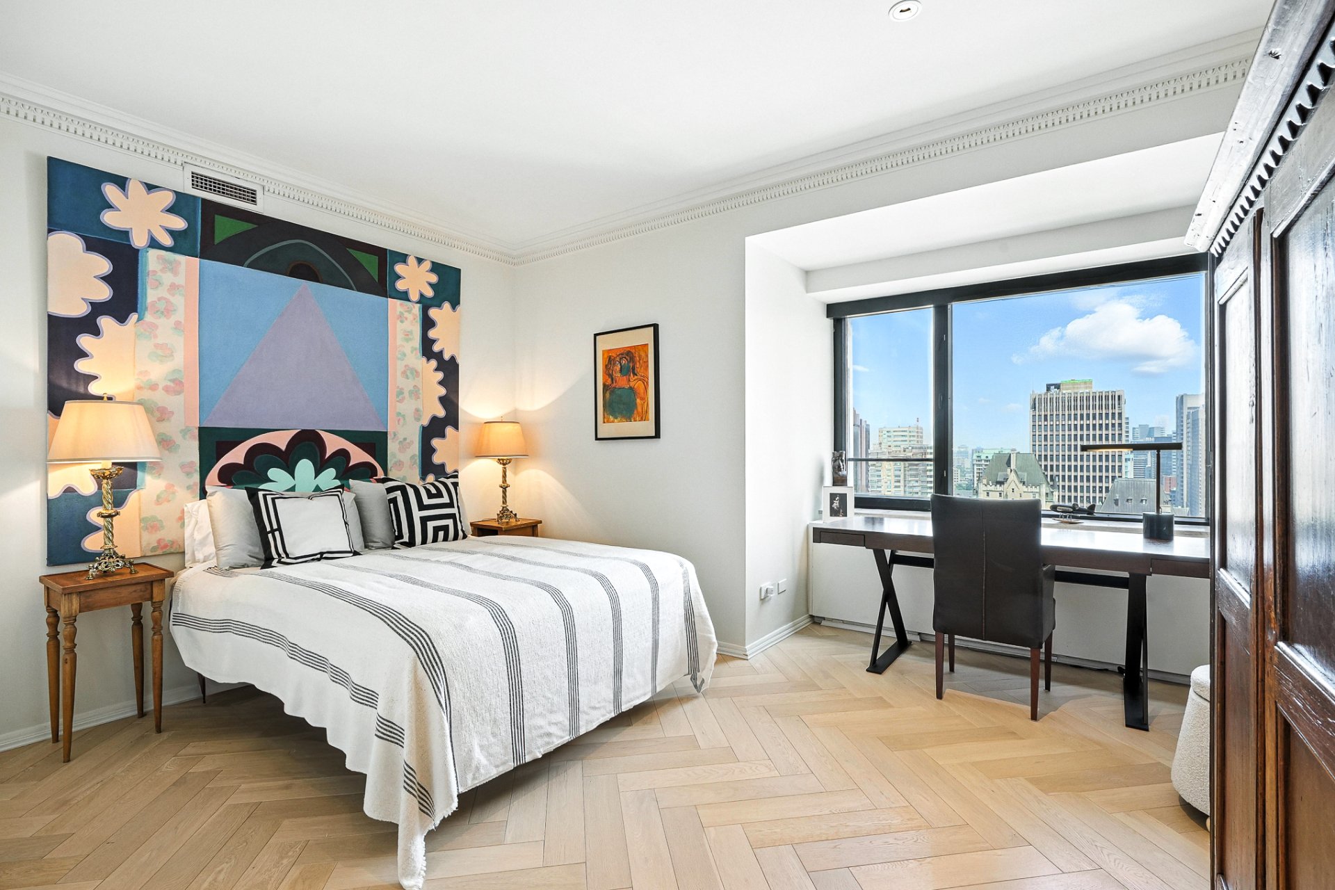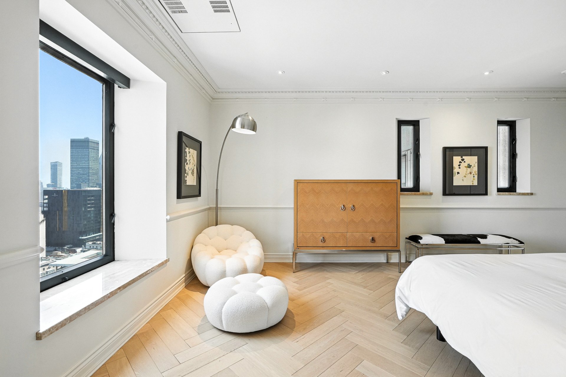 Located on the 18th floor of the Port-Royal building, in the heart of the prestigious Golden Square Mile, this Haussmann-style apartment combines classic refinement with spectacular panoramic views. Enfilade living rooms, sculpted mouldings, herringbone floors, red marble and luxurious tapestries evoke the charm of Versailles. The oversized windows offer breathtaking views of Mount Royal and the city lights. With the finest elegance, every detail reflects timeless sophistication. The Port-Royal: a renowned luxury building with 5-star hotel-style services, located near great restaurants, museums and Universities.