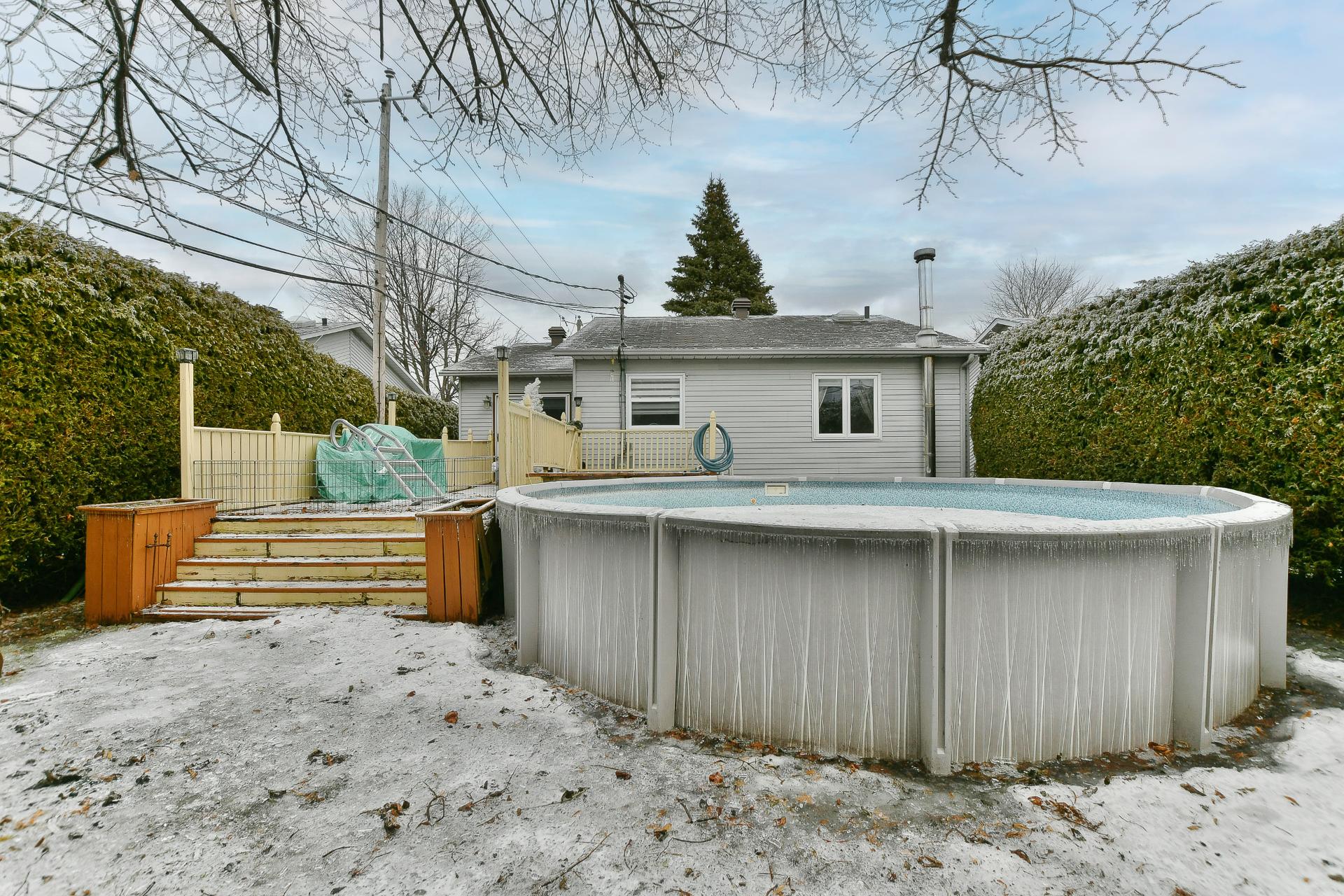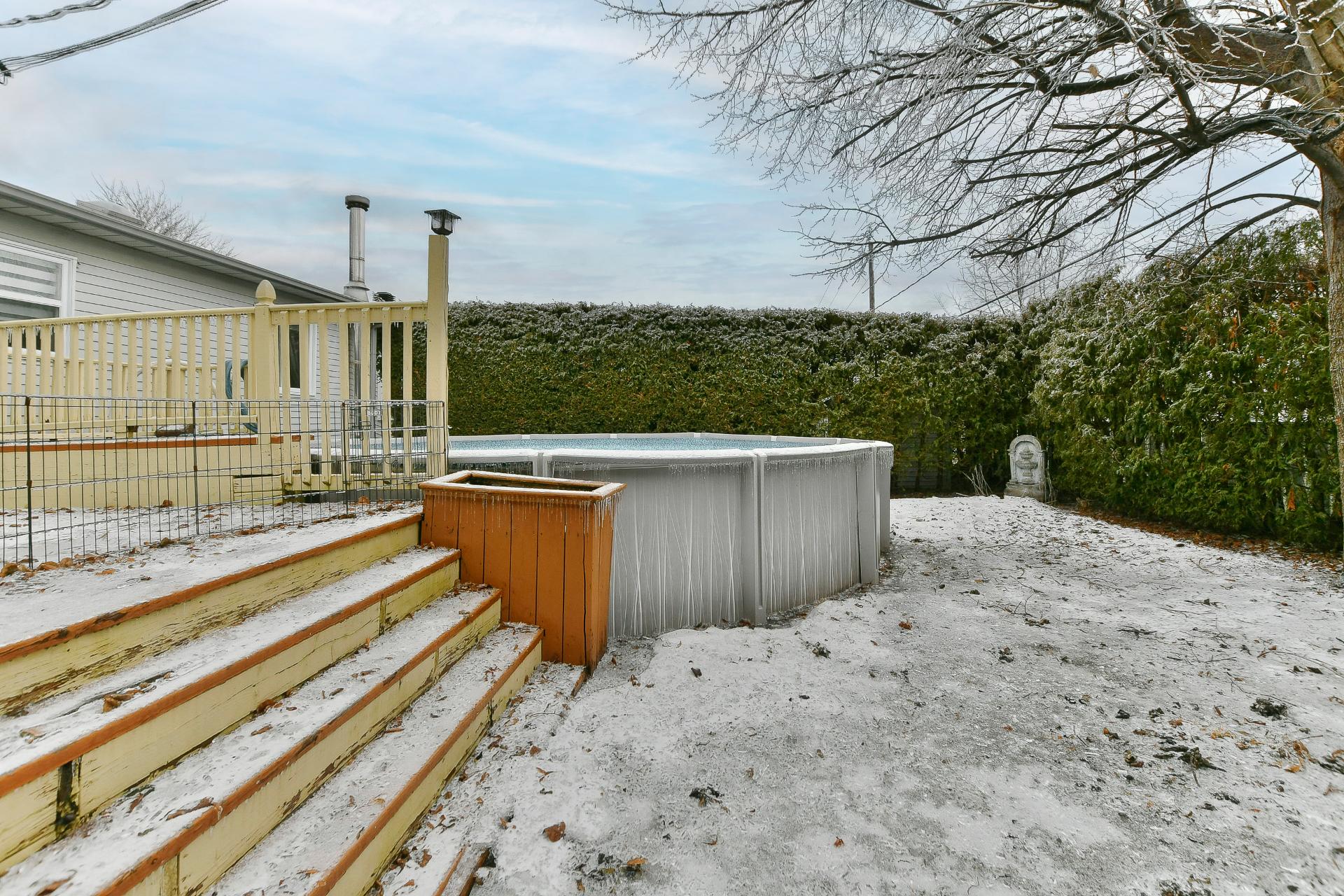 Outside, the landscaped backyard includes an above-ground pool, ideal for enjoying the summer months in a pleasant and private setting.
