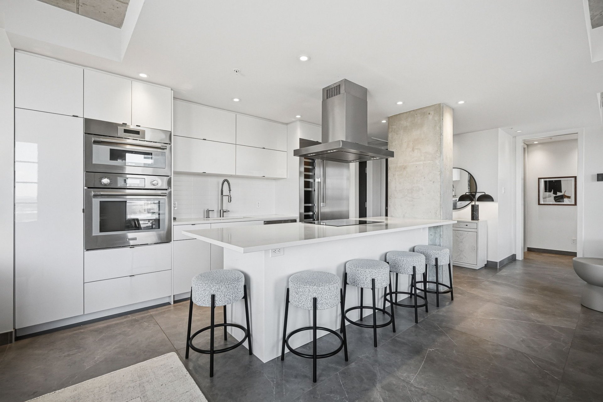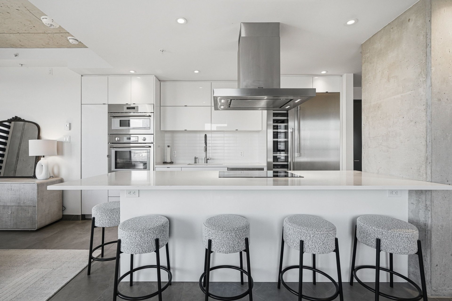 * Custom kitchen with sleek lines, premium materials, and a full suite of high-end Thermador appliances, including induction cooktop and wine fridge