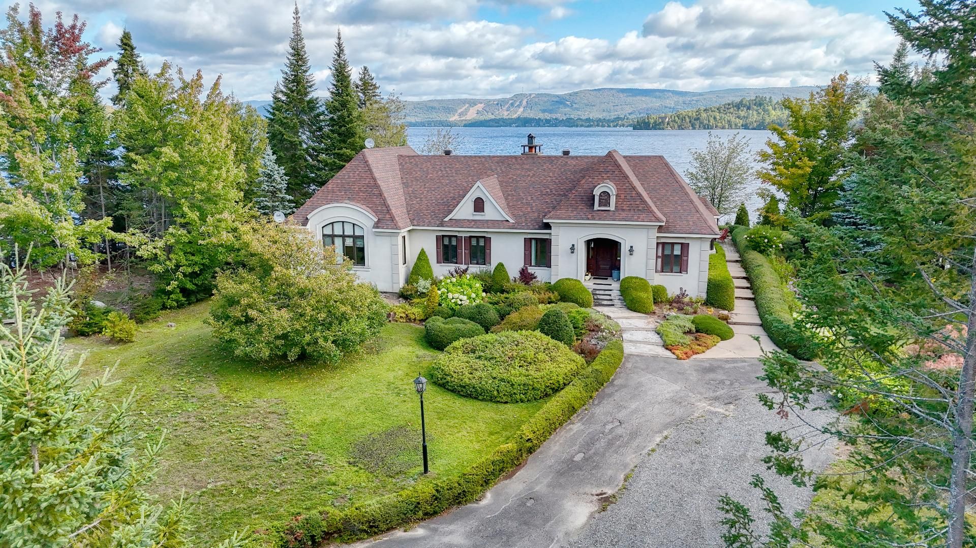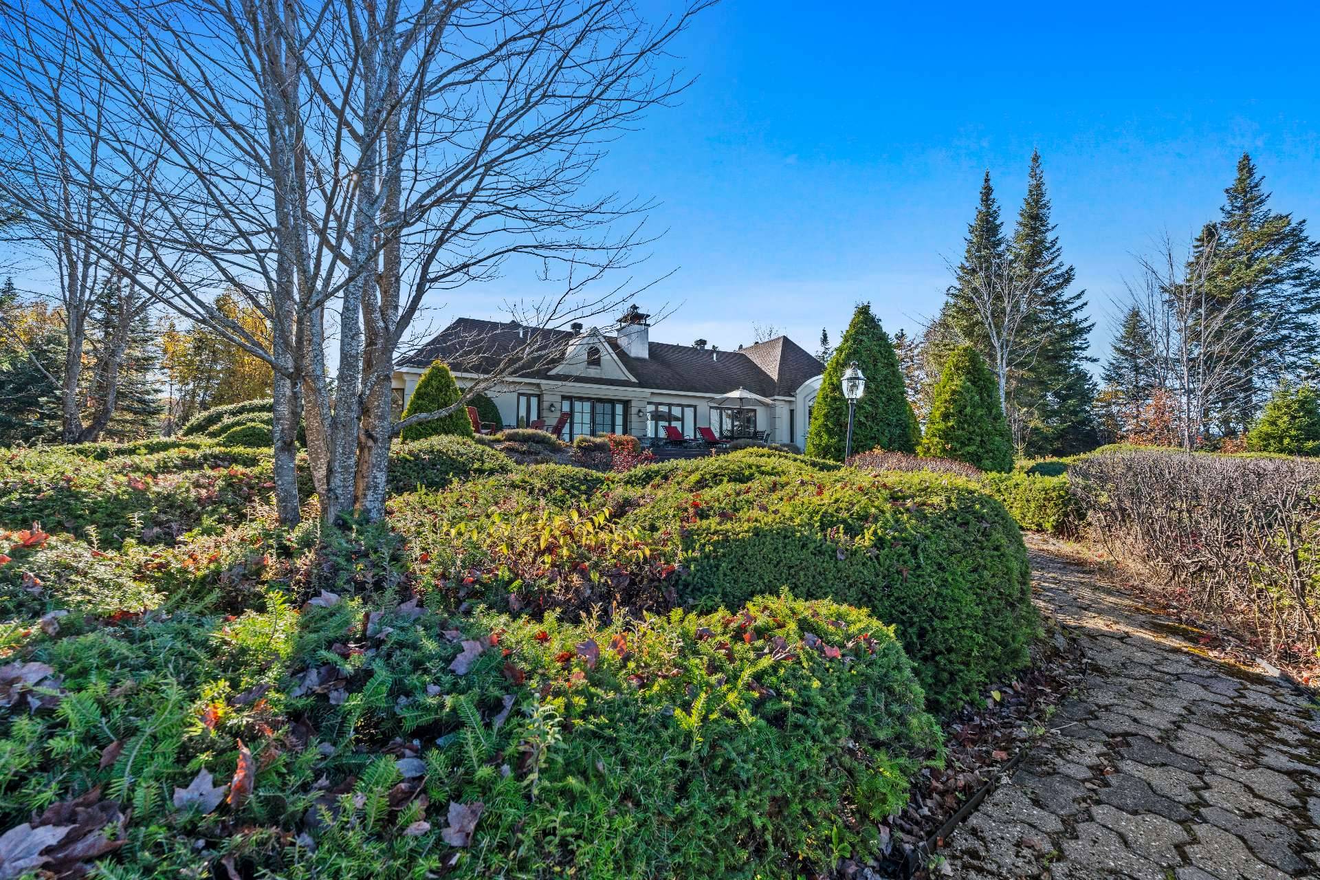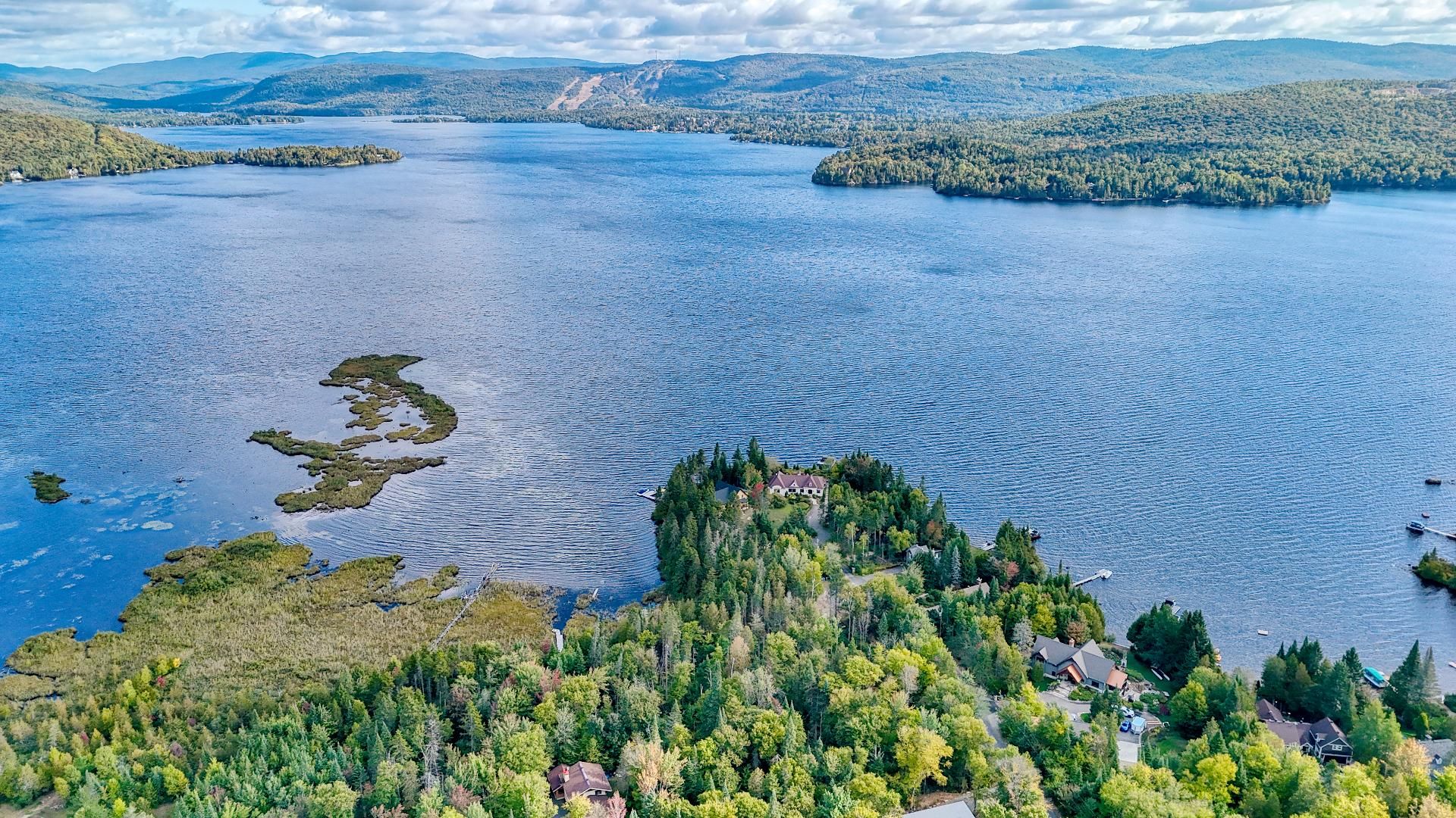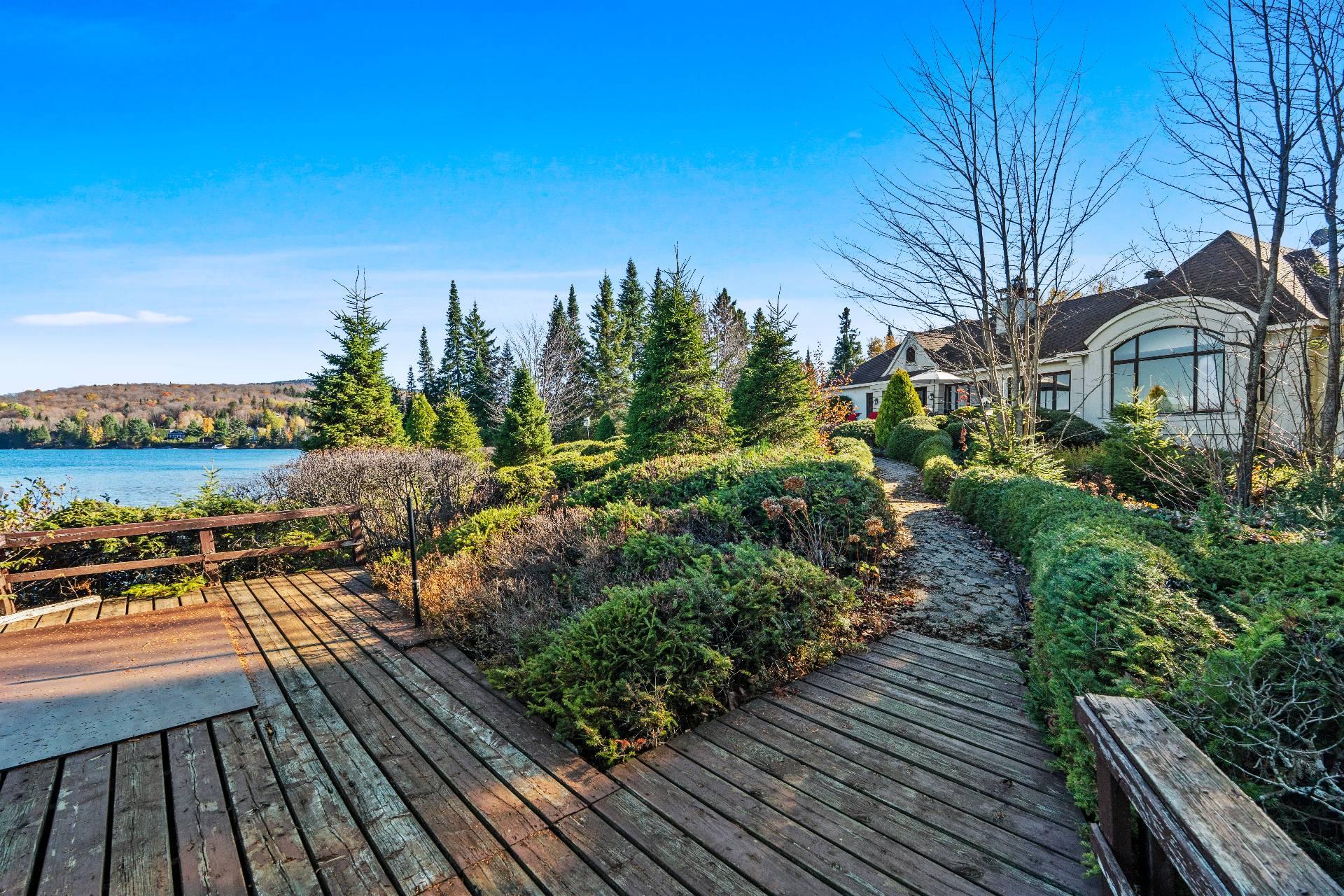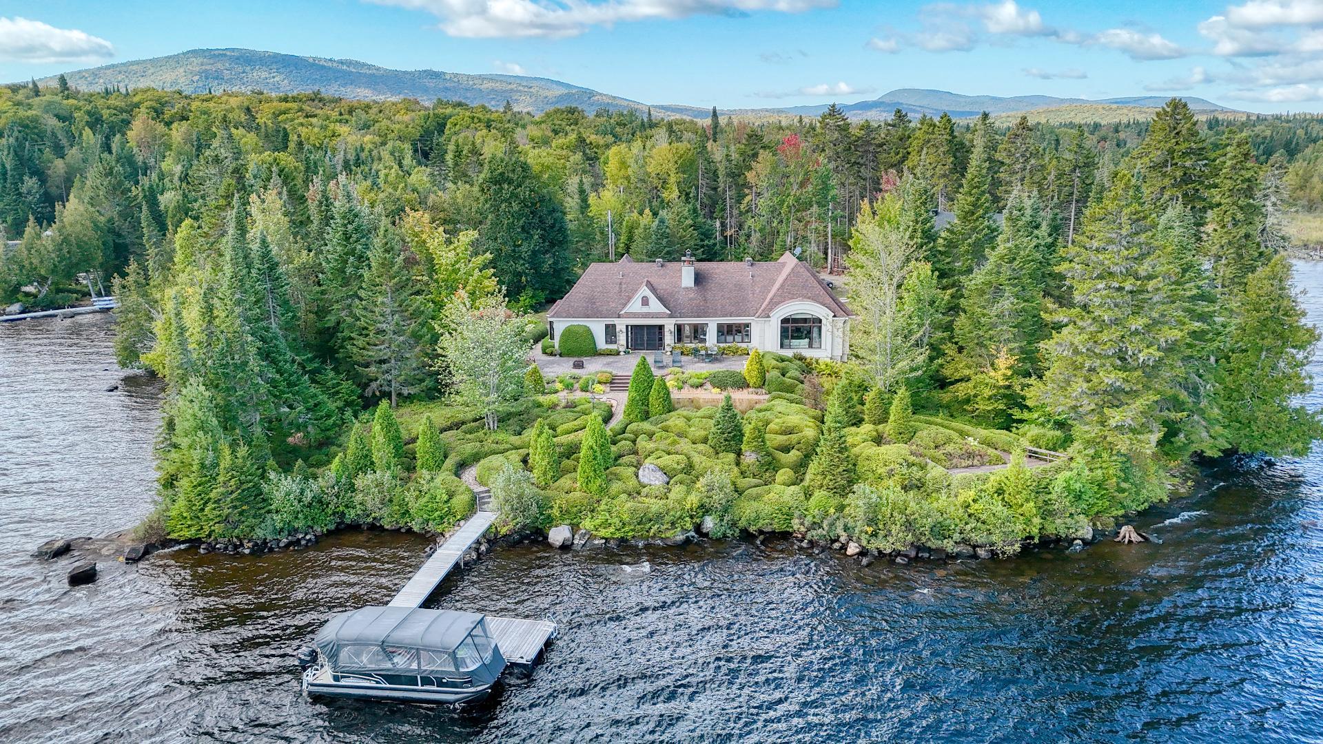 Nestled on a private peninsula on Lac Archambault, this exceptional residence spans over 58,500 sq. ft. of flat land and enjoys 455 linear feet of waterfront. Meticulously renovated in 2009, it offers 2,733 sq. ft. of living space, including 3 bedrooms, 2 bathrooms, and sun-filled living areas. The panoramic view of the mountains and Mont Garceau lends each room a unique atmosphere. Manicured gardens, a spacious terrace, and a private dock complete this rare setting, where nature, prestige, and serenity blend in perfect harmony.