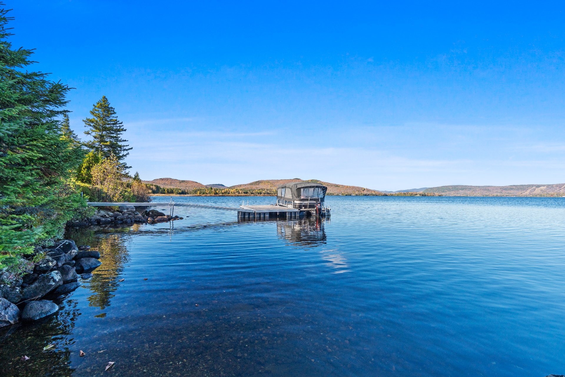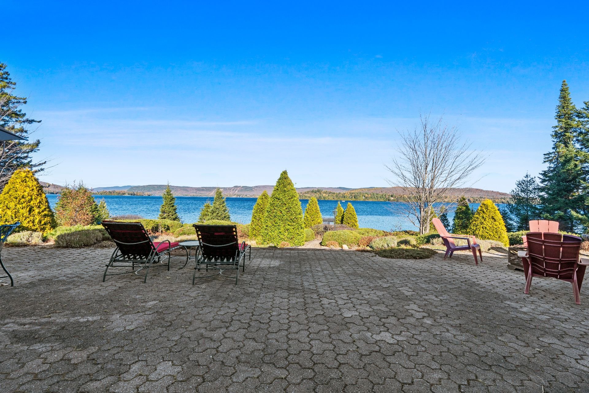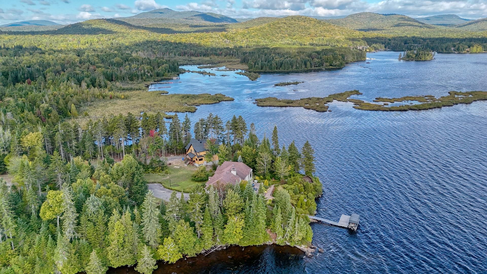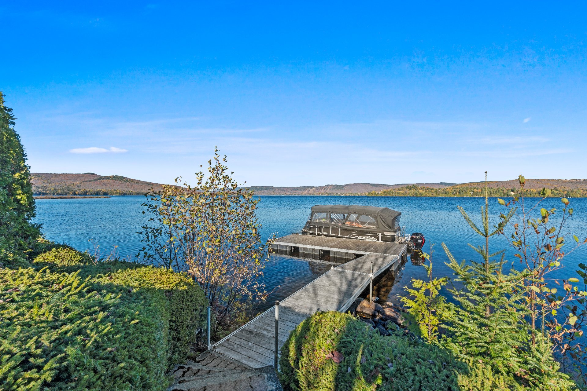 Nestled on a private peninsula on Lac Archambault, this exceptional residence spans over 58,500 sq. ft. of flat land and enjoys 455 linear feet of waterfront. Meticulously renovated in 2009, it offers 2,733 sq. ft. of living space, including 3 bedrooms, 2 bathrooms, and sun-filled living areas. The panoramic view of the mountains and Mont Garceau lends each room a unique atmosphere. Manicured gardens, a spacious terrace, and a private dock complete this rare setting, where nature, prestige, and serenity blend in perfect harmony.
