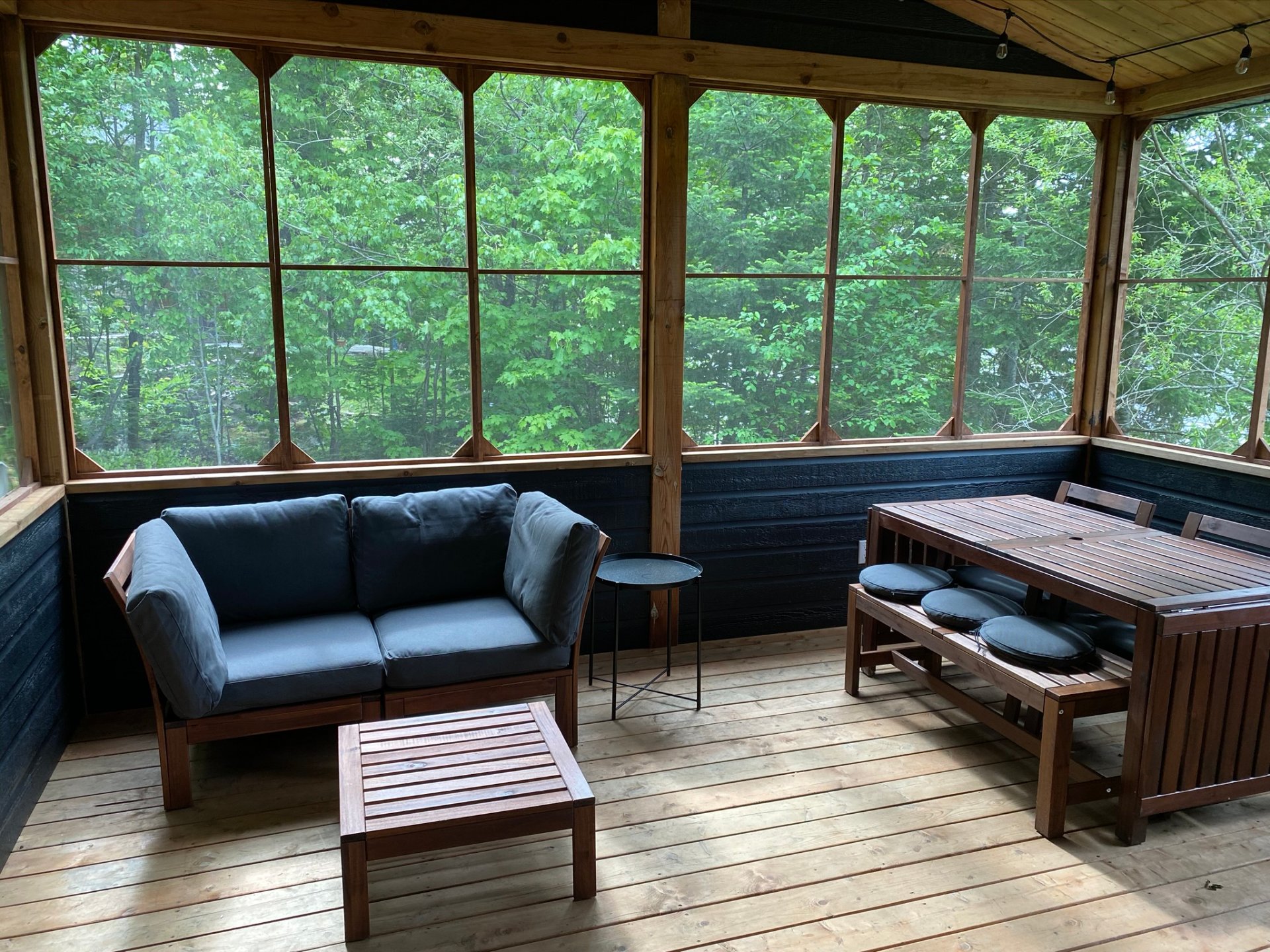 - Furniture in the primary bedroom, round table and two outdoor chairs (sunroom/veranda), four grey outdoor chairs, and personal belongings.